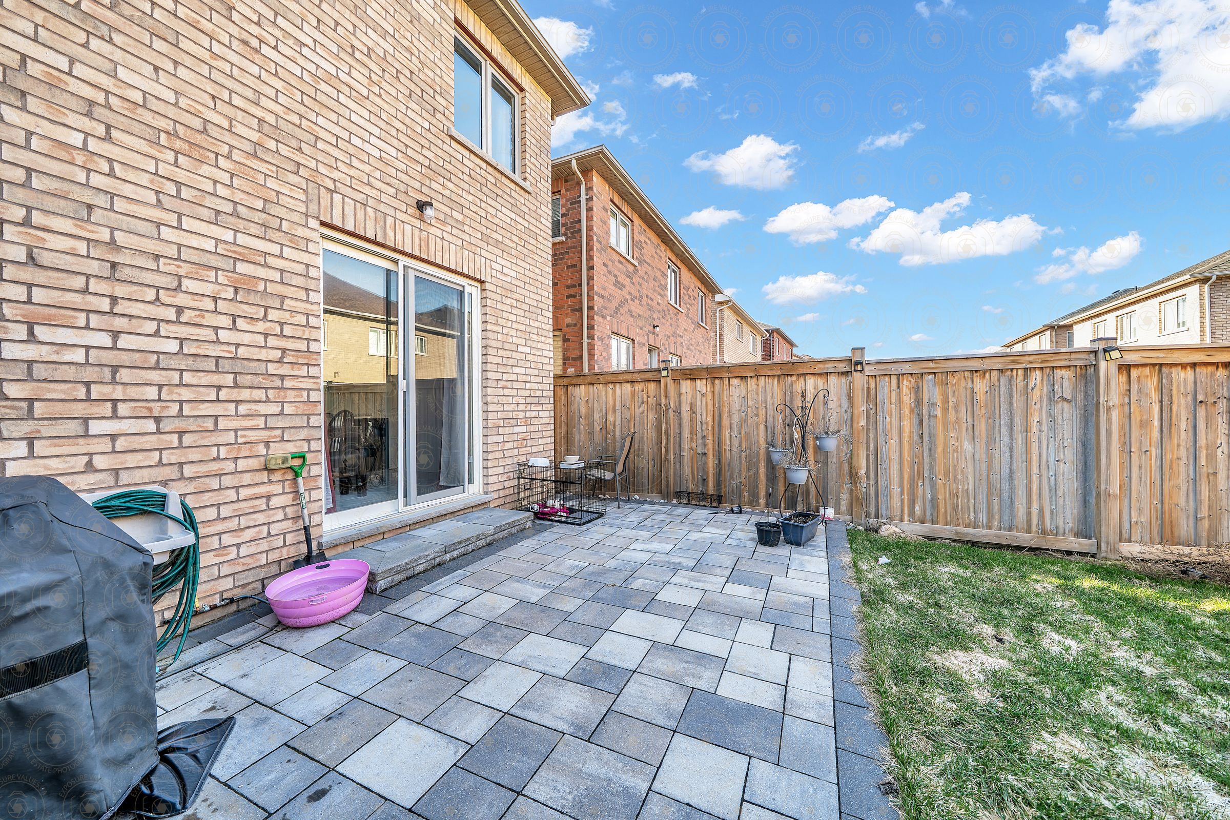 • Charming backyard with stone finished patio and gazebo for relaxation.