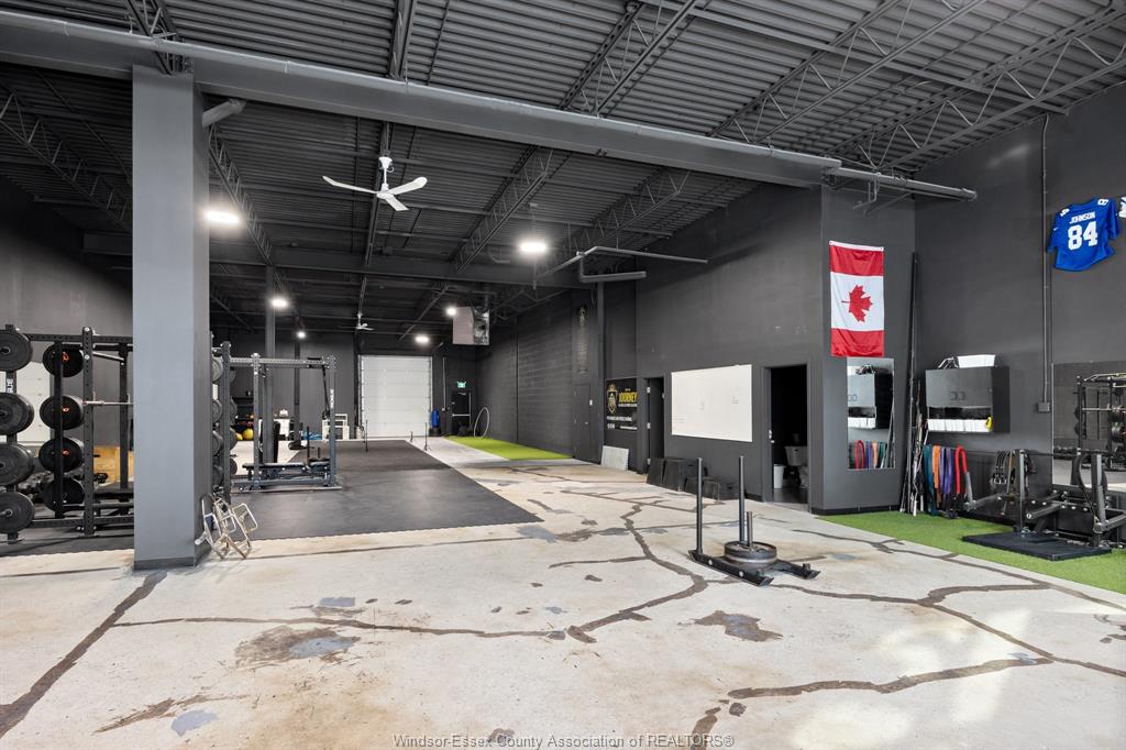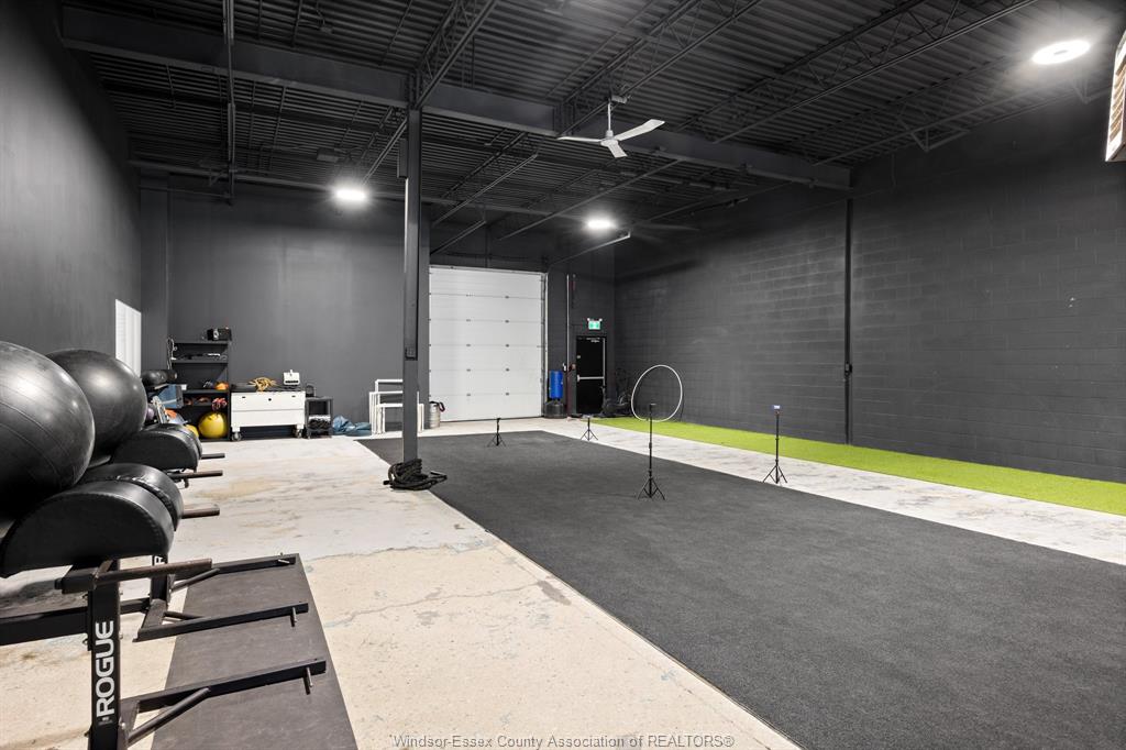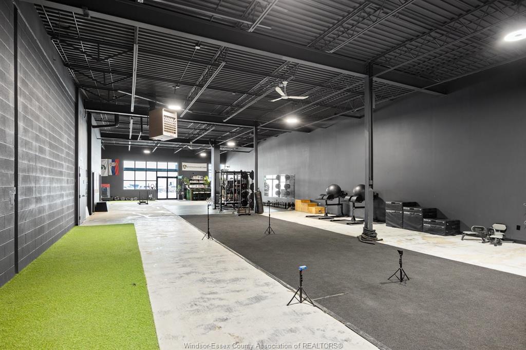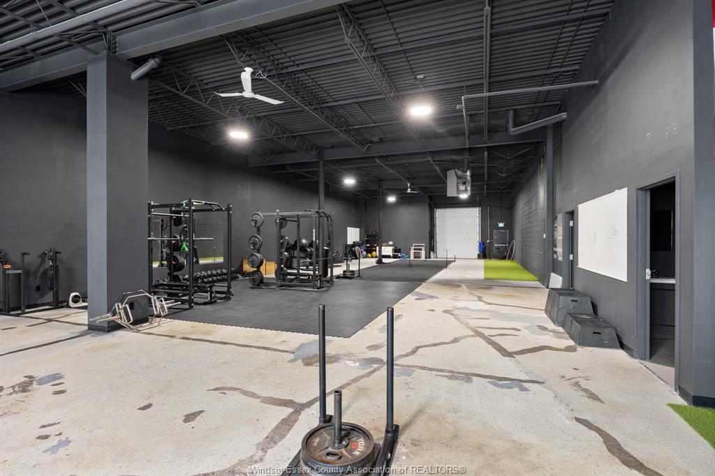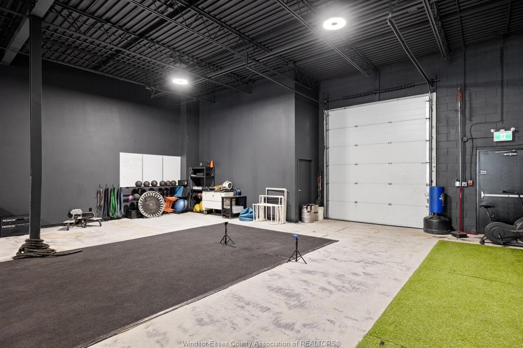 Modern and clean warehouse/flex space available in an excellent central location with easy access to the expressway. The 4,032 sq ft unit offers 16 ft clear height and one grade-level overhead door. Two new washrooms. Walls and ceiling are painted black with modern lighting throughout. Currently built out for a fitness-related use. Flexible zoning allows for a wide range of potential uses. See the docs section for the floor plan. Landlord is willing to add tenant improvements. Call us with your requirements. Cams for 2026 are budgeted at $3. 15 per sq ft and include water.