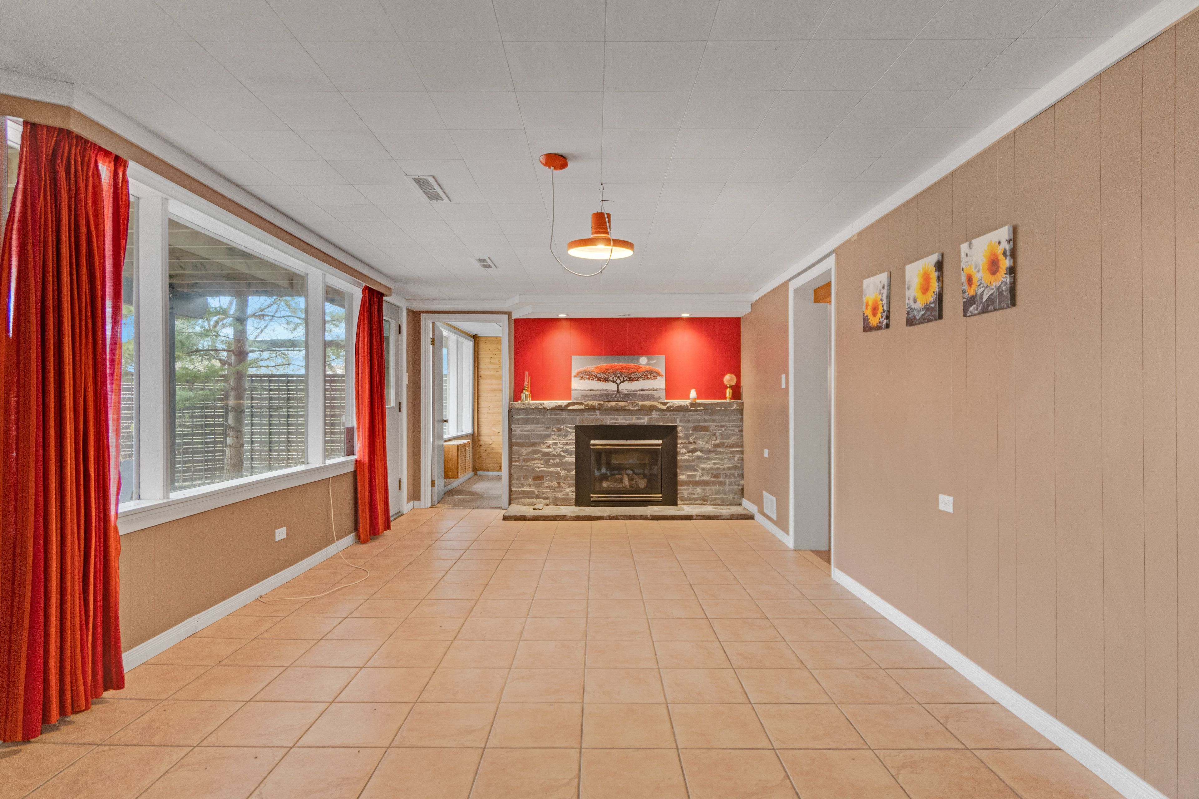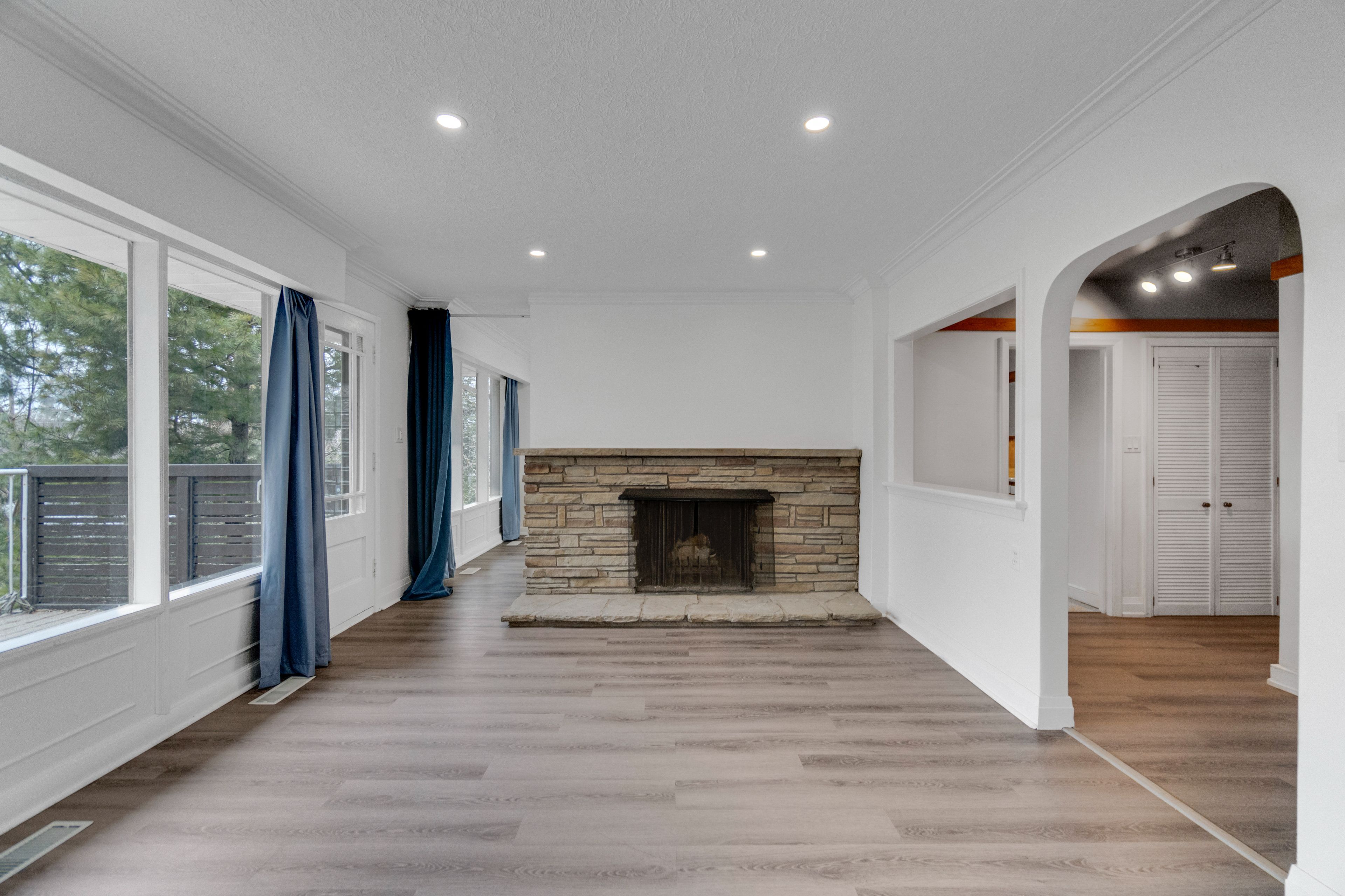 • Living room includes a striking stone wood-burning fireplace.