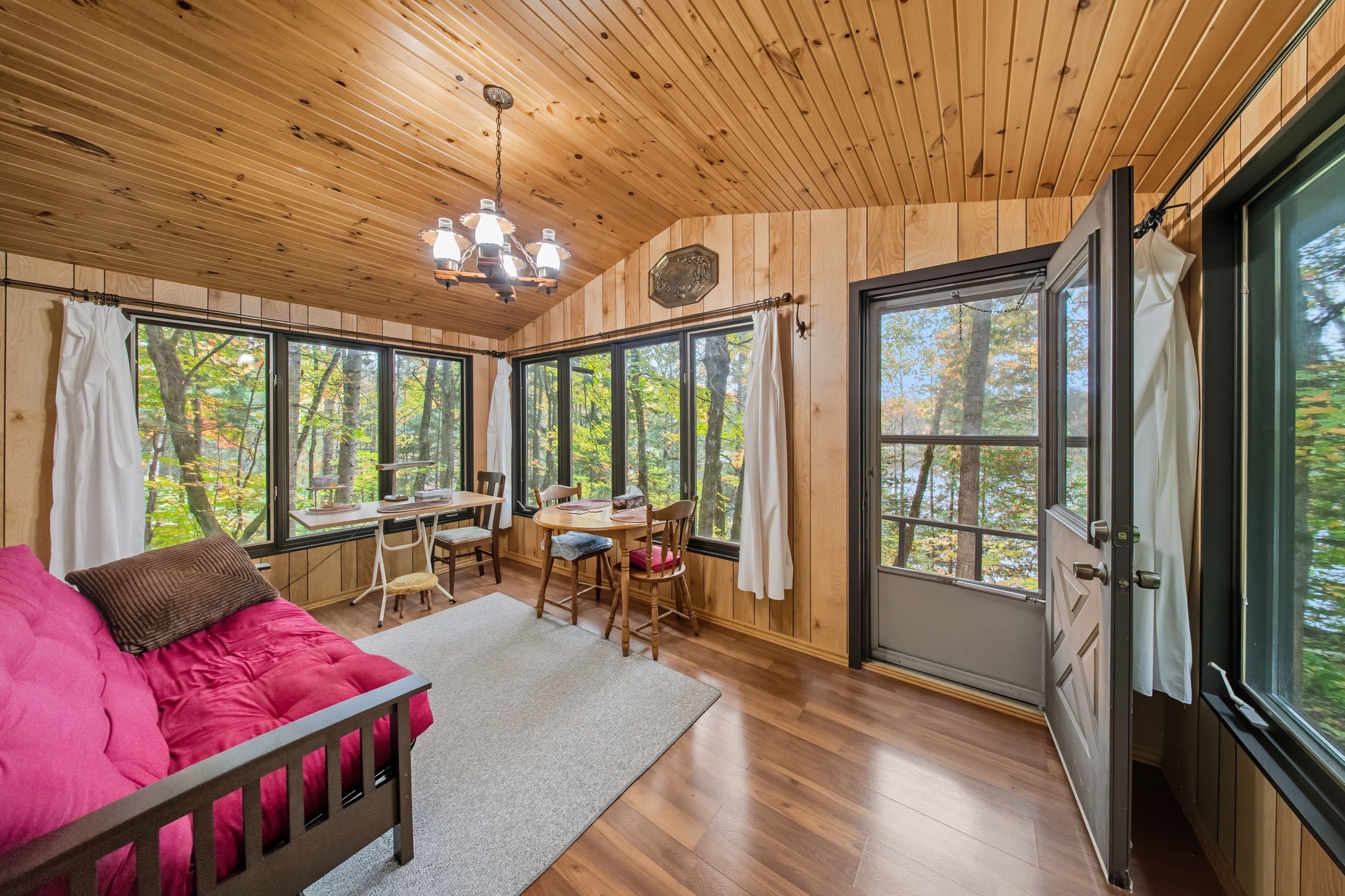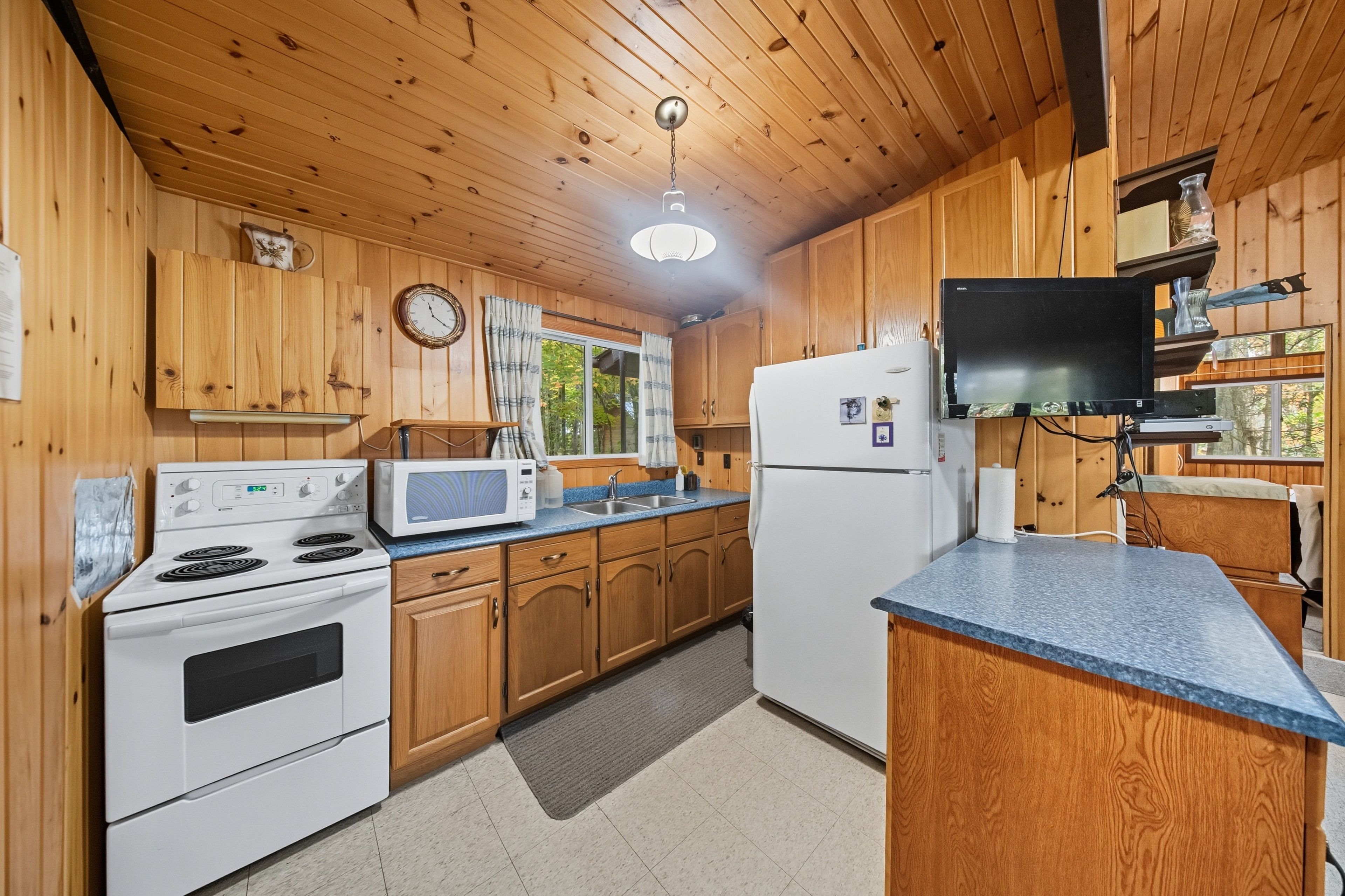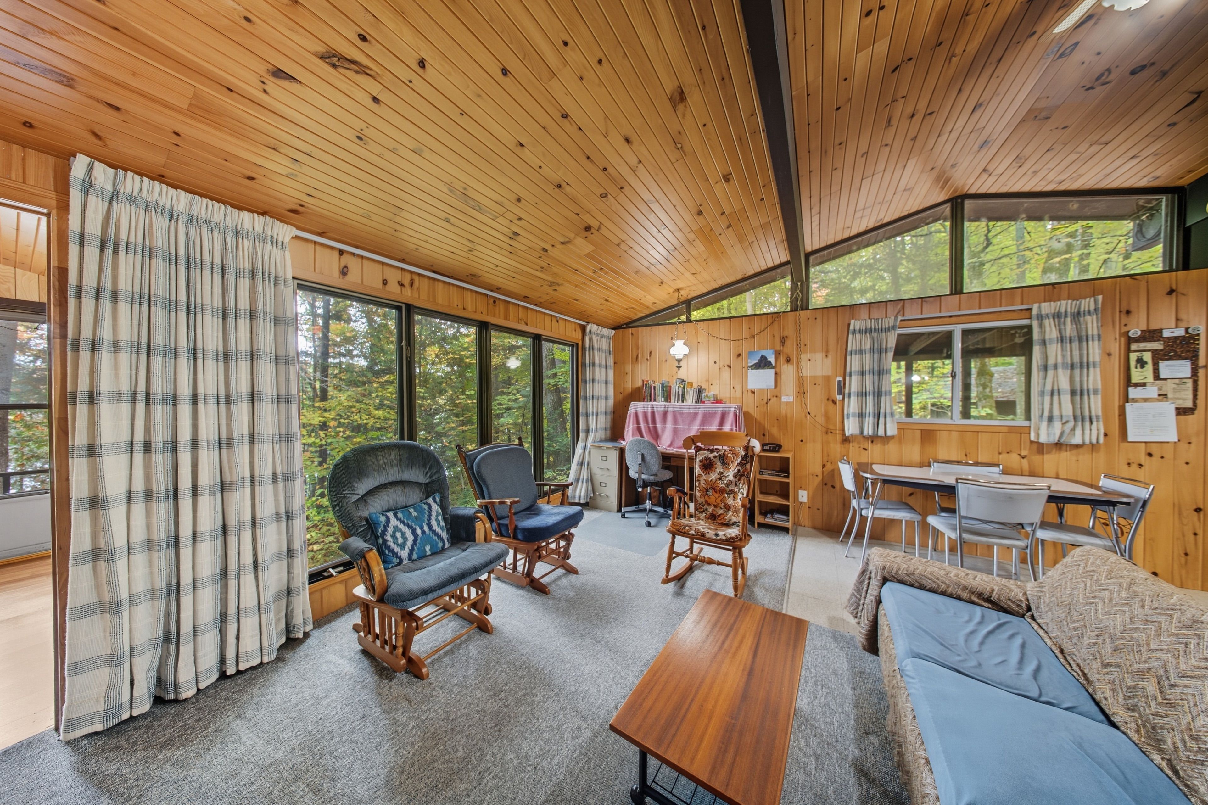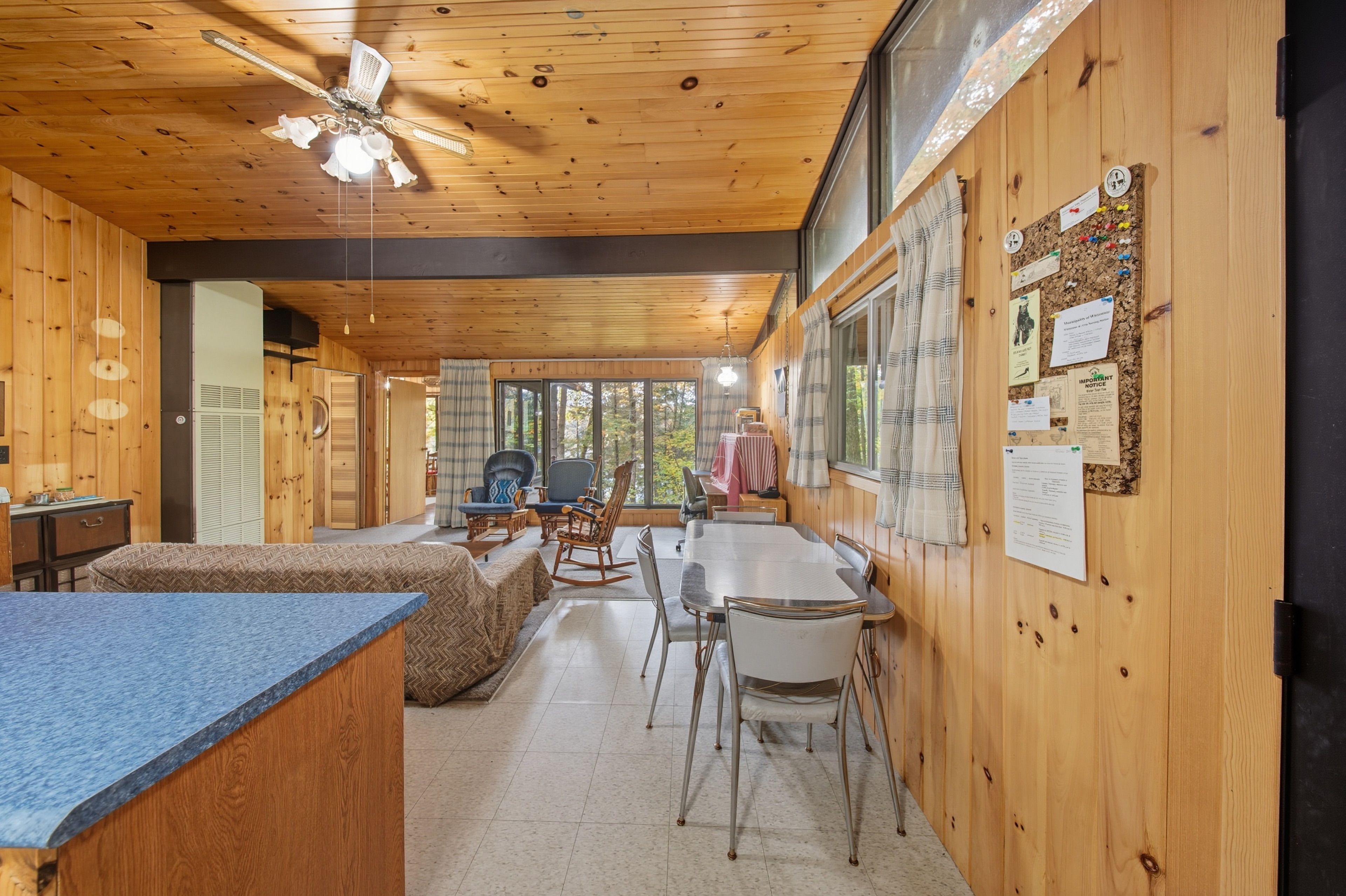 • Open concept design with warm pine lined walls and ceilings.