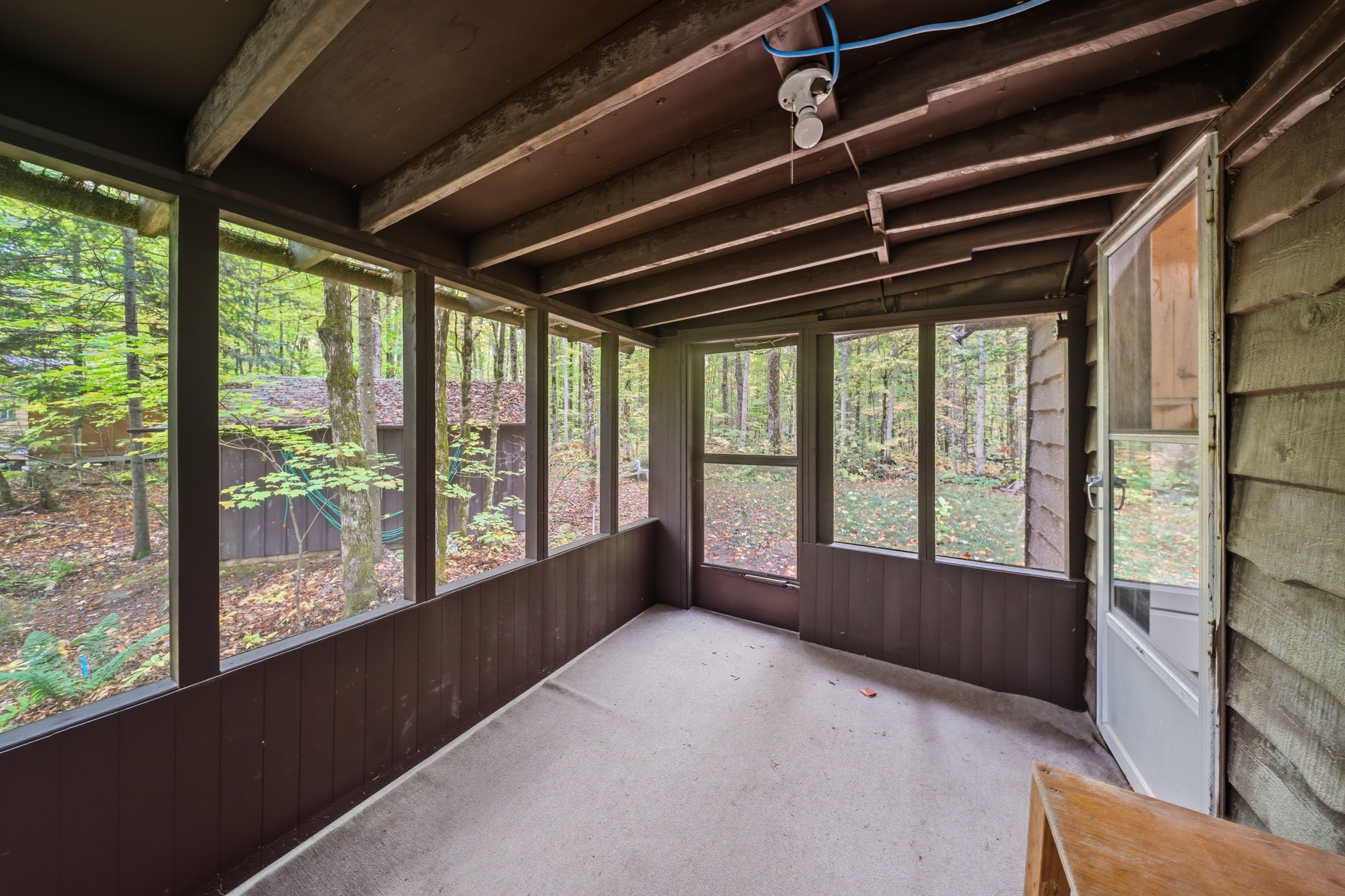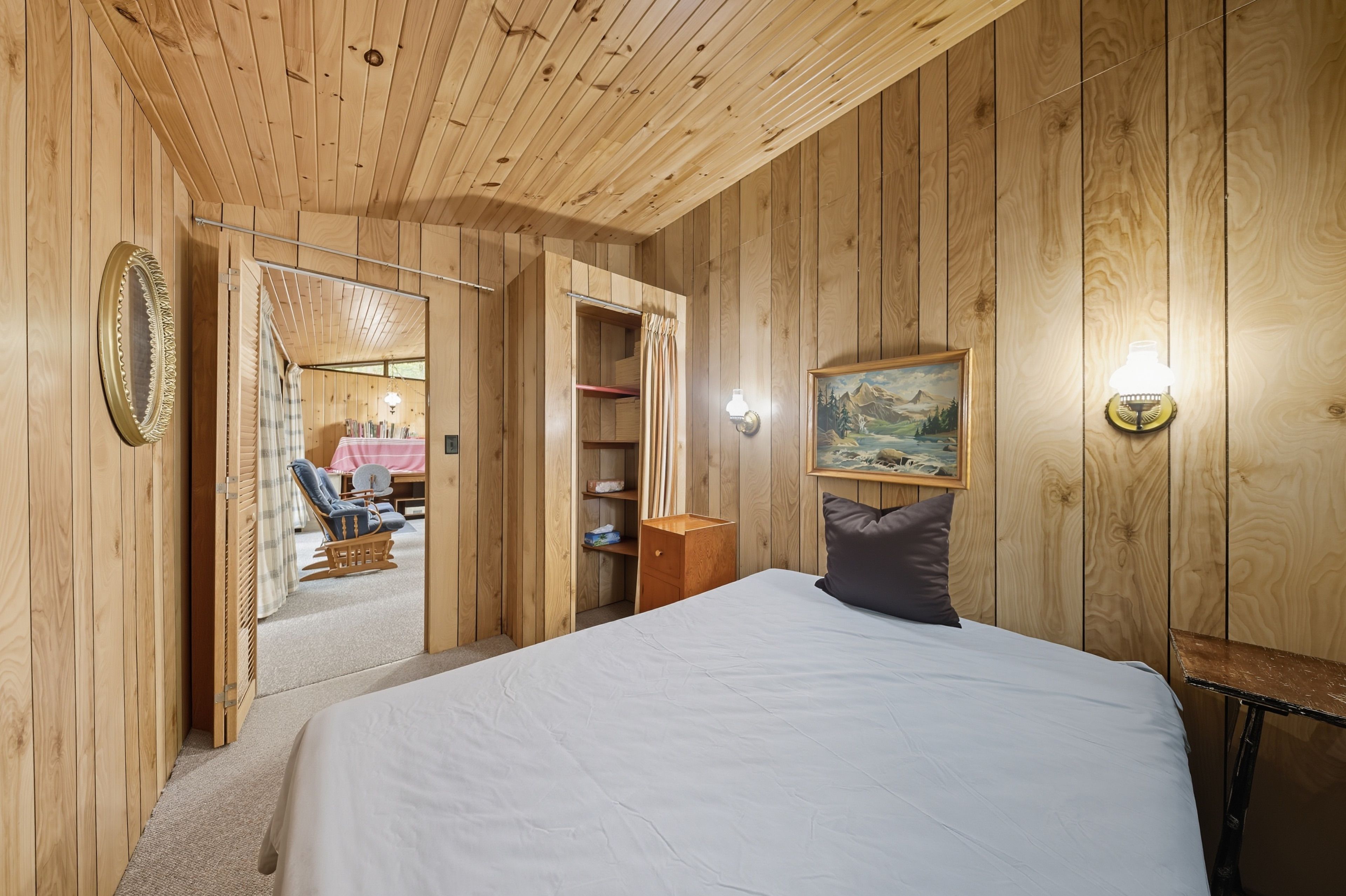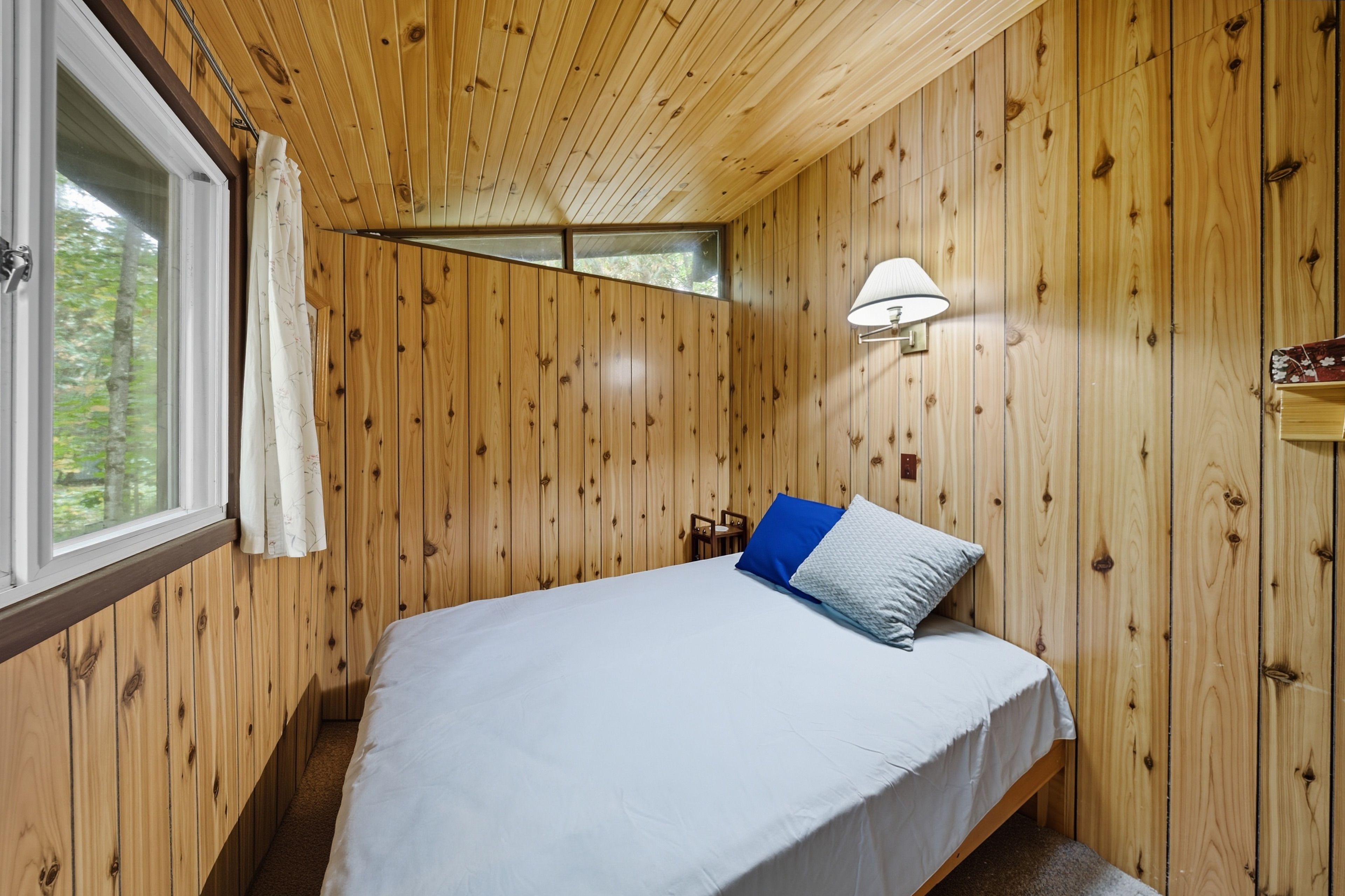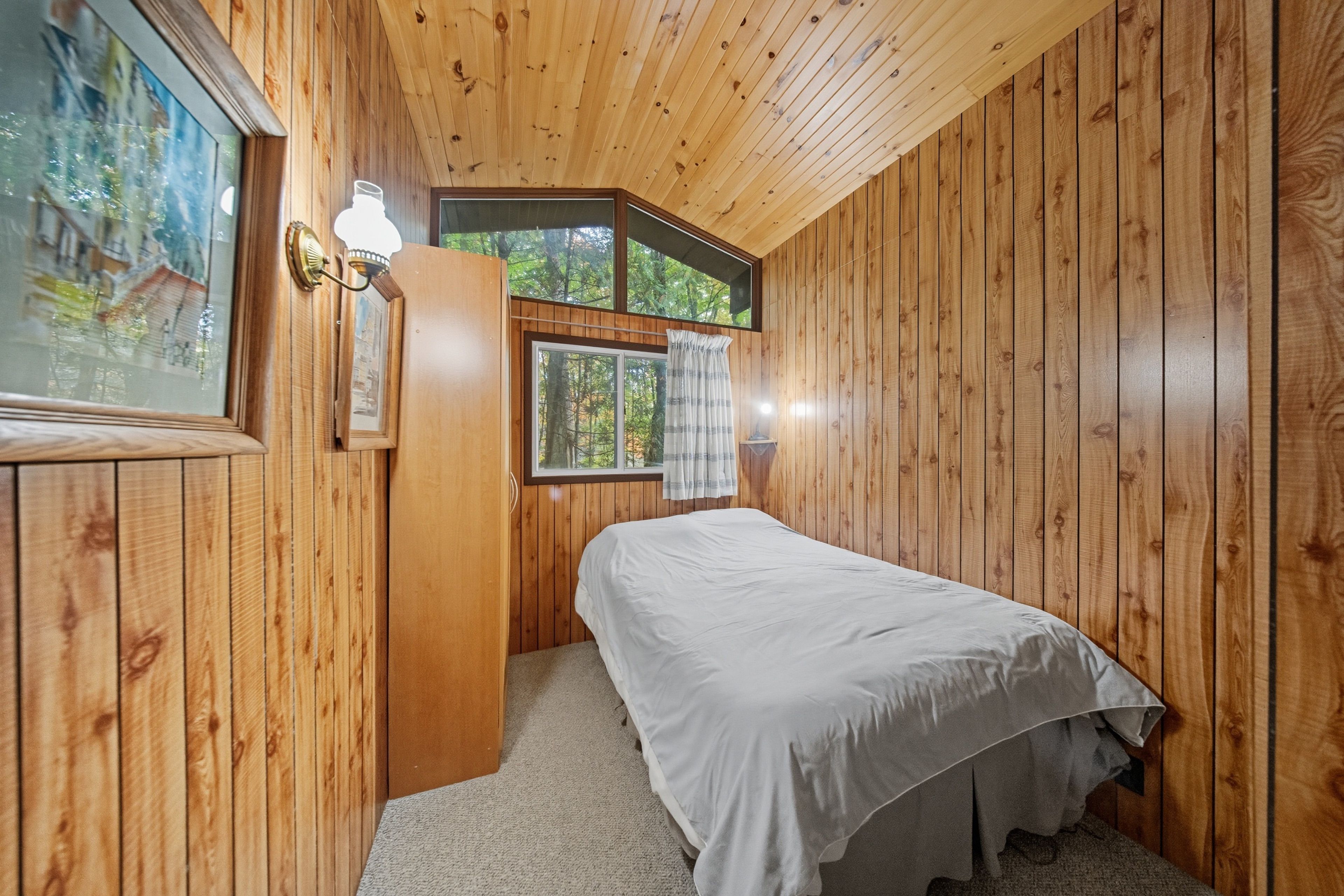 • Open concept design with warm pine lined walls and ceilings.