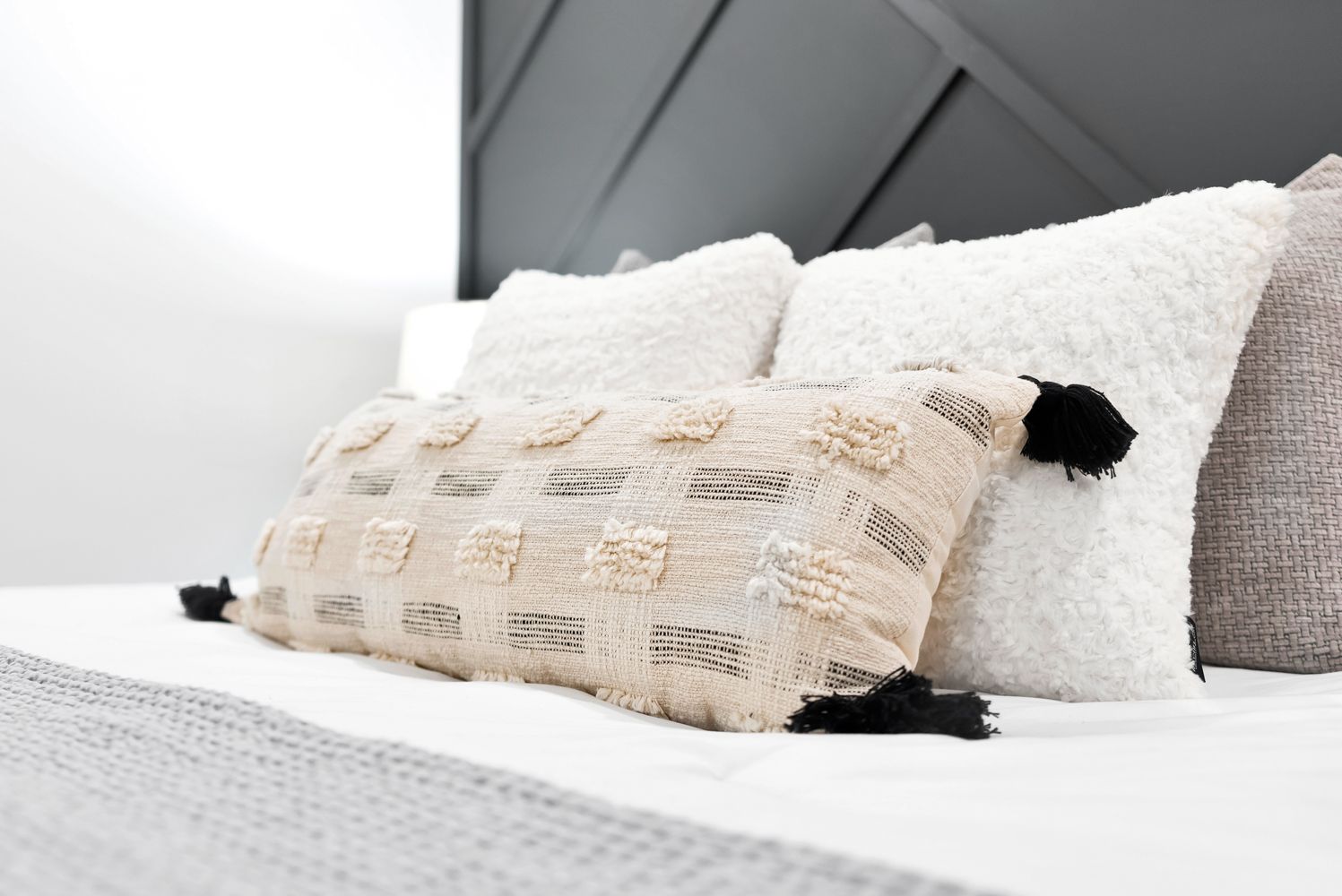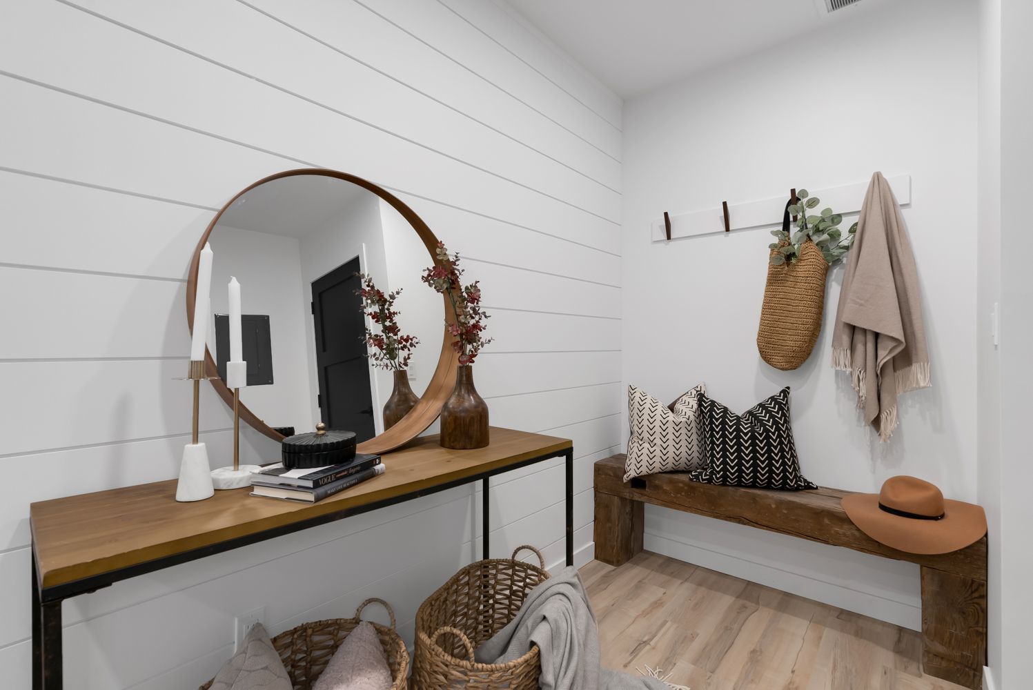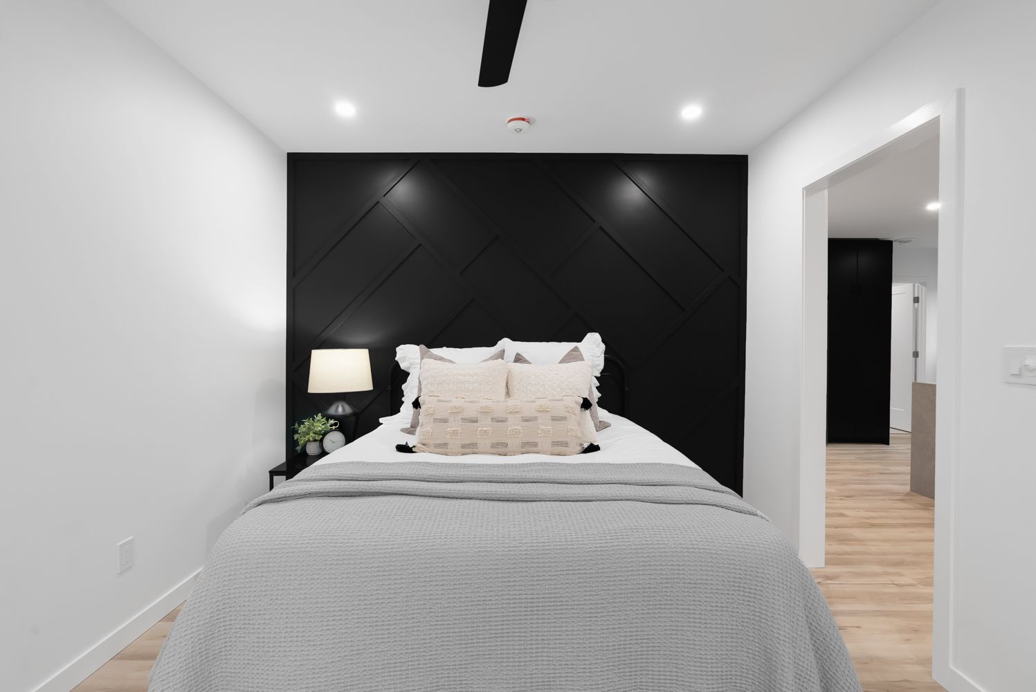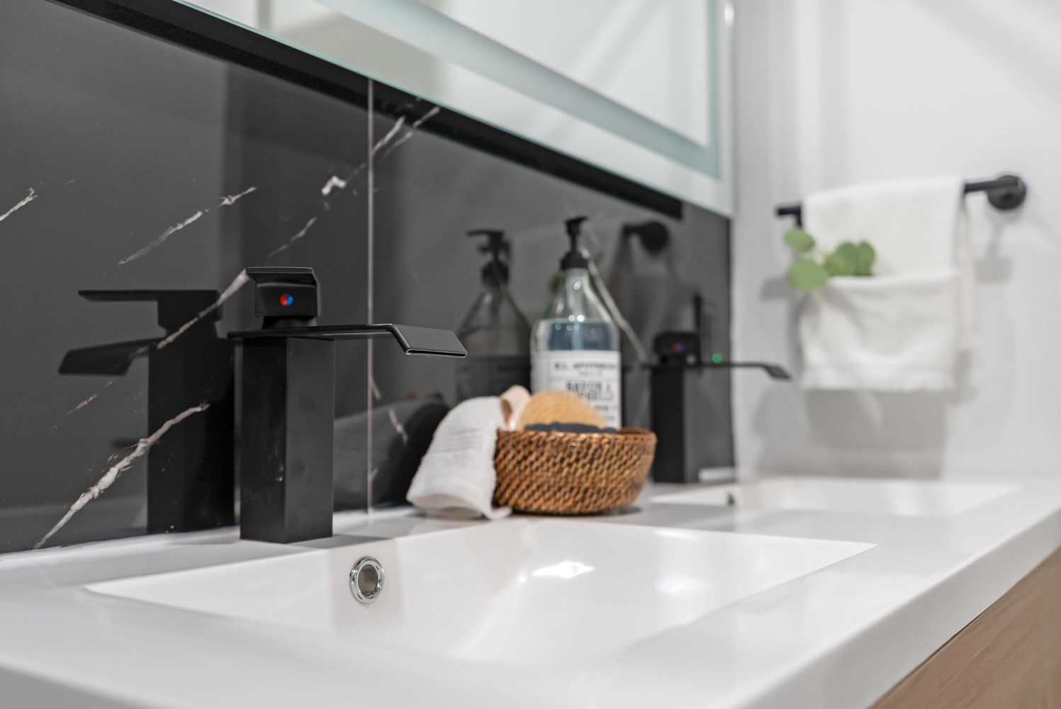 • Spa-like bathroom with dual sinks and a calming aesthetic.