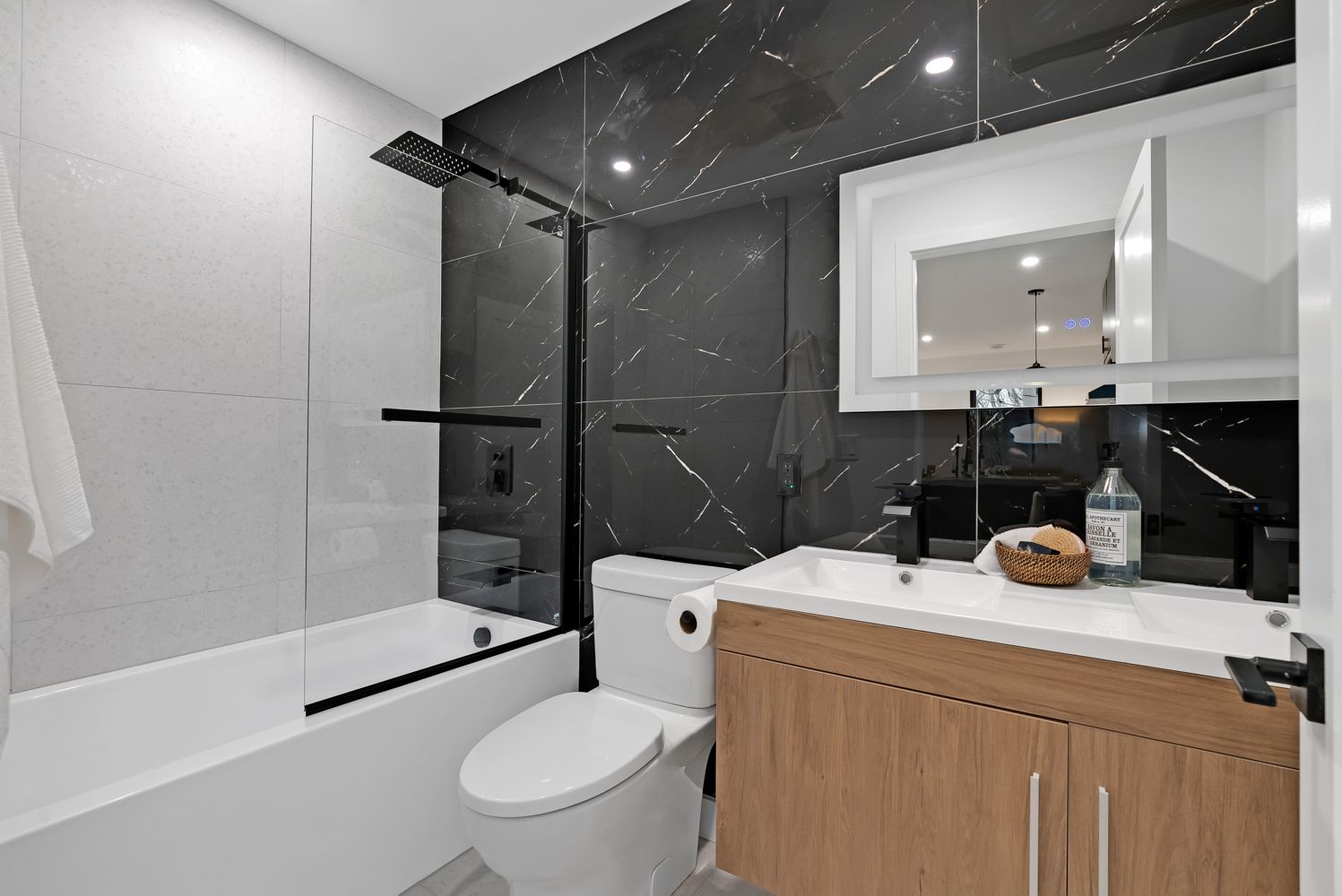 • Kitchen features quartz countertops and built-in stainless steel appliances.