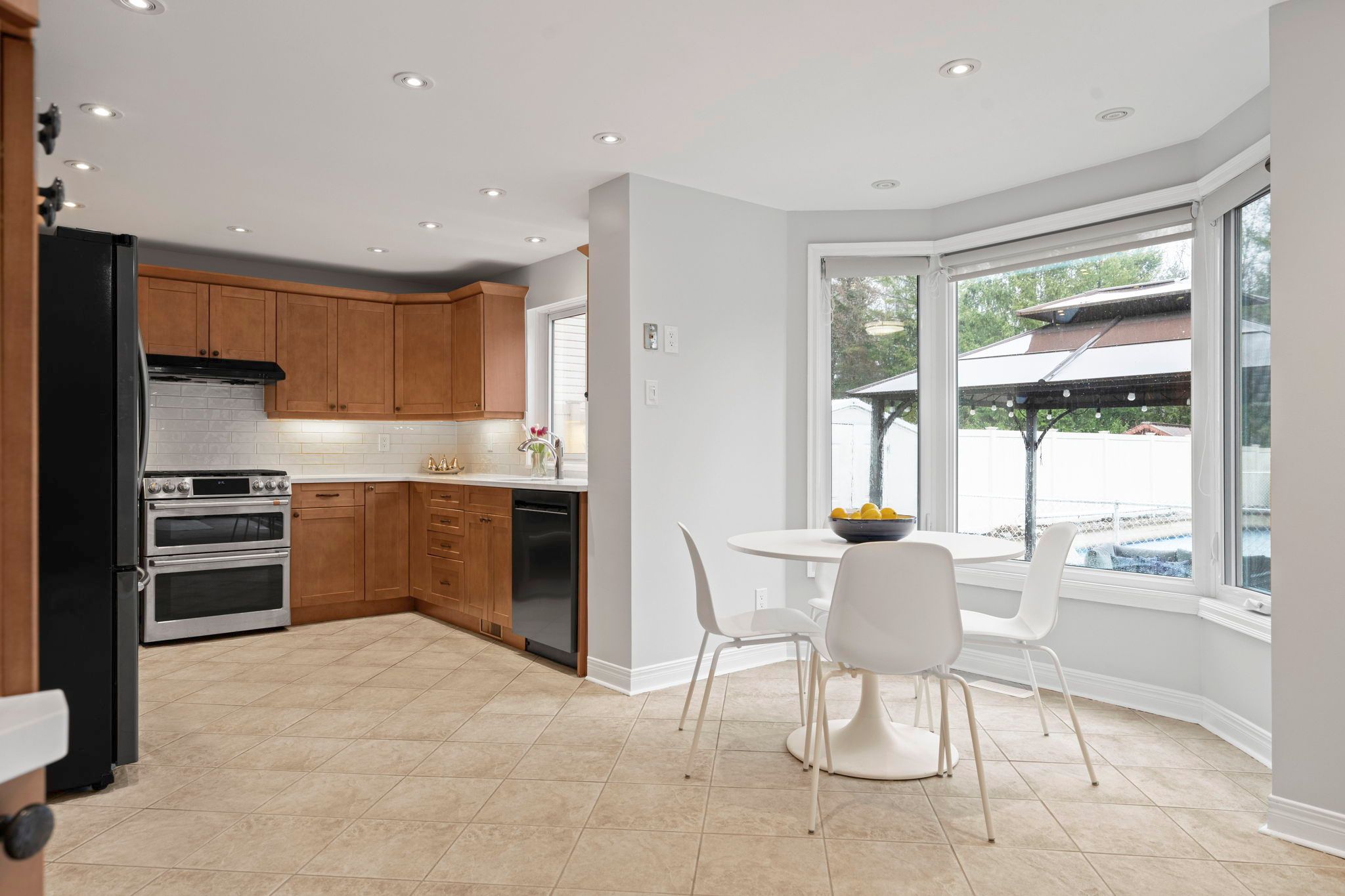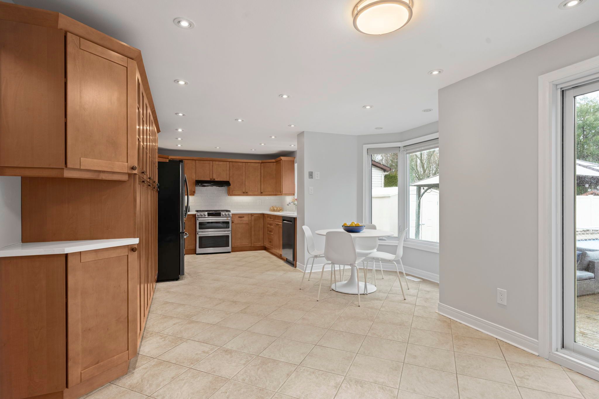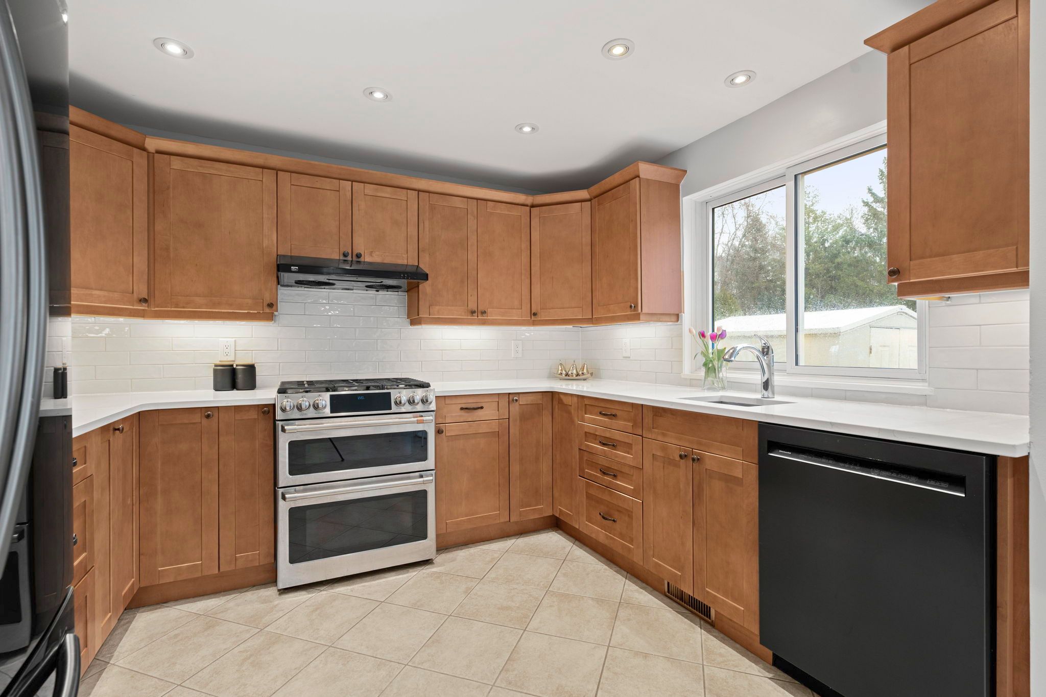 • Modern kitchen featuring quartz countertops, double oven, and cozy eating space.