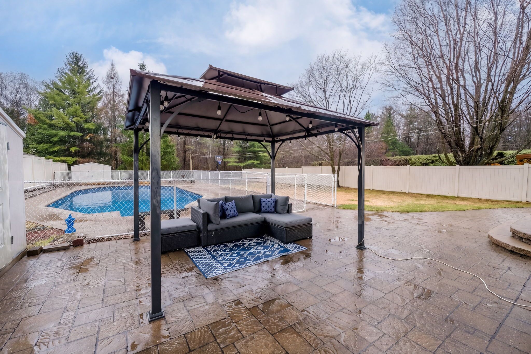 • Private backyard oasis with a saltwater pool, gazebo, and basketball pad.
