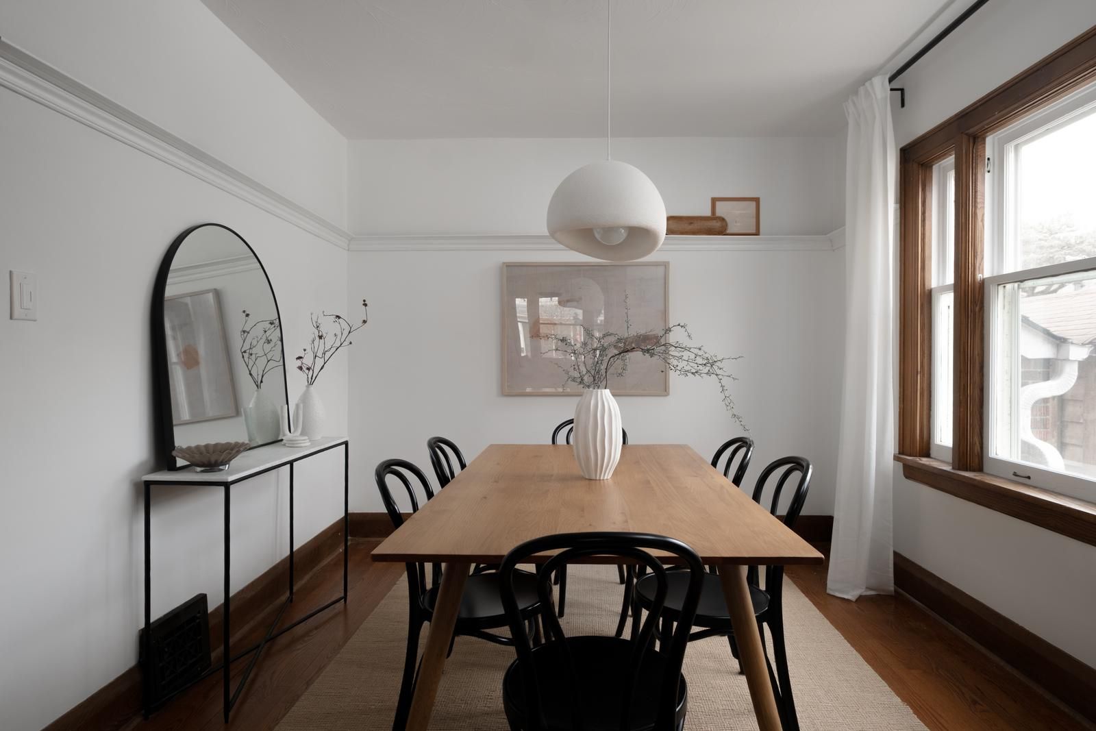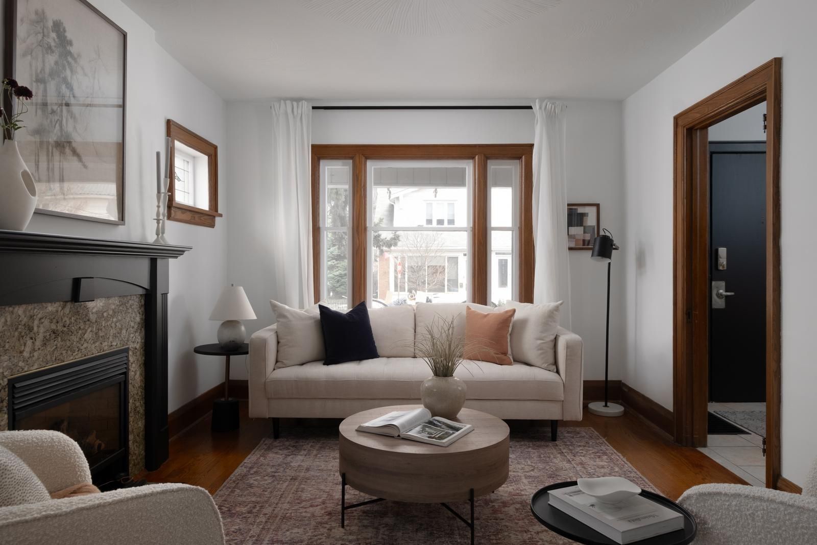 • Traditional main floor layout with stained glass windows and wood trim.