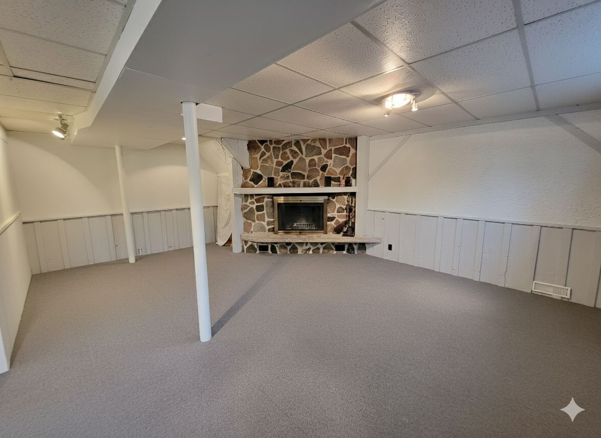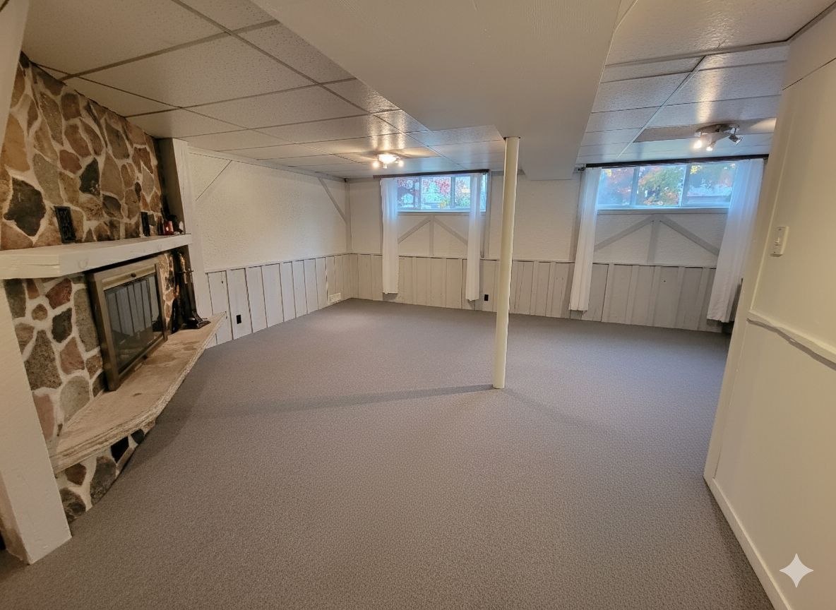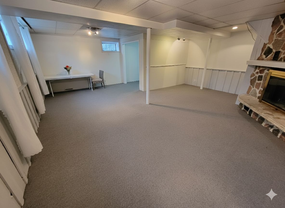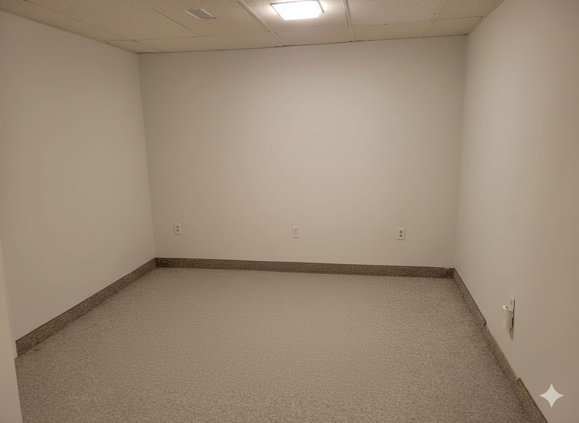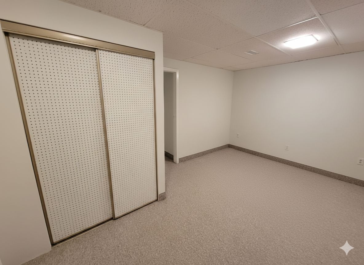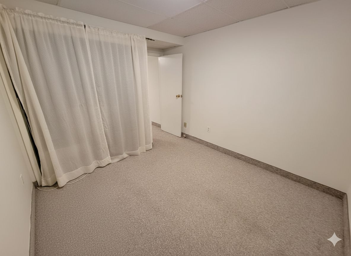 • Bright lower-level suite with large windows and high ceilings.