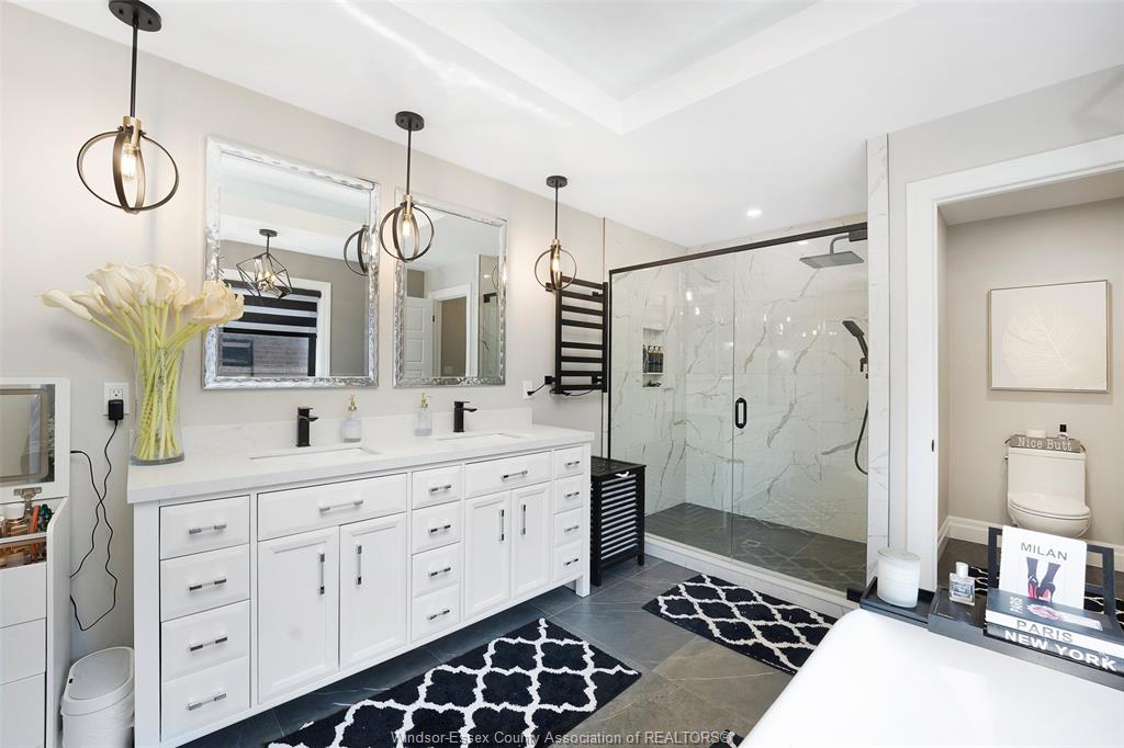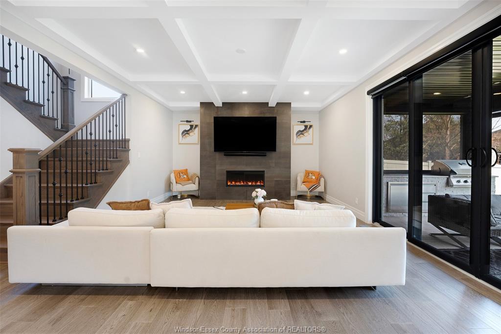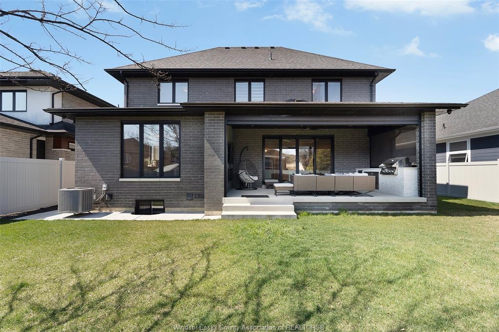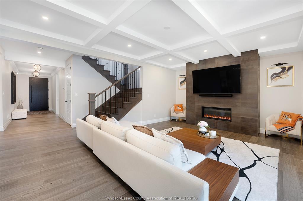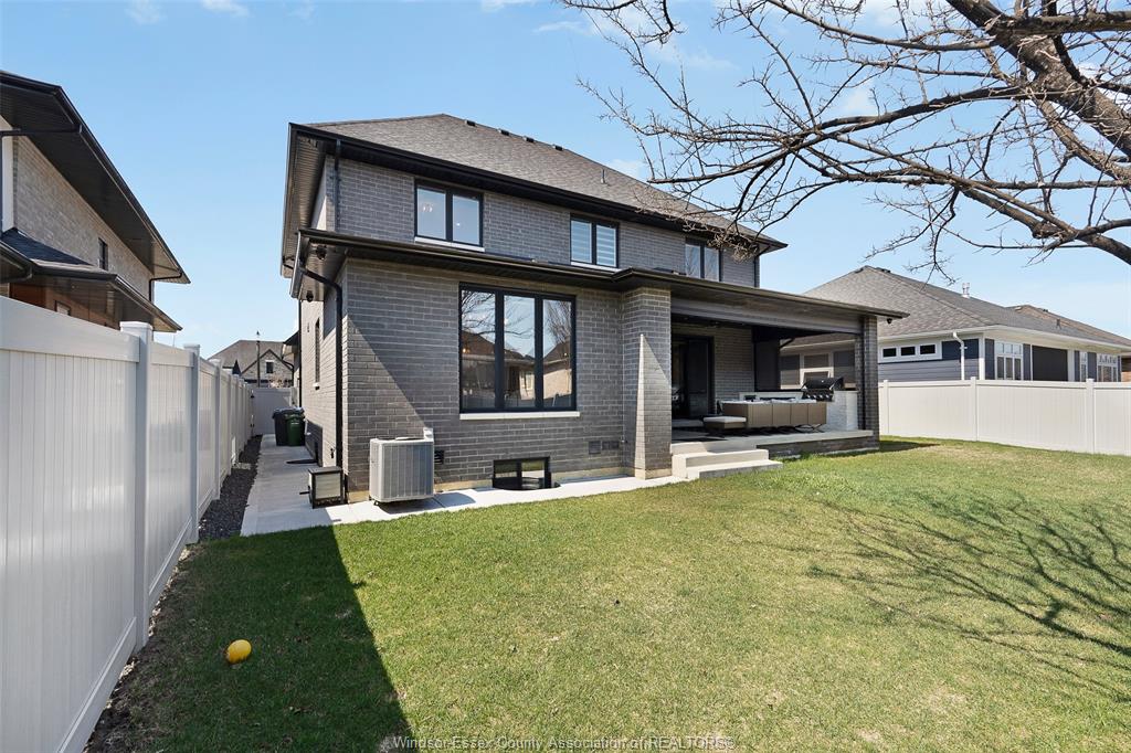 Welcome to this stunning two-storey brick and stone residence, boasting 4 +1 bedrooms and 6 bathrooms (w/ 3 ensuite), ideally located in the prestigious russell woods community built by caster custom homes (2022). Offering approximately 3,400 sq ft above grade, plus a fully finished lower level with a separate grade-level entrance through the attached double garage, this home is perfectly designed for luxury living and multi-generational flexibility. The main floor showcases an elegant open-concept layout, highlighted by a sophisticated living room featuring custom coffered ceilings and a striking tiled fireplace. The gourmet chef’s kitchen is truly the heart of the home, complete with a large centre island with eat-in seating, wine fridge, premium appliances including 48" range with 6 burners + griddle and double ovens, separate dining area, and a walk-in pantry. A highly desirable main floor bedroom includes a private 3-piece ensuite with a custom glass shower— ideal for guests or extended family. Easily converted to a home office for professionals preferring to work from home. Upstairs, the luxurious primary suite offers a refined retreat, featuring custom lighting, a tray ceiling, and an expansive walk-in closet with built-in cabinetry. The spa-inspired 5-piece ensuite includes a soaker tub, glass shower, and private water closet. Two additional generously sized bedrooms are connected by a beautifully designed jack and jill 5-piece ensuite. 2nd floor laundry centre for your convenience. The fully finished lower level provides exceptional additional living space with a separate entrance, spacious living area, bedroom, wet bar, a 3-piece bathroom, and an additional 2-piece bath—perfect for an in-law suite or income potential. Step outside to enjoy the covered rear porch with a outdoor kitchen, seating area, and fireplace. Motorized screens for privacy - ideal for effortless outdoor entertaining.