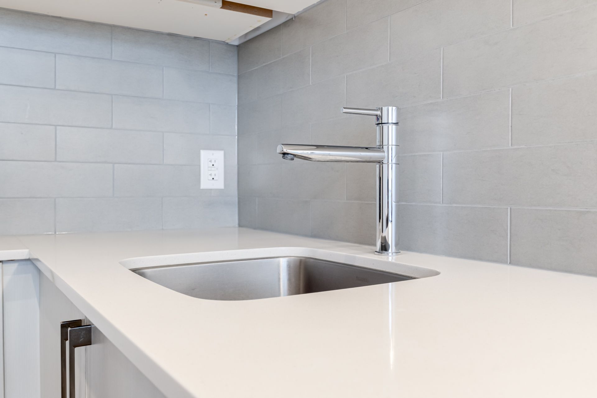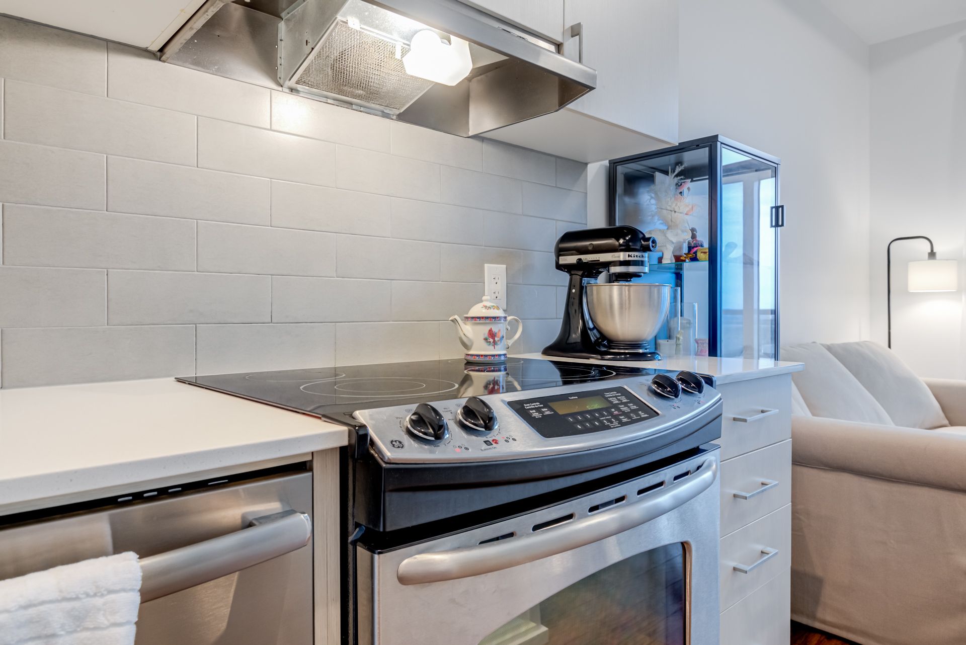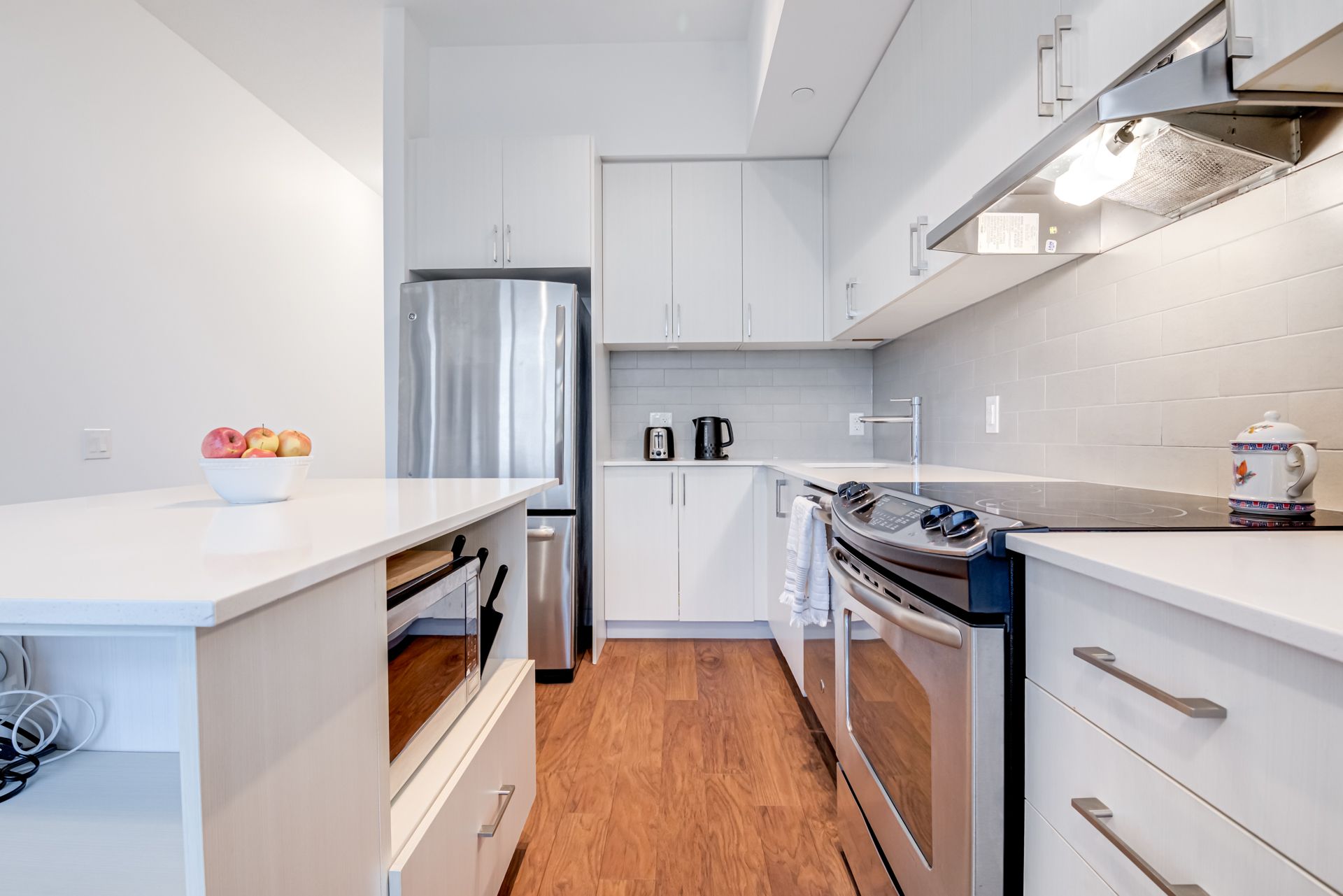 • Bright kitchen with stainless steel appliances and quartz countertops.