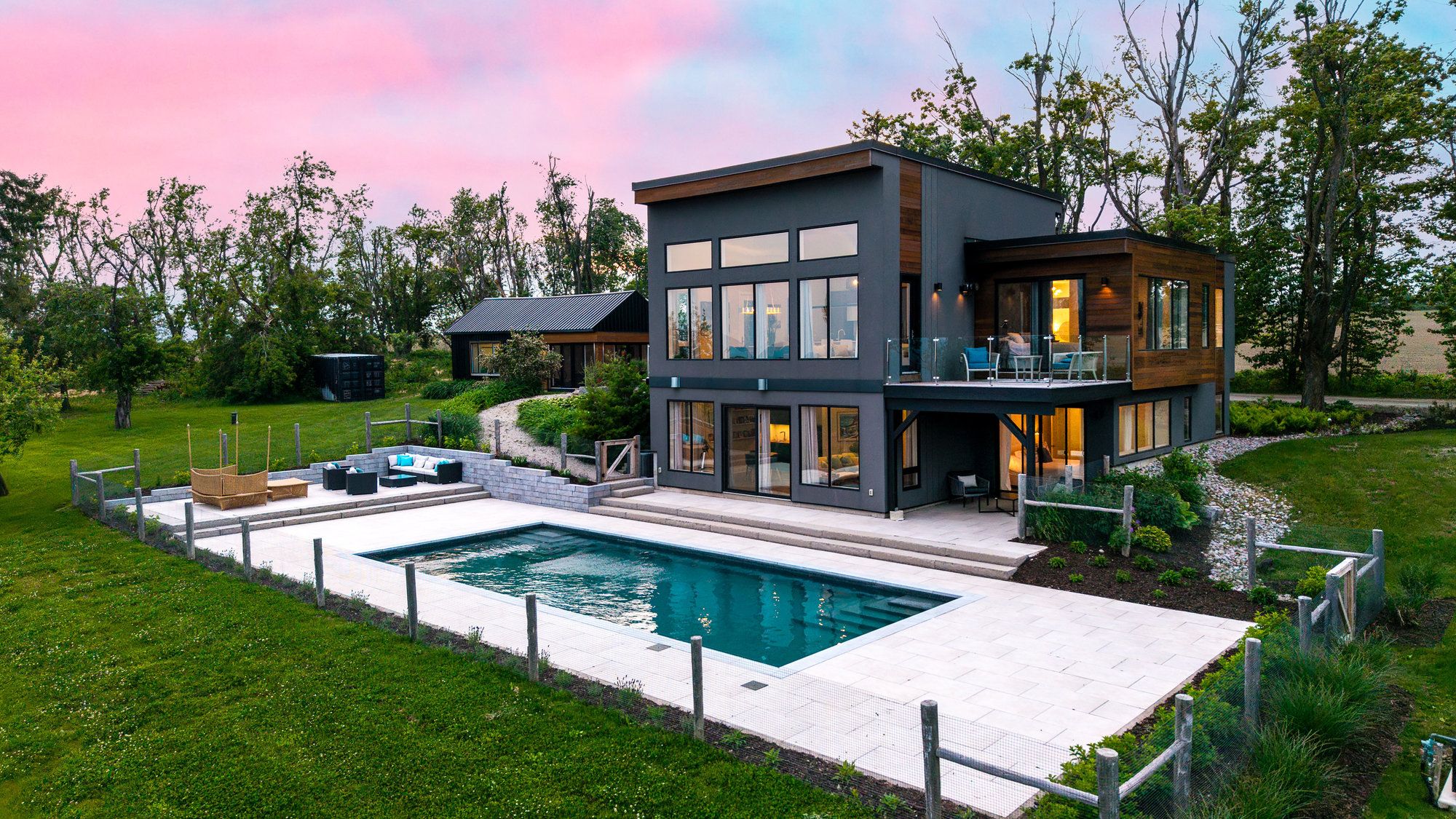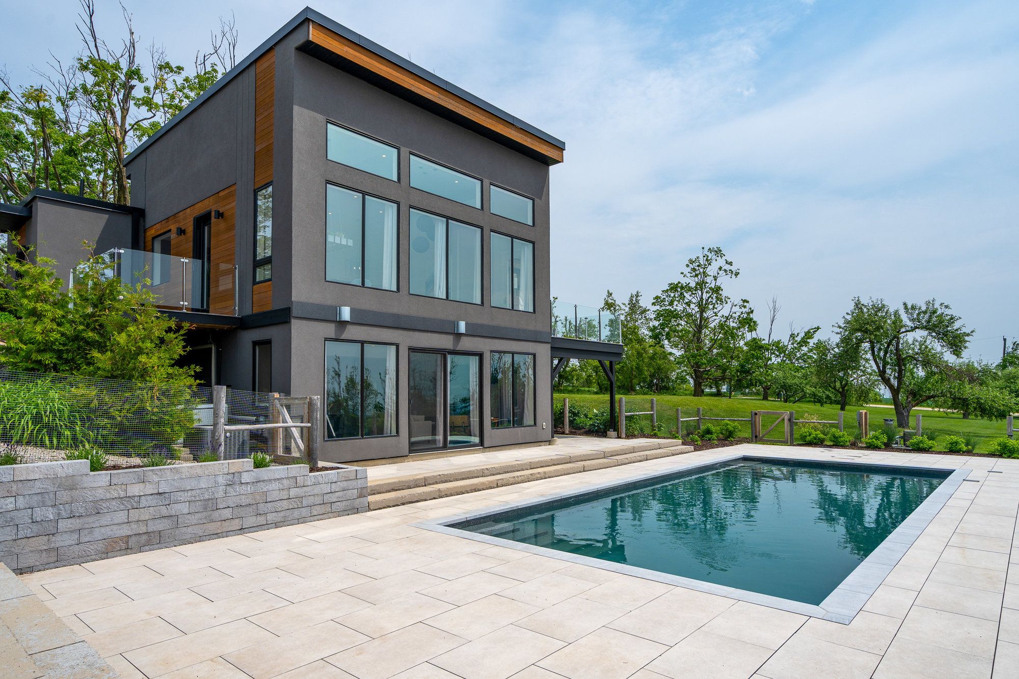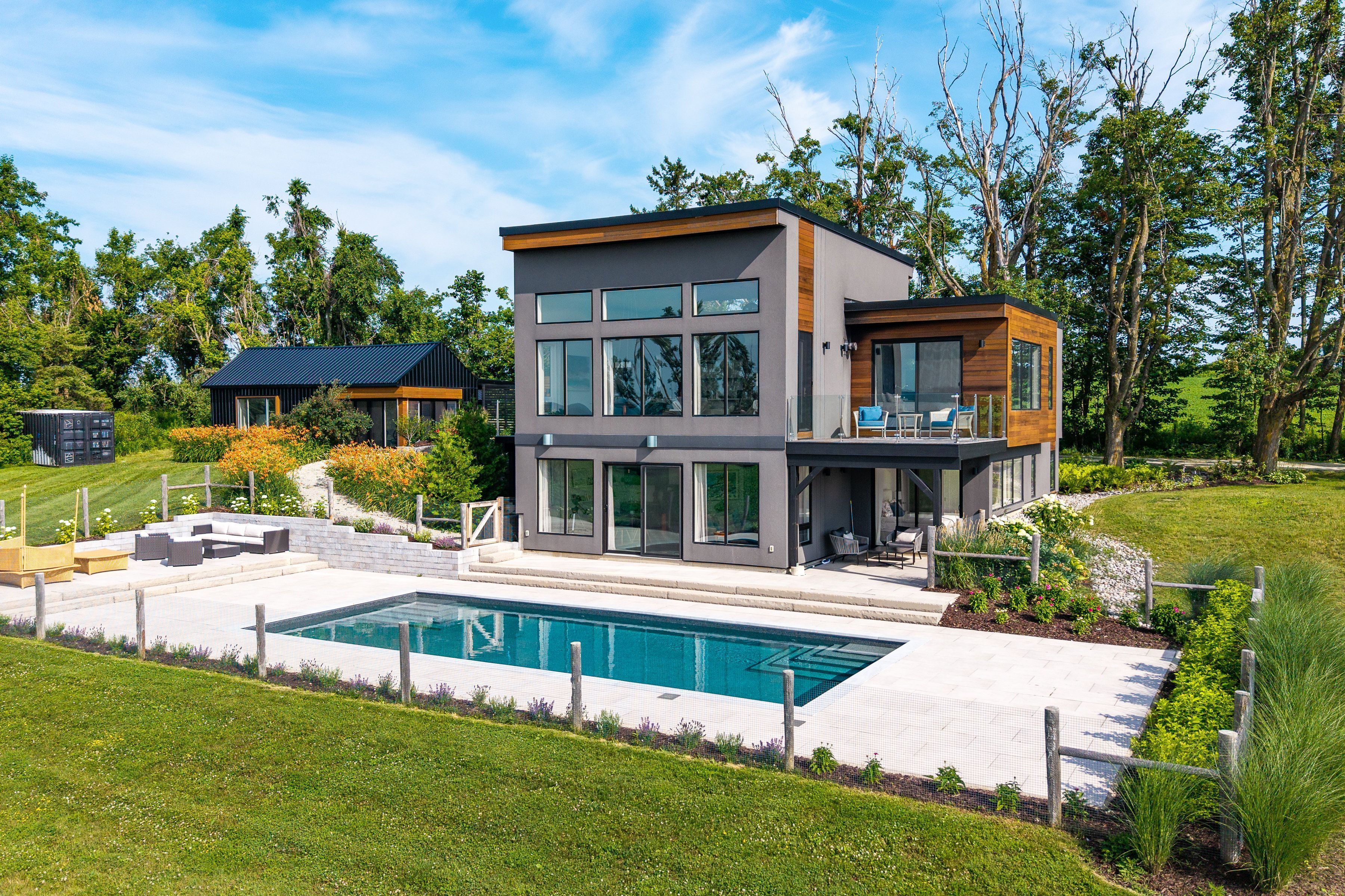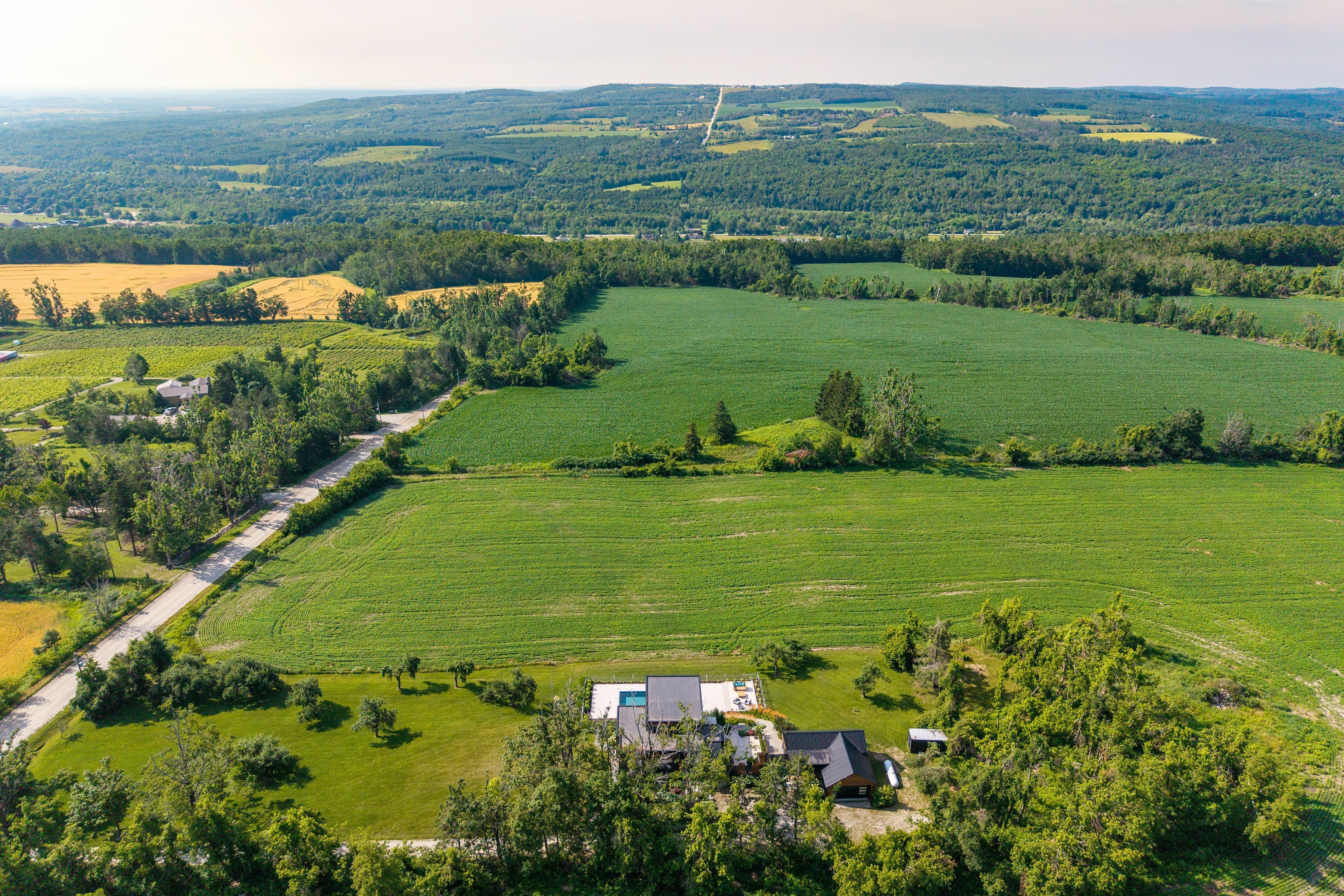 "viewfield" an exceptional three-bedroom home, where you can experience the most stunning sunrise and sunset views. Set on 1. 3 professionally landscaped acres outside the vibrant village of creemore. Tucked at the end of a maple-lined driveway, the home exudes the peaceful elegance of a european retreat. Inside, the bright and airy layout is designed to impress. Oversized windows frame panoramic views of rolling hills and farmland, while the open-concept main floor blends everyday comfort with sophisticated style. The custom walnut kitchen features granite counters, wall oven and cooktop, and a large island with floating shelves perfect for cooking or gathering. In the great room, soaring 16-ft ceilings and a sleek napoleon fireplace create a dramatic focal point, while the dining areas minimalist chandelier keeps the views front and center. Radiant in floor heating throughout the house is perfect for the cooler fall and winter days. The main-floor primary suite is a tranquil retreat, with a private dressing room, spa-like ensuite, and floor-to-ceiling windows offering abundant natural light. Downstairs, the walkout lower level is perfect for guests or extended stays, with a large family room, wet bar, 3 piece washroom, pantry, and additional storage. Working from home you can find your own space in the lovely office with built in shelving and desk. The 2 guest bedrooms are spacious with one of them having private access to a walk out with views as far as the eye can see. Step outside to a private backyard oasis with a new heated in-ground saltwater pool (2023), surrounded by limestone and concrete patios, mature trees, and a privacy fence. A bonus studio/yoga room with sliding glass doors overlooking the hills of creemore. With cedar, eramosa stone, and stucco finishes, the home blends seamlessly into its natural setting. Offering over 3,000 sq ft of finished space plus a large garage. Hundreds of thousands spent since owners have purchased. 5 minutes to creemore.
