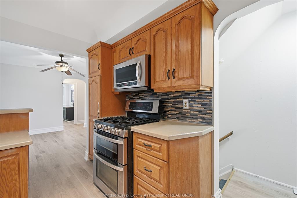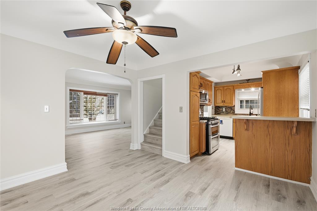 • Modern kitchen equipped with stainless steel appliances and dining area.