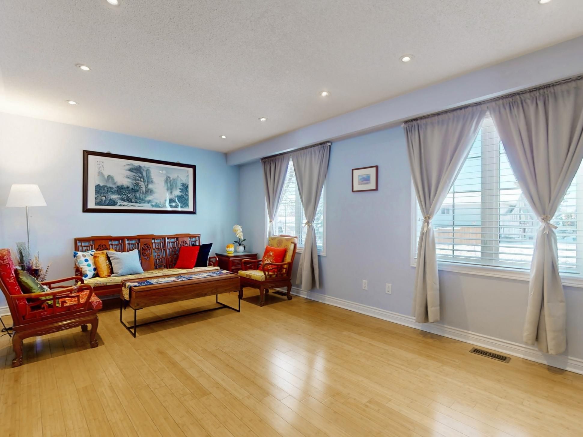 • Open concept living and dining area with large windows and backyard access.