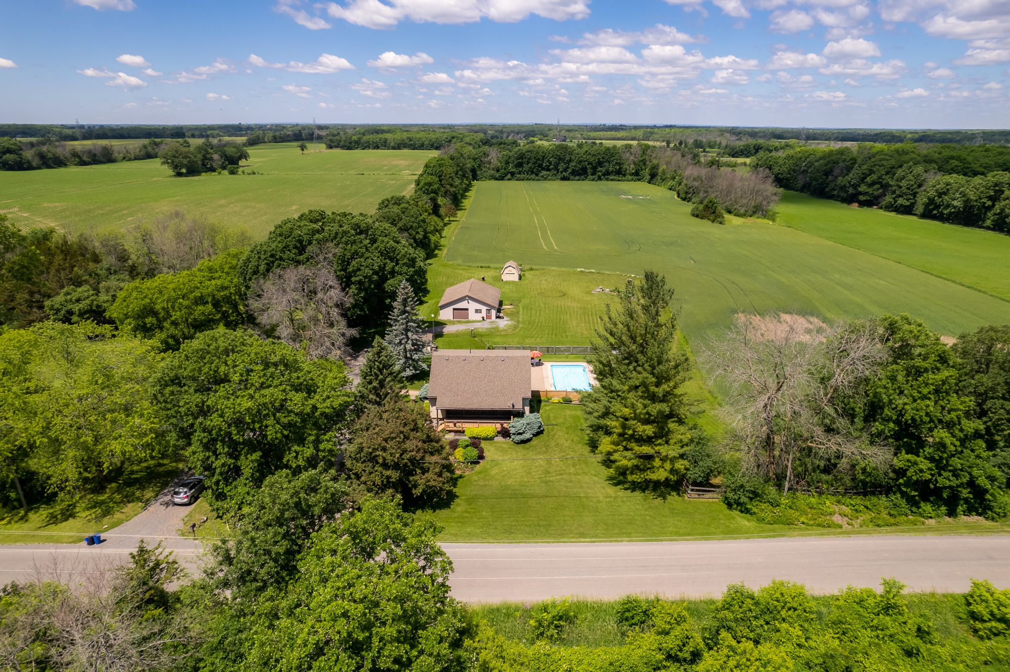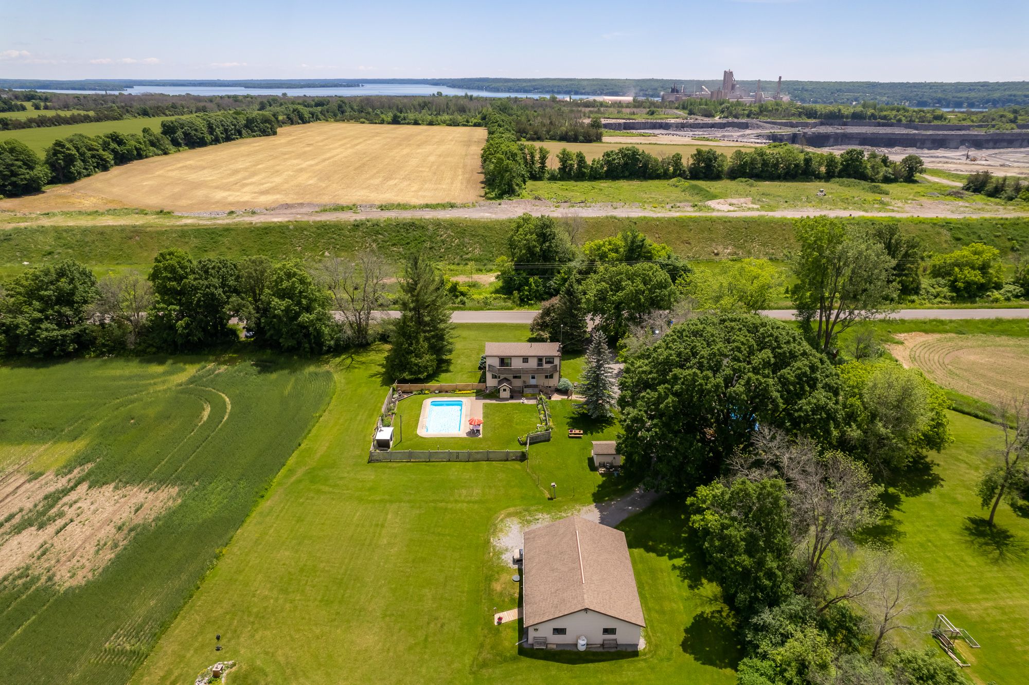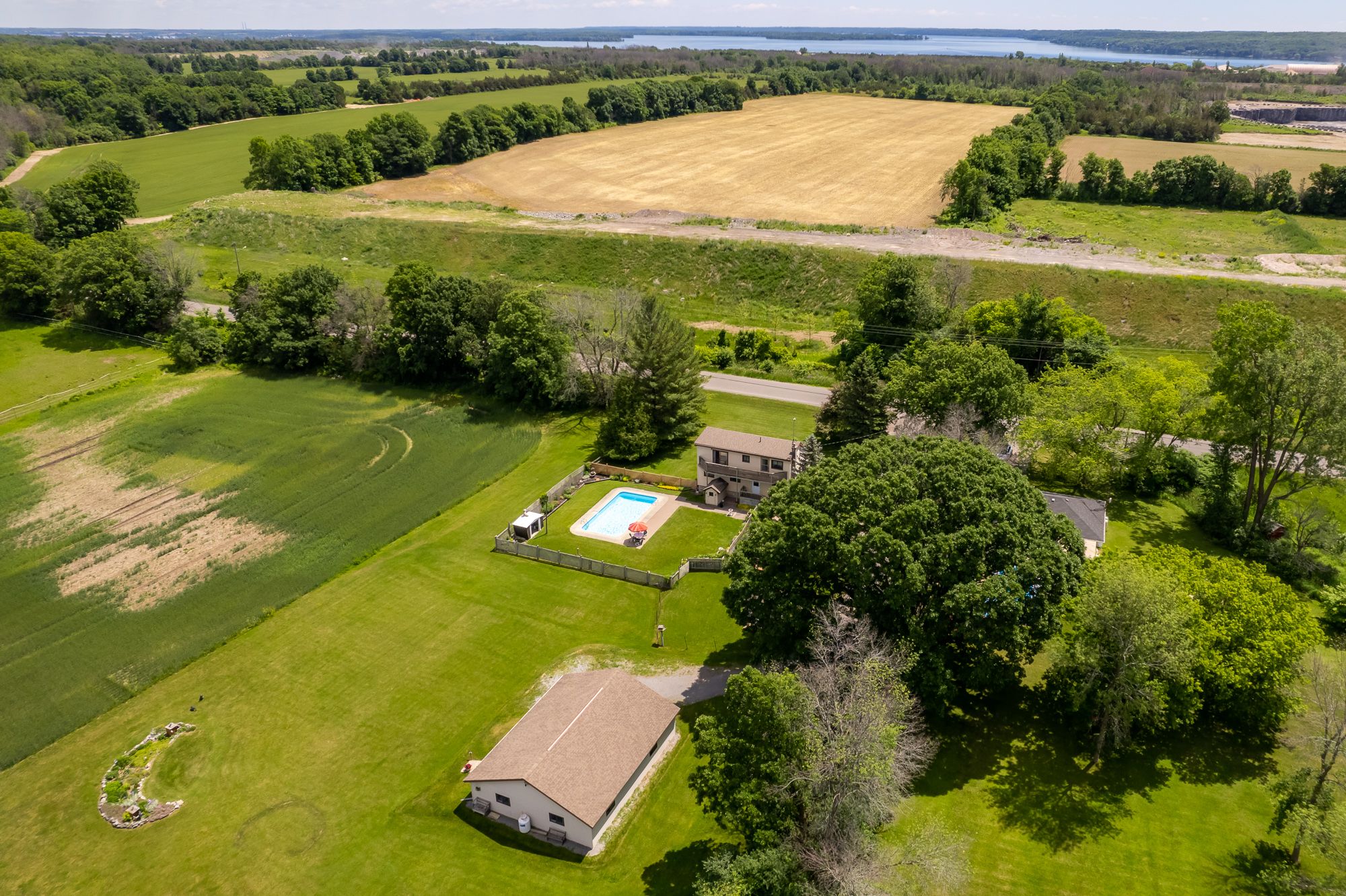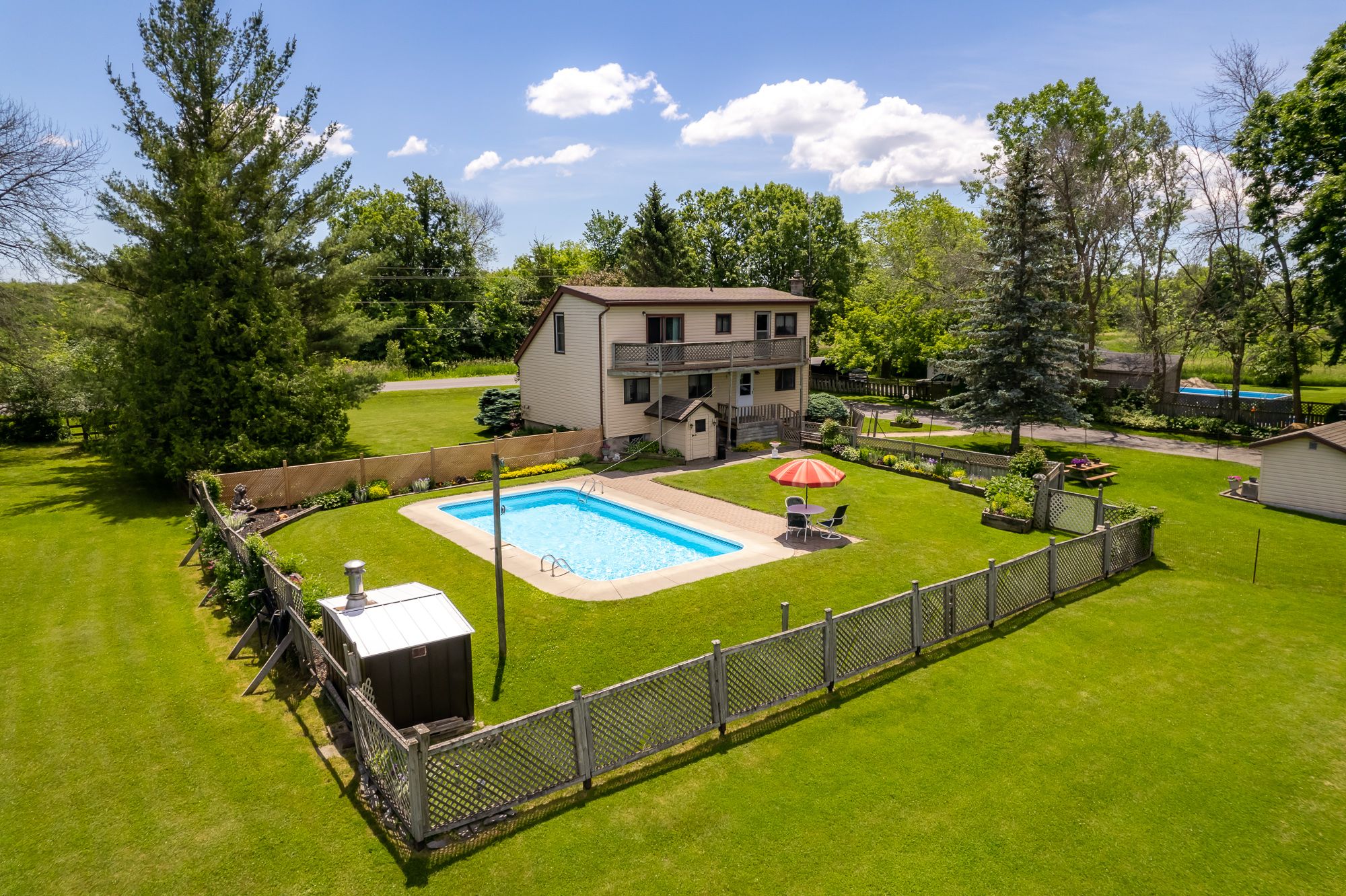 This custom built home has been loved and cared for and it shows from the beautiful landscaped yard, gardens and inground pool to the solid bones of a well built, unique home. Main floor offers kitchen and dining area that leads into a huge living room with 2 storey ceilings, hardwood floors and gorgeous real wood exposed beams. Second floor is an open hall looking down into the living area with the primary bedroom, bath and another large bedroom. Both bedrooms have a walkout to a 2nd storey balcony with pastoral views of your 11+ acres. Walk out basement is finished as a recroom with an additional space for laundry/utility. Your paved driveway leads to the huge detached garage and an in-law suite at the back with tons of income potential! 11+ acres with 400' of road frontage. Possible severance.