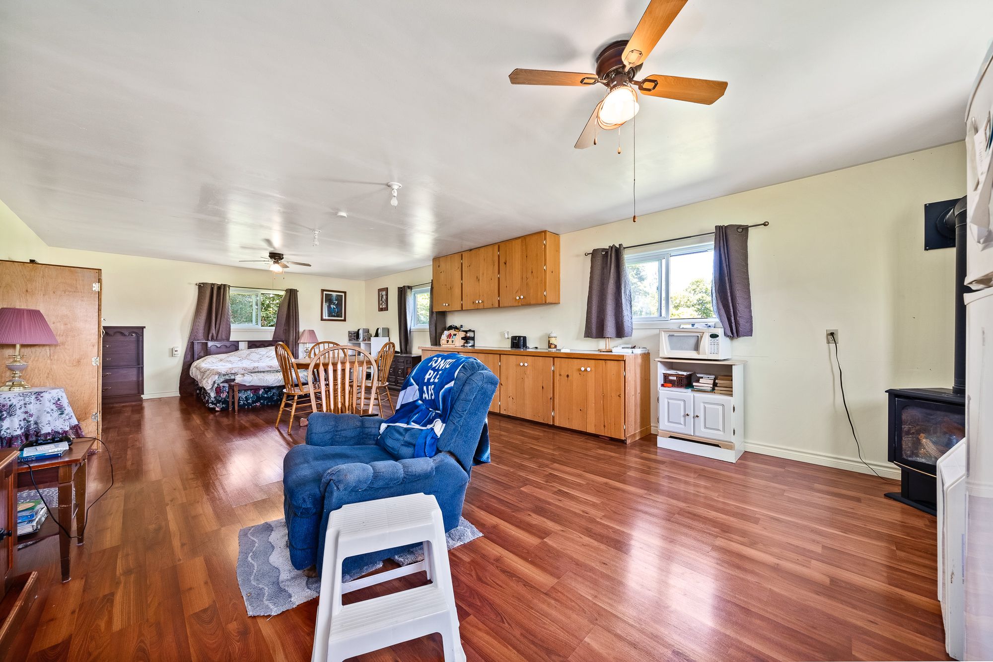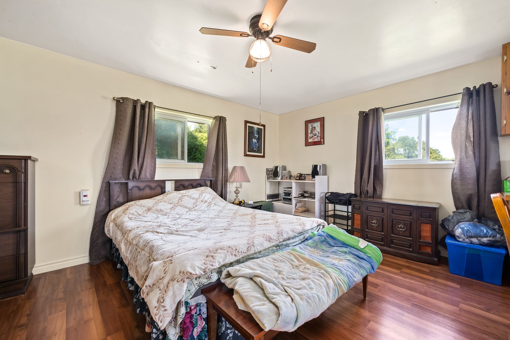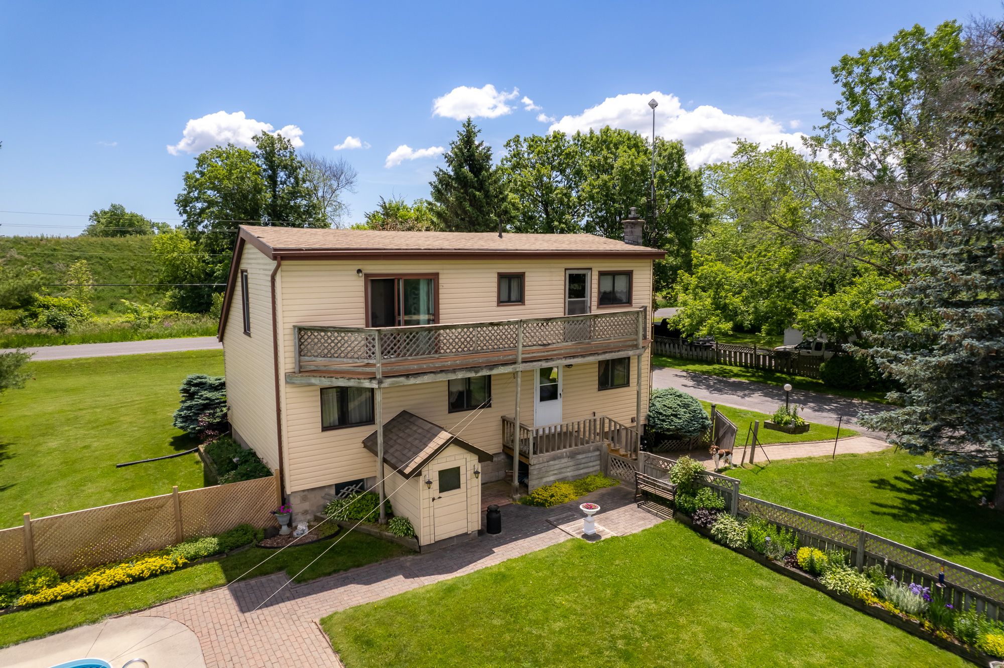 This custom built home has been loved and cared for and it shows from the beautiful landscaped yard, gardens and inground pool to the solid bones of a well built, unique home. Main floor offers kitchen and dining area that leads into a huge living room with 2 storey ceilings, hardwood floors and gorgeous real wood exposed beams. Second floor is an open hall looking down into the living area with the primary bedroom, bath and another large bedroom. Both bedrooms have a walkout to a 2nd storey balcony with pastoral views of your 11+ acres. Walk out basement is finished as a recroom with an additional space for laundry/utility. Your paved driveway leads to the huge detached garage and an in-law suite at the back with tons of income potential! 11+ acres with 400' of road frontage. Possible severance.