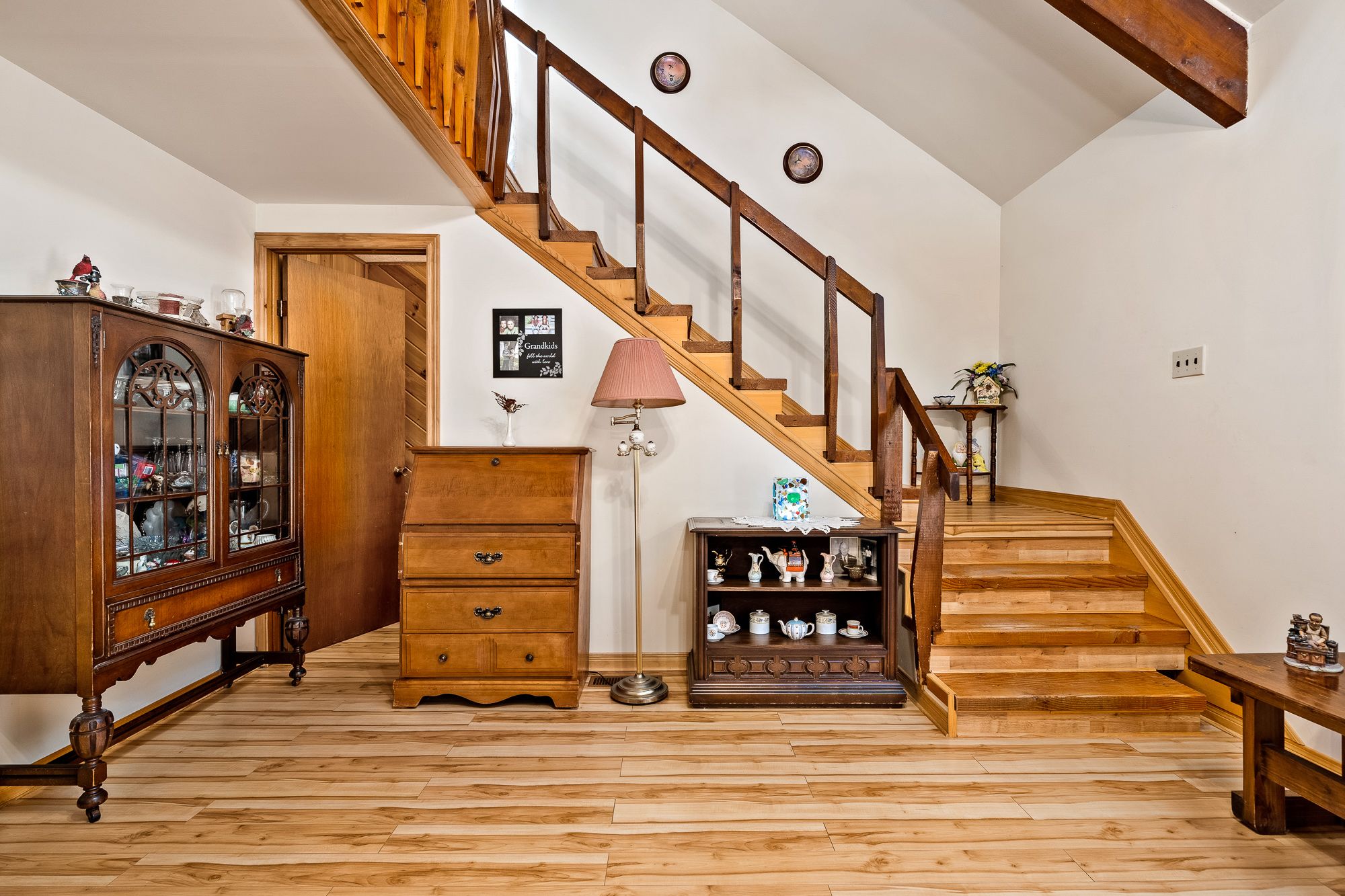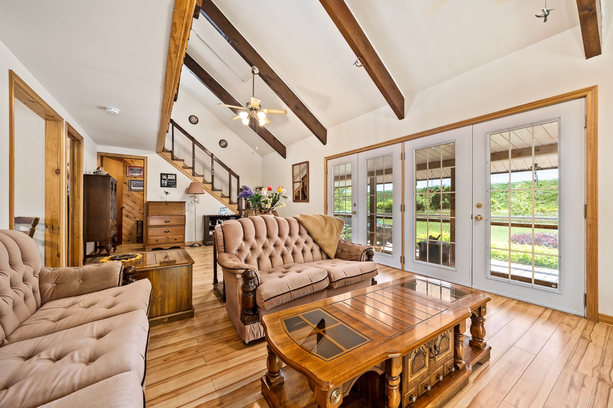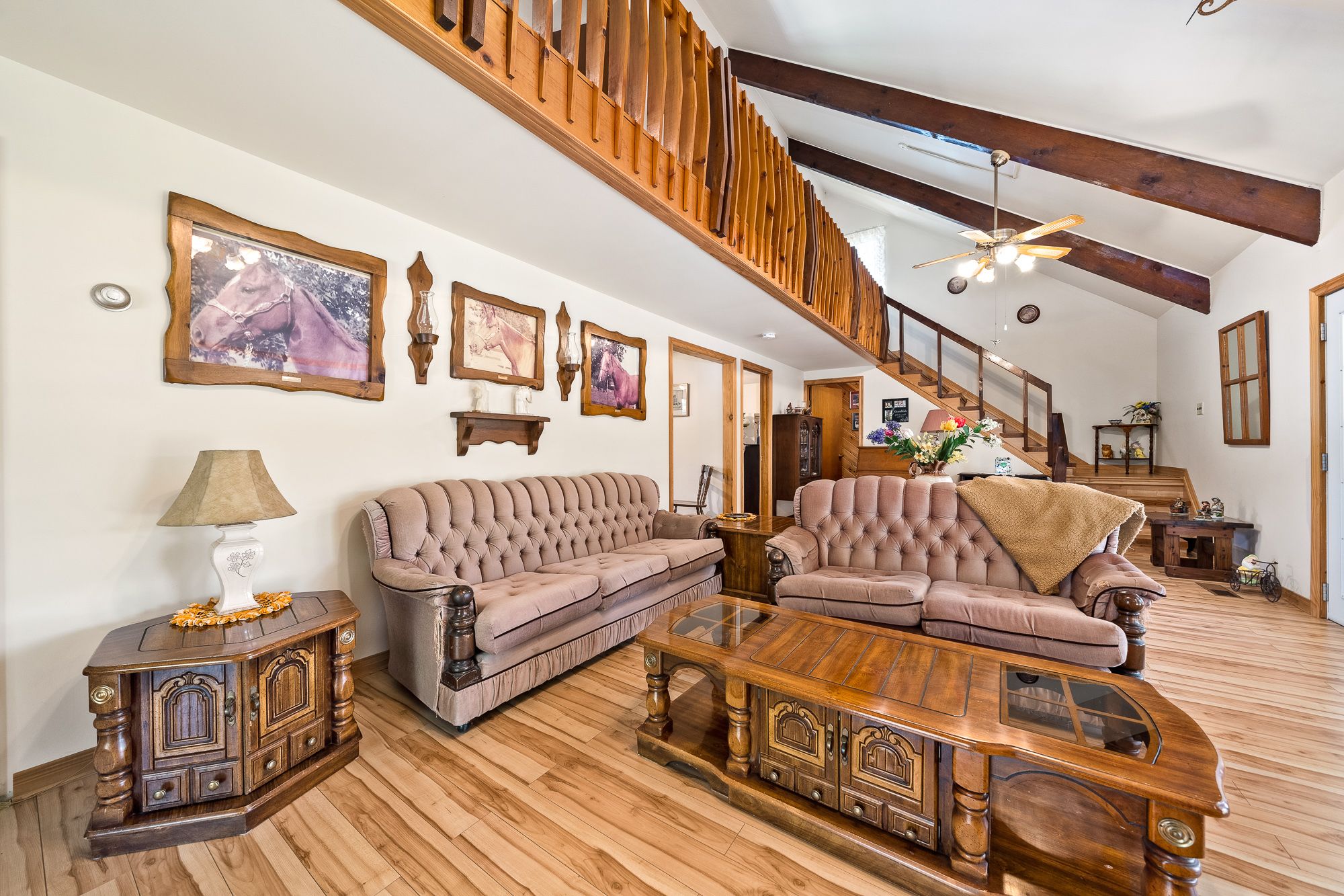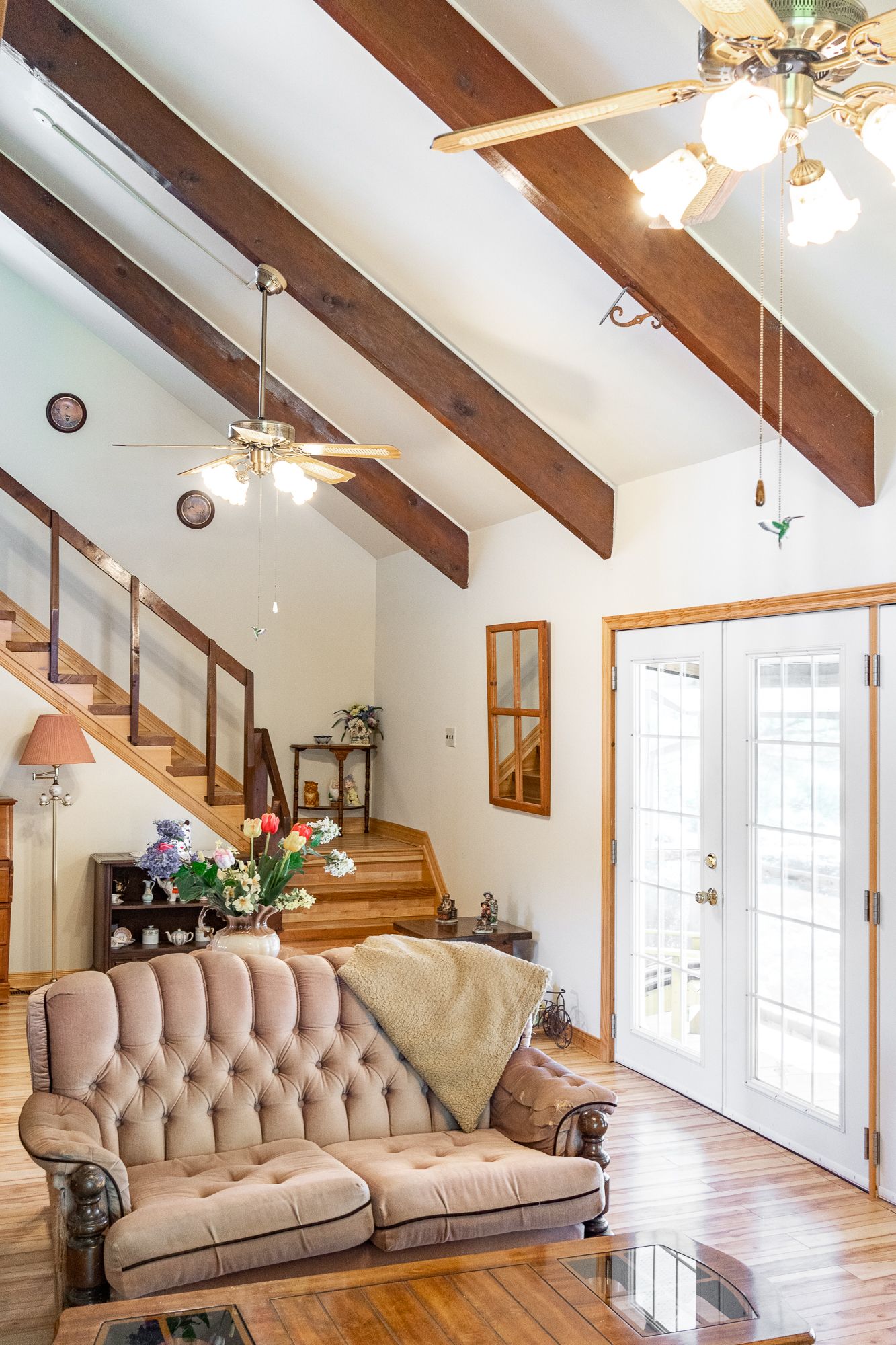 This custom built home has been loved and cared for and it shows from the beautiful landscaped yard, gardens and inground pool to the solid bones of a well built, unique home. Main floor offers kitchen and dining area that leads into a huge living room with 2 storey ceilings, hardwood floors and gorgeous real wood exposed beams. Second floor is an open hall looking down into the living area with the primary bedroom, bath and another large bedroom. Both bedrooms have a walkout to a 2nd storey balcony with pastoral views of your 11+ acres. Walk out basement is finished as a recroom with an additional space for laundry/utility. Your paved driveway leads to the huge detached garage and an in-law suite at the back with tons of income potential! 11+ acres with 400' of road frontage. Possible severance.