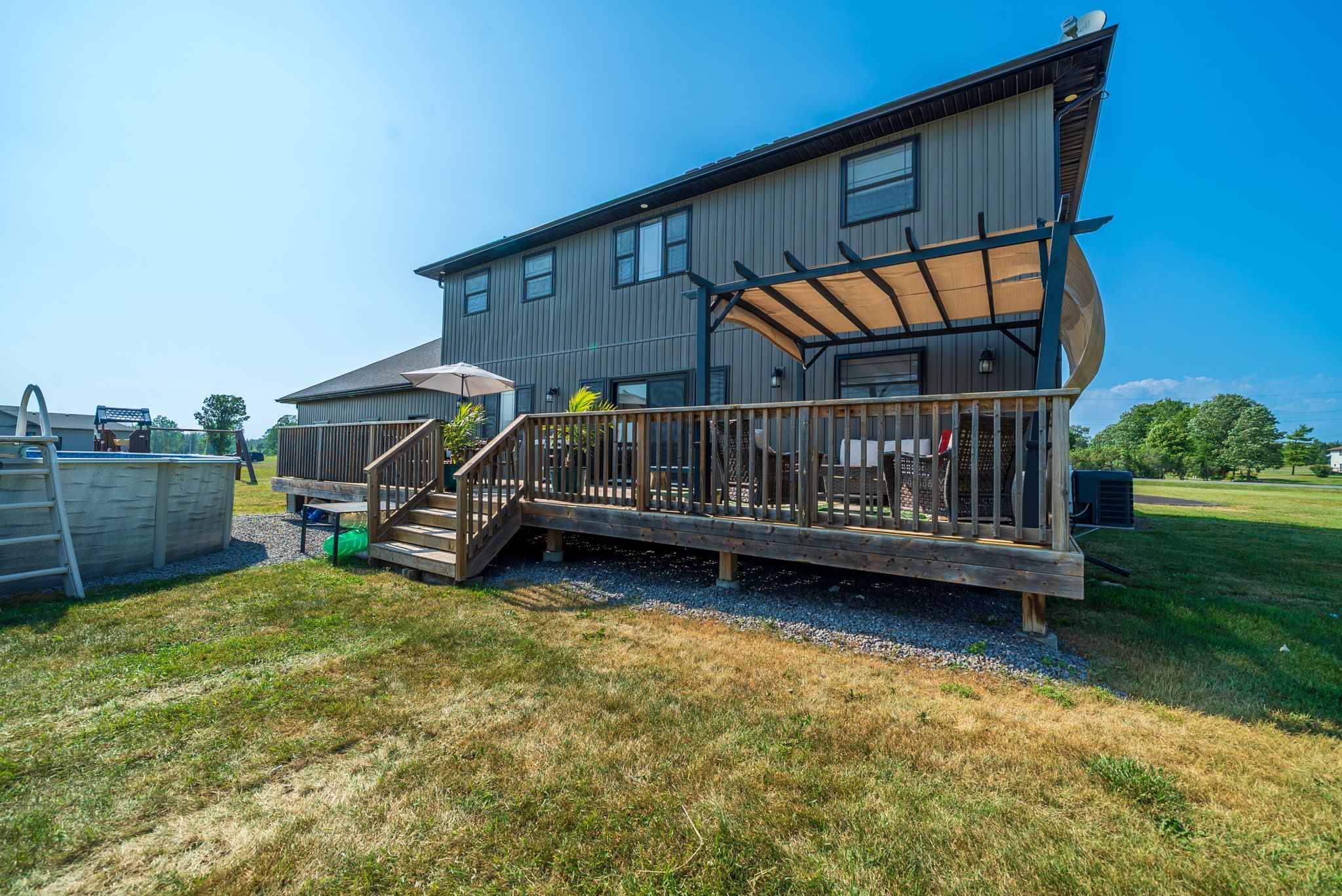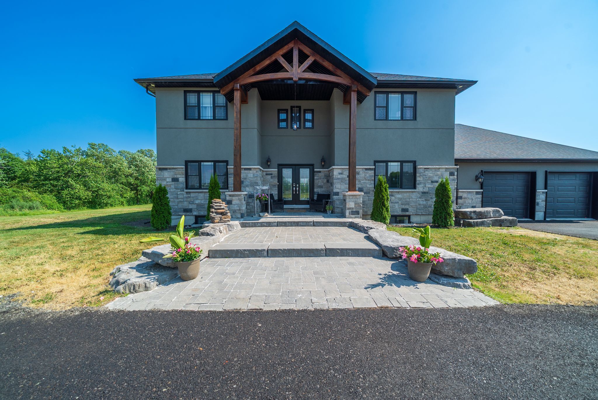 Welcome to your dream home, a breathtaking custom-built two-story residence that effortlessly combines luxury and comfort. As you approach the property, you'll be greeted by a circular driveway, and an attached two-car garage that adds convenience and ample space for parking. The grand entrance is truly a sight to behold, featuring large, elegant wood beams that exude a timeless charm and glandular appeal. Step inside and immerse yourself in a sun-drenched space where an open-concept design seamlessly unites style and functionality. The expansive kitchen is a chef's delight, complete with a large center island, generous pantry, and a dining area that invites lively gatherings and memorable moments. The spacious living room, bathed in natural light, offers the tranquility of a serene retreat. Open the patio doors to a welcoming deck, perfect for an afternoon unwind, and enjoy your private above-ground pool with picturesque views of the peaceful pond beyond. Completing the main level is a chic 2-piece bathroom, a versatile den or office space for those who work from home, and a convenient mudroom with direct access to the garage. Ascend the stunning wood staircase to the second floor, where every detail has been crafted with care. Discover three beautifully appointed bedrooms and a well-equipped laundry room with a sink for added ease. The primary bedroom is a true oasis, featuring a walk-in closet and a luxurious 4-piece ensuite that promises relaxation with its indulgent soaker tub and sleek glass shower. The lower level offers even more, leading you to a vibrant finished recreation room, a perfect canvas for family entertainment or personal retreat. This level also includes a fifth bedroom, a 4-piece bathroom, and a generous utility room with abundant storage. This spectacular home is your sanctuary, where every corner is designed to inspire and comfort. Embrace the elegance, the space, and the breathtaking views this is a property not to be missed!