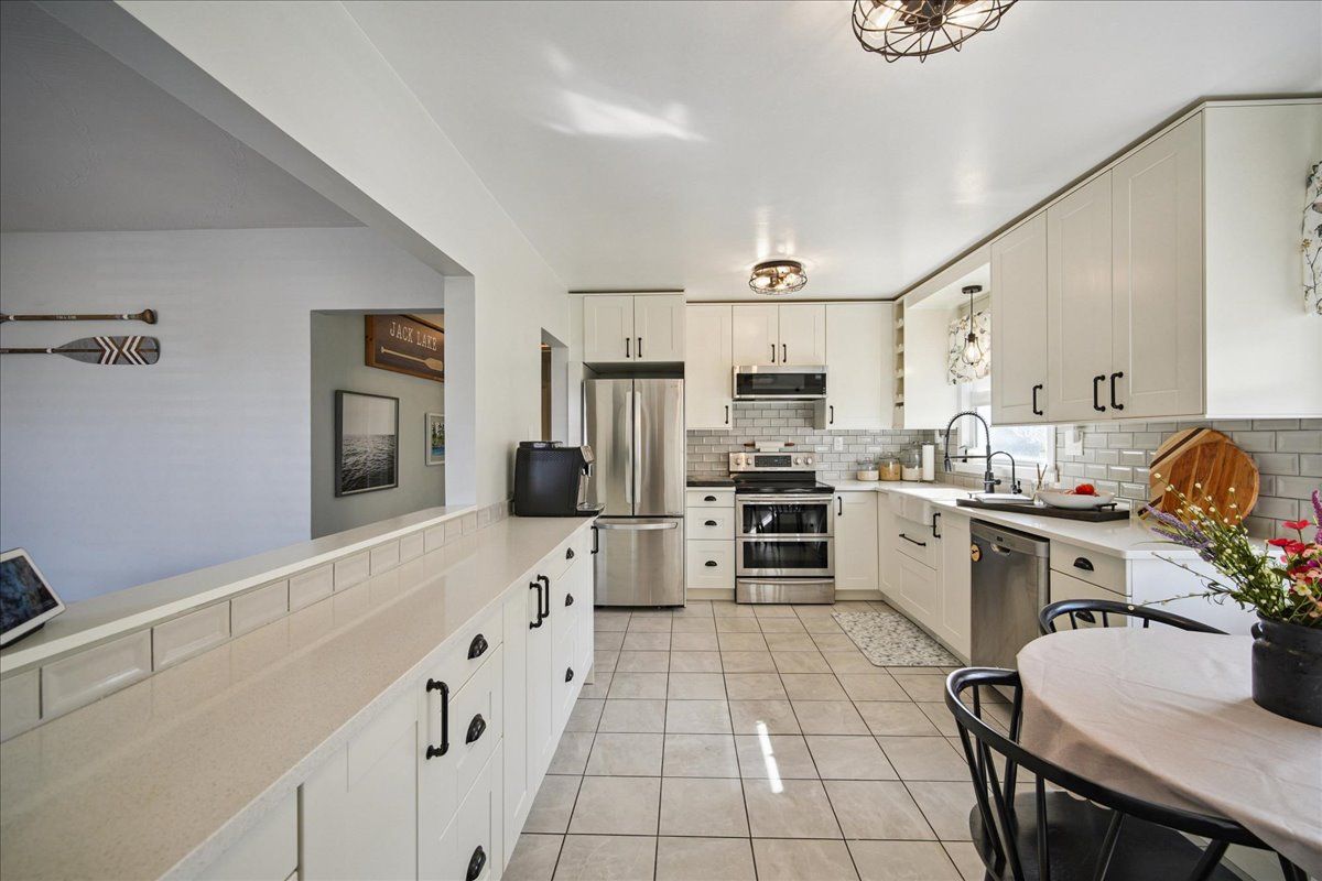 • Updated kitchen featuring quartz counters and stylish ceramic floors.