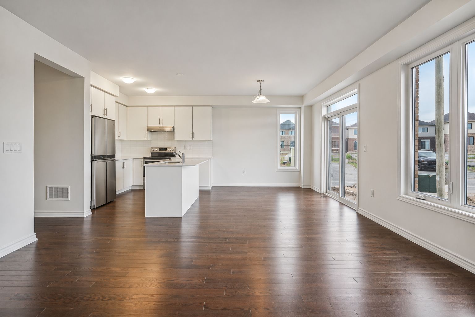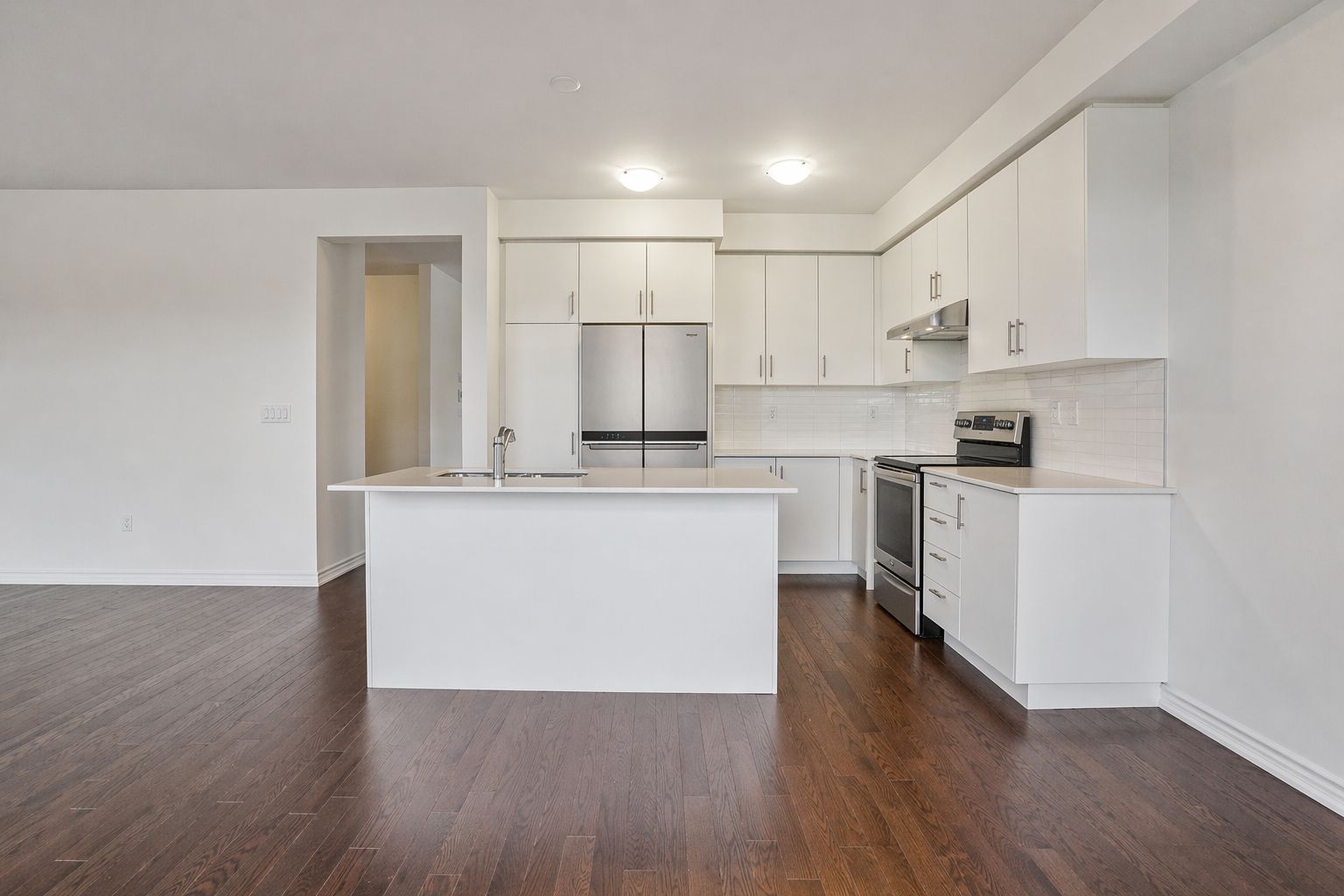 • Open-concept layout with 9-ft ceilings and hardwood flooring throughout.
