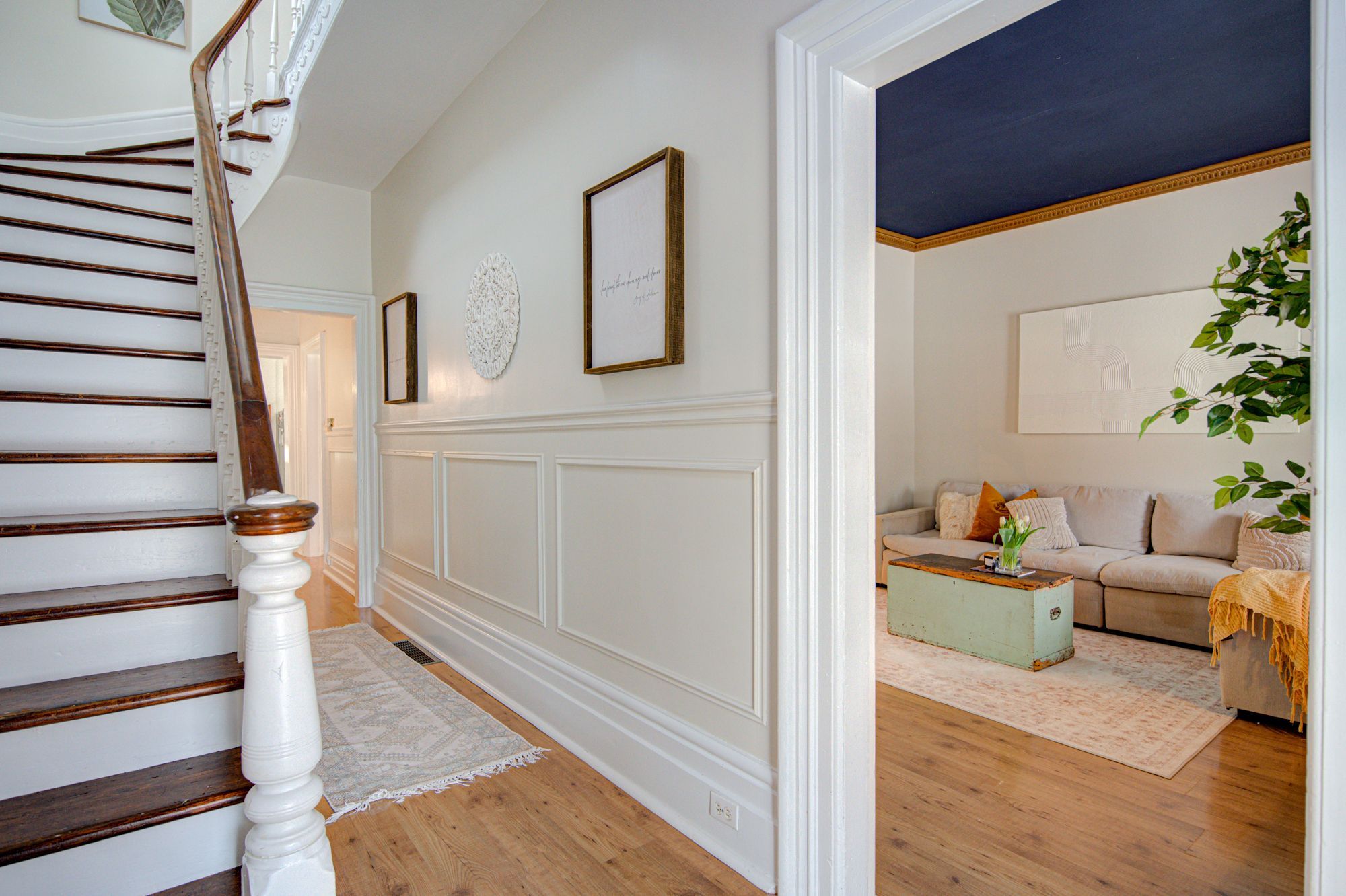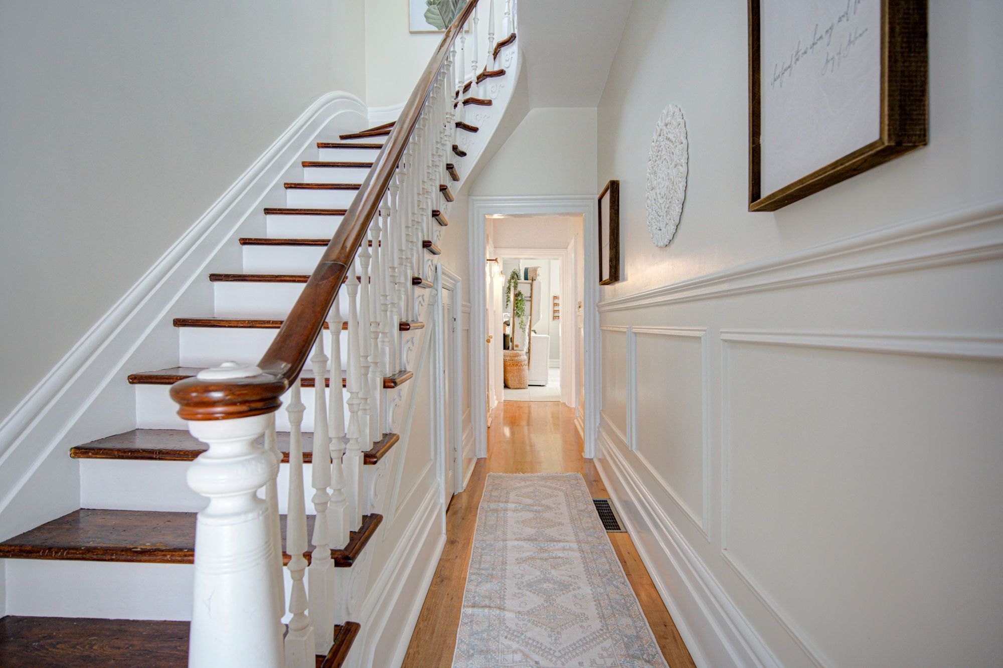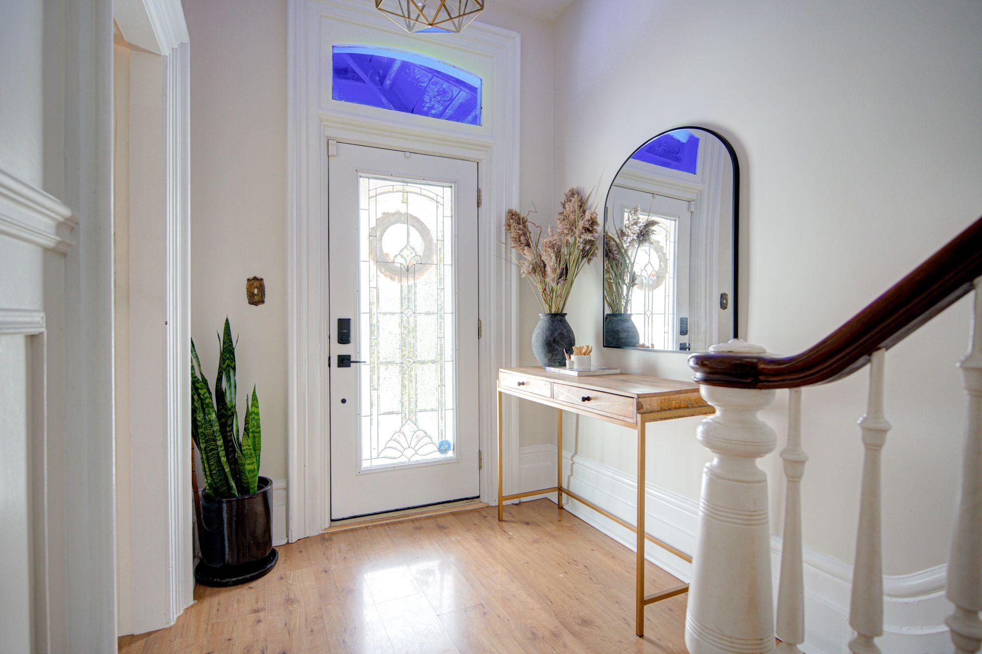 • Spacious foyer with original stair rails and elegant craftsmanship.