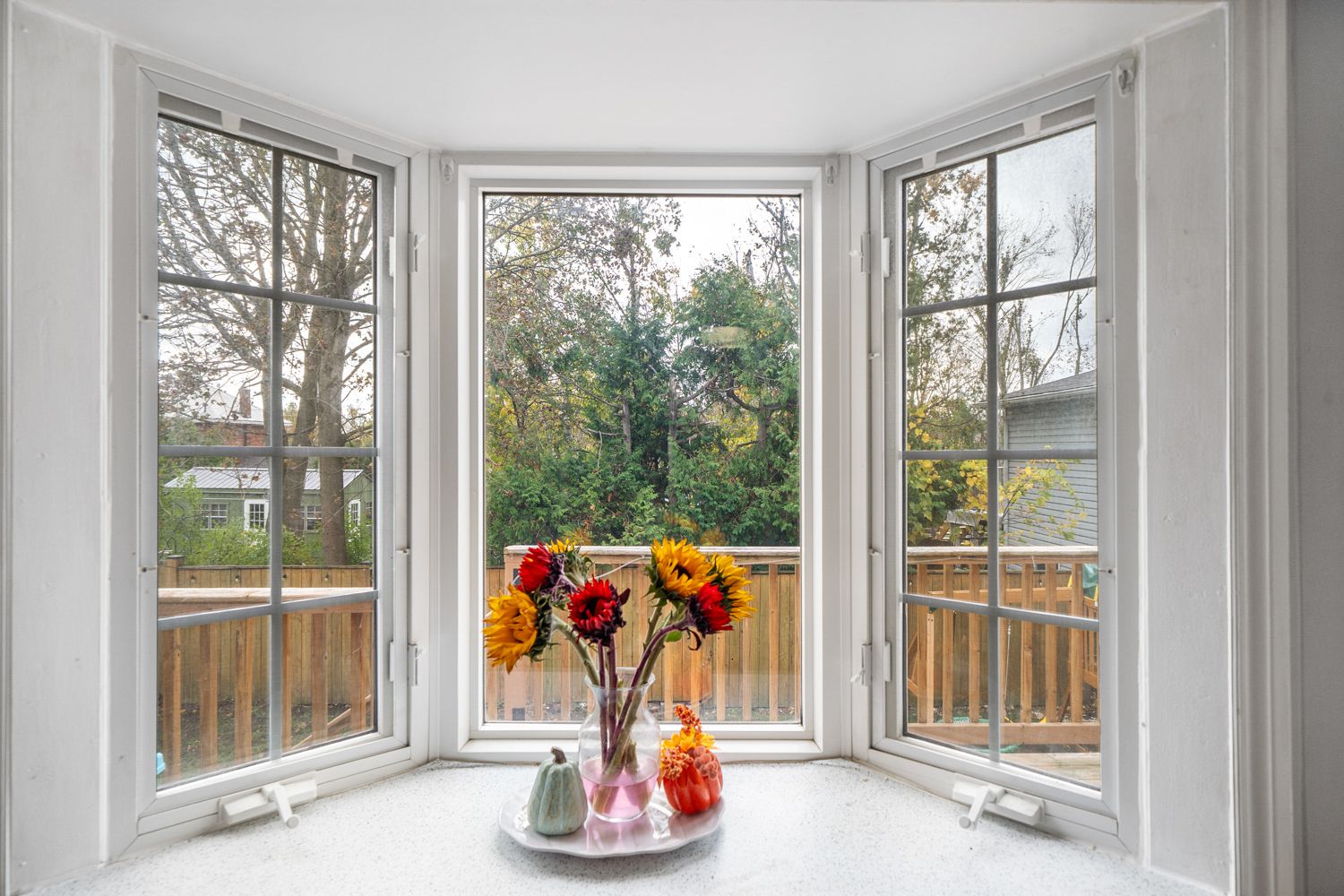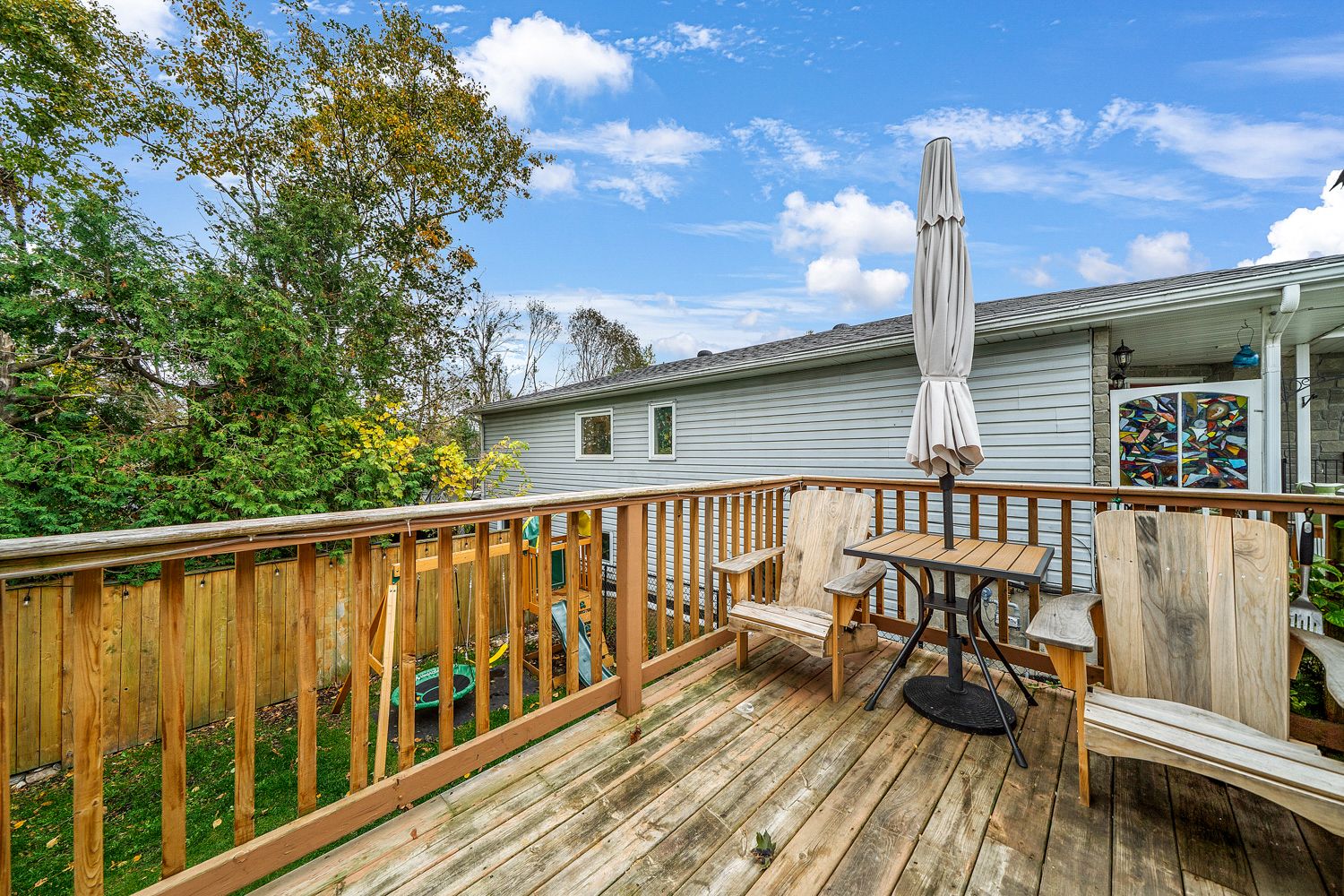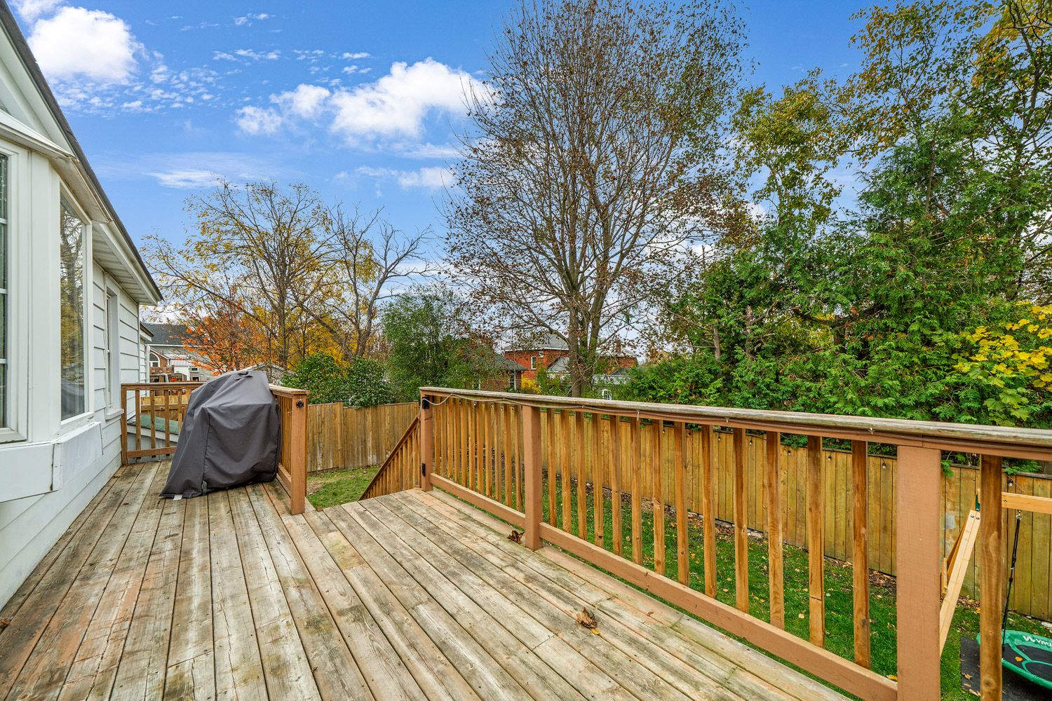 • Fenced backyard with mature trees, deck, and cozy sunroom.
