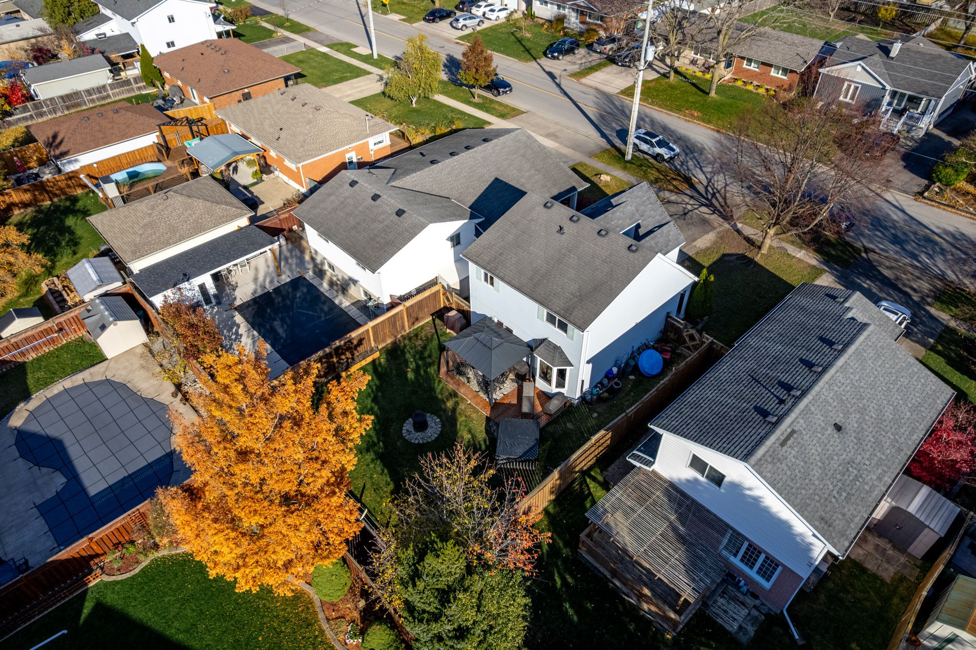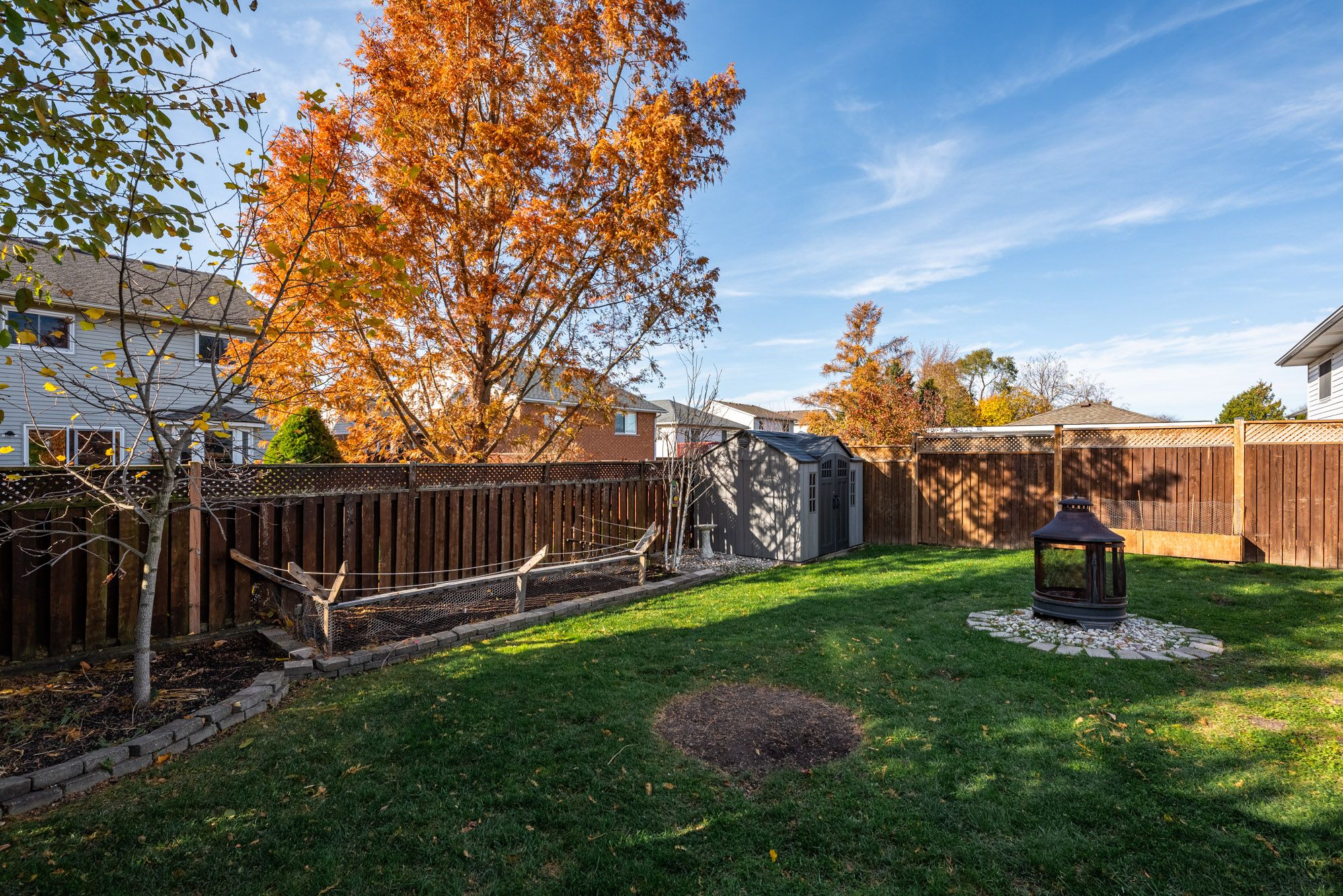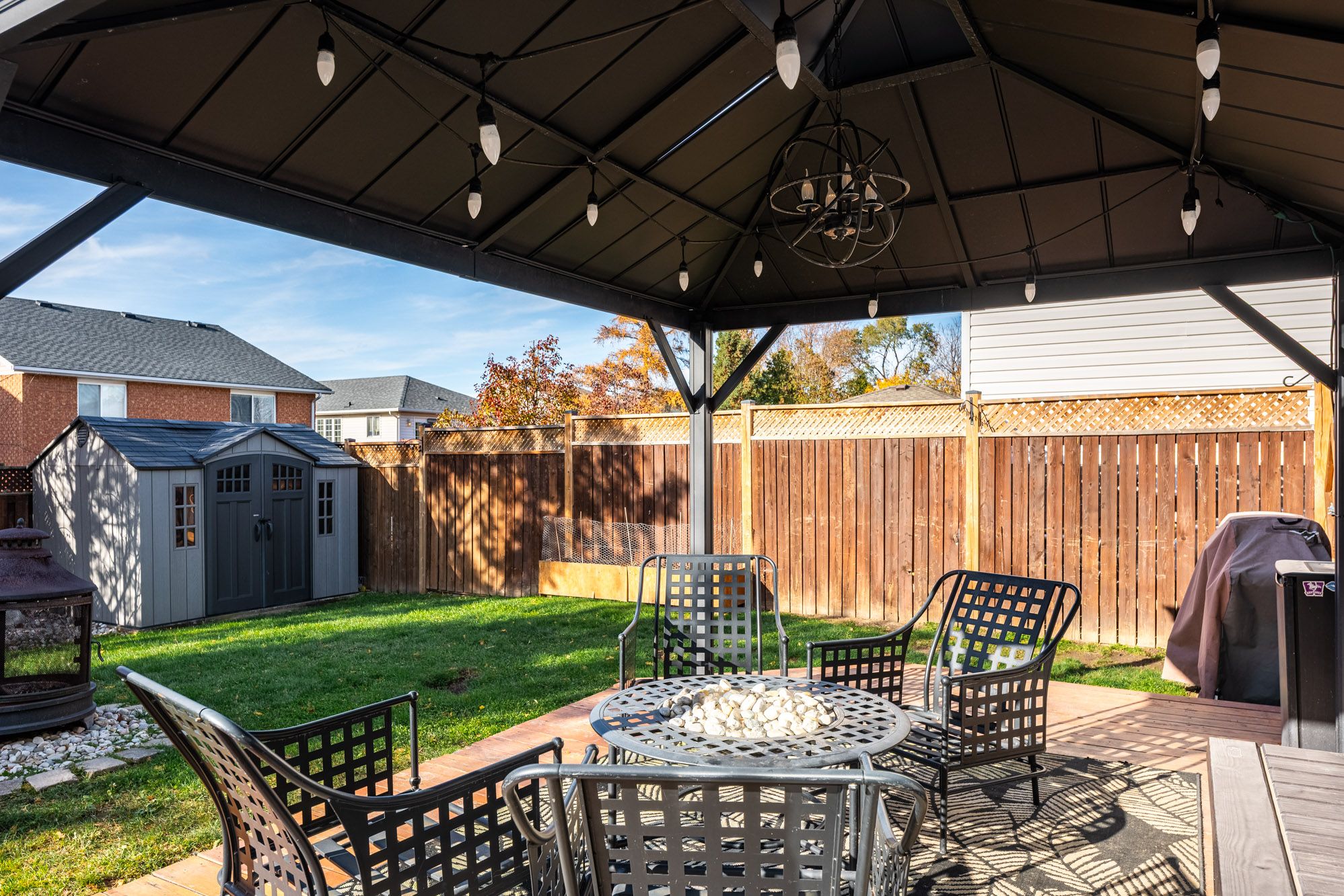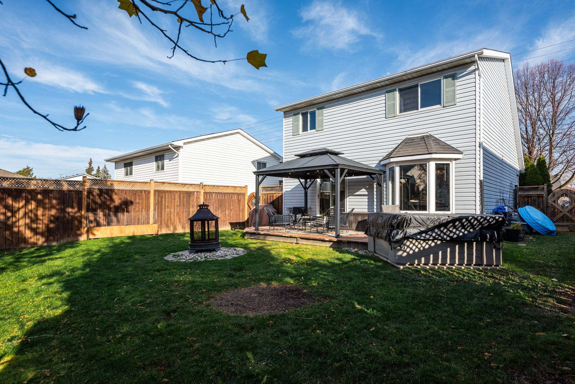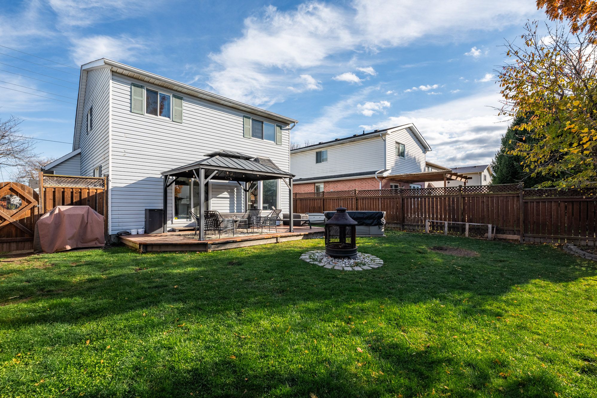 • Fenced backyard features a deck, pergola, and hot tub for relaxation.