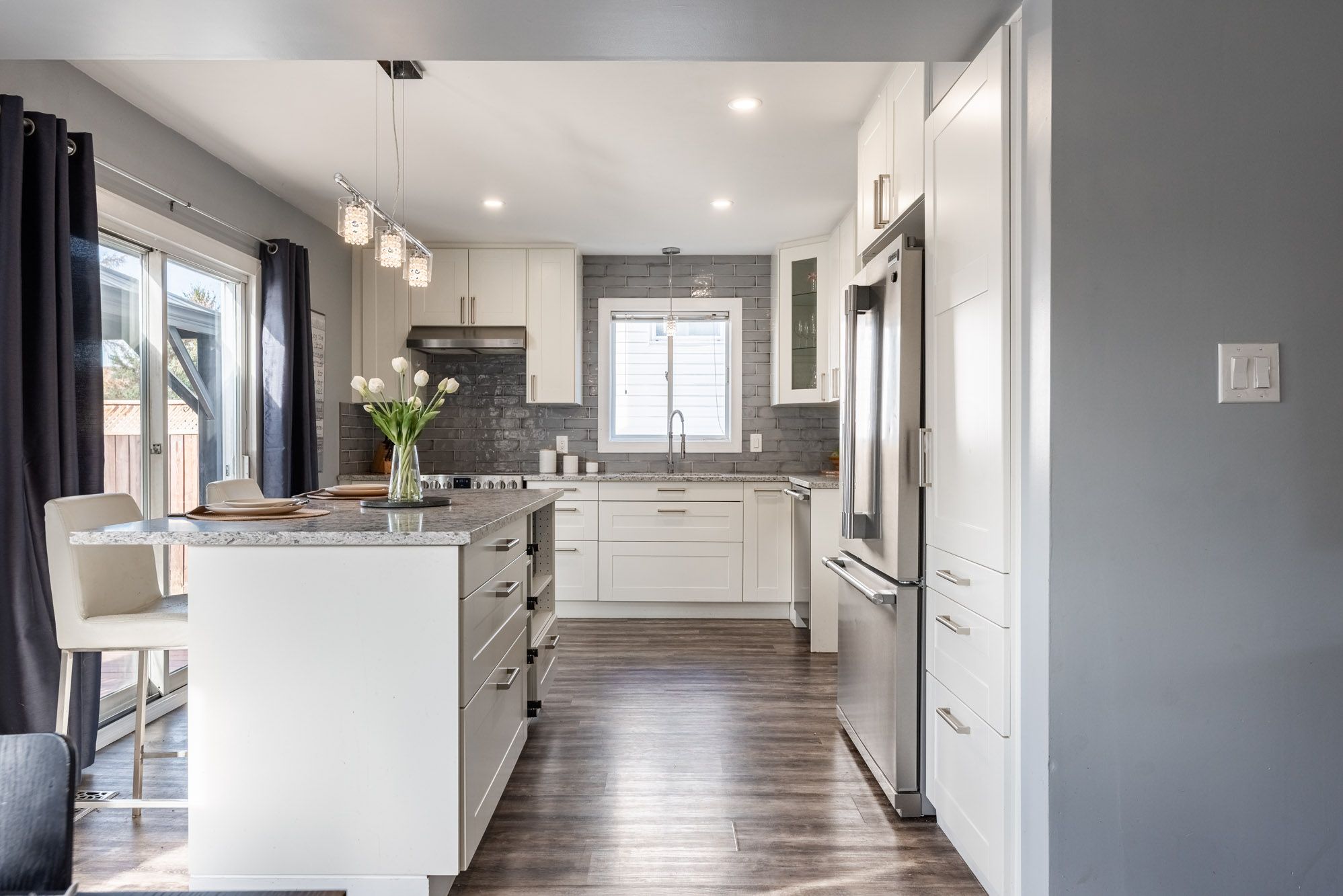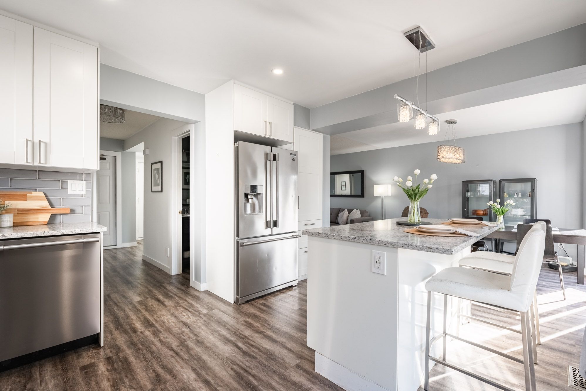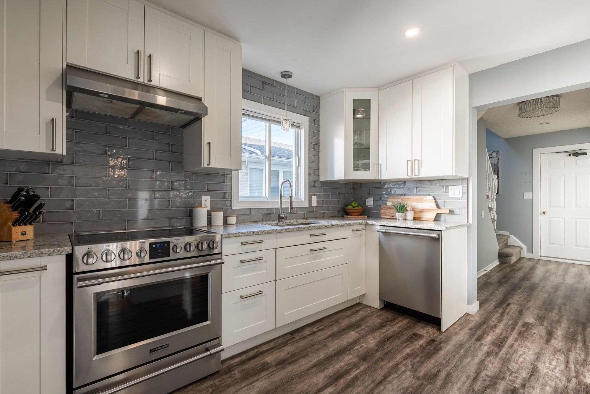 • Renovated eat-in kitchen with quartz counters and modern stainless steel appliances.