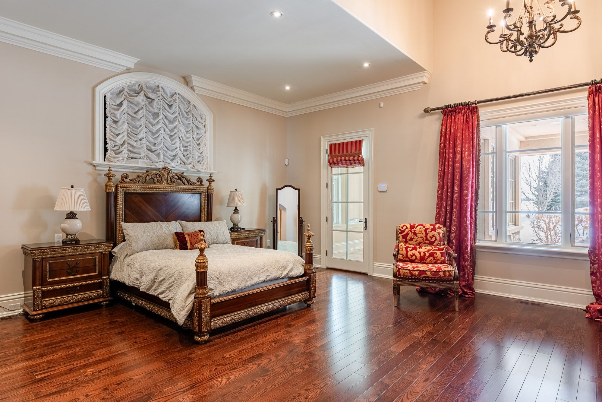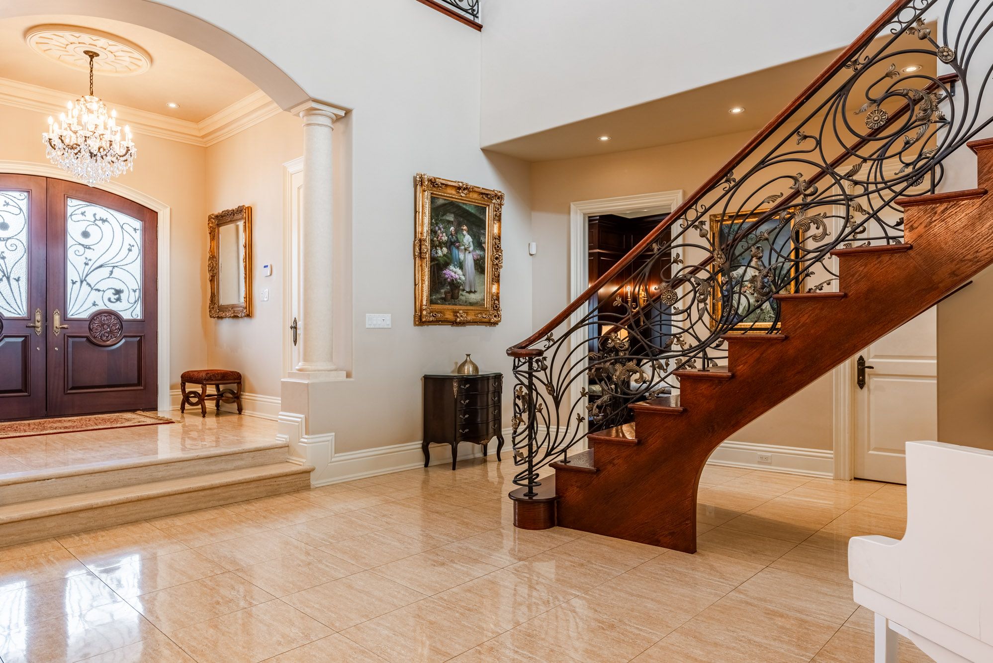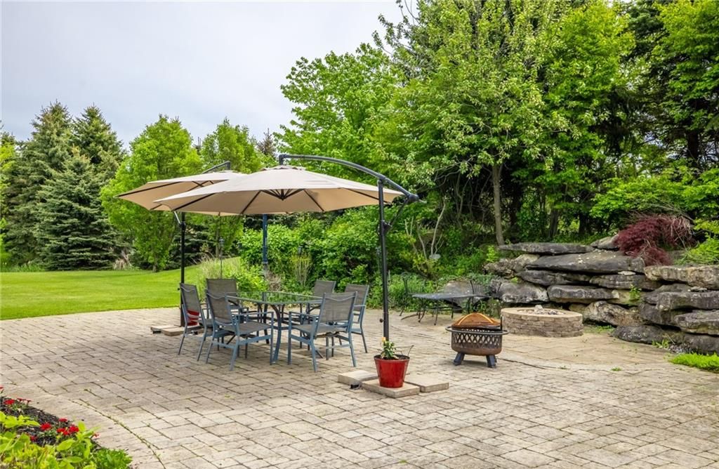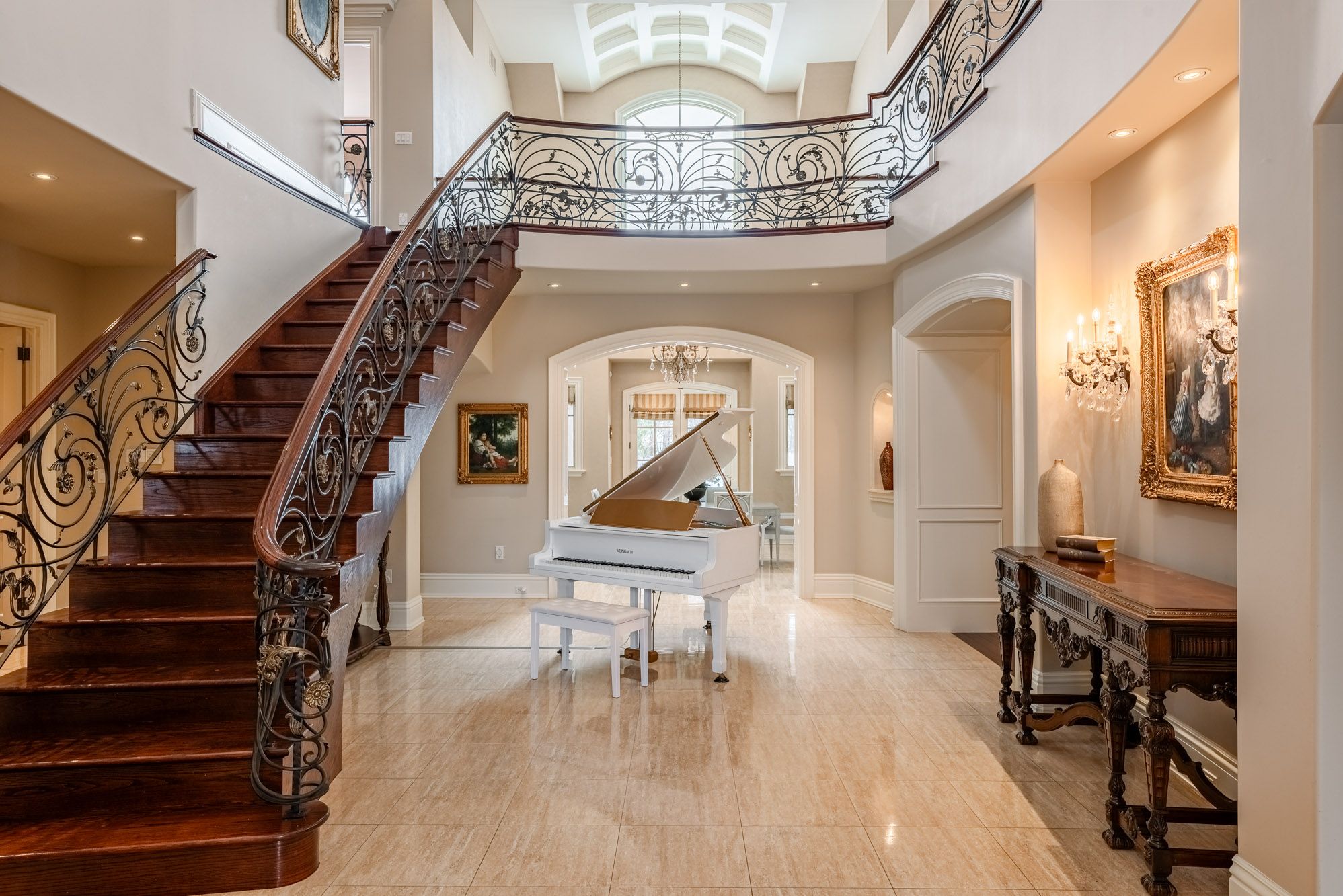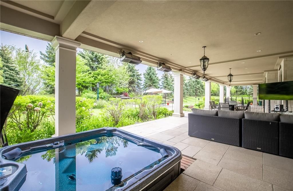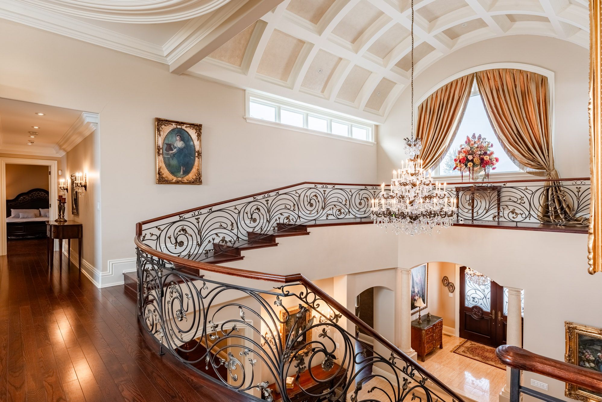 Impeccably nestled in the bluffs, this extraordinary estate spans over 11,000 sqft. Of luxurious living space on approx two acres of treed property. Blending modern sophistication with traditional elegance, this home offers an unparalleled lifestyle in a breathtaking setting. From the moment you step into the grand foyer, the impeccable craftsmanship and seamless flow set the tone for refined living. Architectural excellence is showcased through soaring coffered ceilings, expansive windows, & an intricate wrought-iron staircase. The chefs kitchen is a culinary masterpiece, boasting a walk-in pantry, top-tier custom cabinetry, & premium appliances. A spacious breakfast room opens to the beautifully landscaped backyard, where a heated covered lanai provides the perfect setting for outdoor relaxation. The main-floor primary suite is a private retreat, featuring a cozy f/p, his and her walk-in closets, & a lavish 6pc spa-inspired ensuite. Adding to its allure, an adjoining sunroom offers direct access to the backyard, creating a seamless indoor-outdoor experience. A richly appointed home office, complete with wood paneling & built-in cabinetry, provides an ideal workspace. The second level hosts 3 additional bedrooms, while the lower level is designed for ultimate comfort, entertainment, & hosting unforgettable events. Here, youll find a full bar, oversized wine cellar, & a dance floor, along with a state-of-the-art home theatre, a gym, a gentlemans cigar room, & a spa-inspired bath with a stone steam sauna, walk-in shower, & radiant floor heating. A 5th bedroom completes this level, offering flexibility for guests or extended family. For car enthusiasts, the impressive heated 3-car garage is outfitted with 2 lifts, allowing for up to 6 vehicles to be stored with ease. Built-in speakers throughout the home further enhance the ambiance, providing a seamless audio experience indoors & out. Minutes from major highways & burlingtons finest amenities. Luxury certified