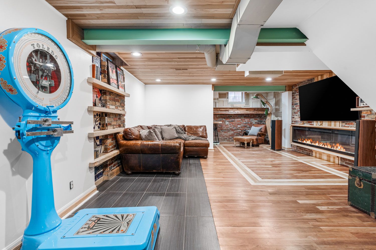 • Finished lower level with unique design details and spacious fireplace.