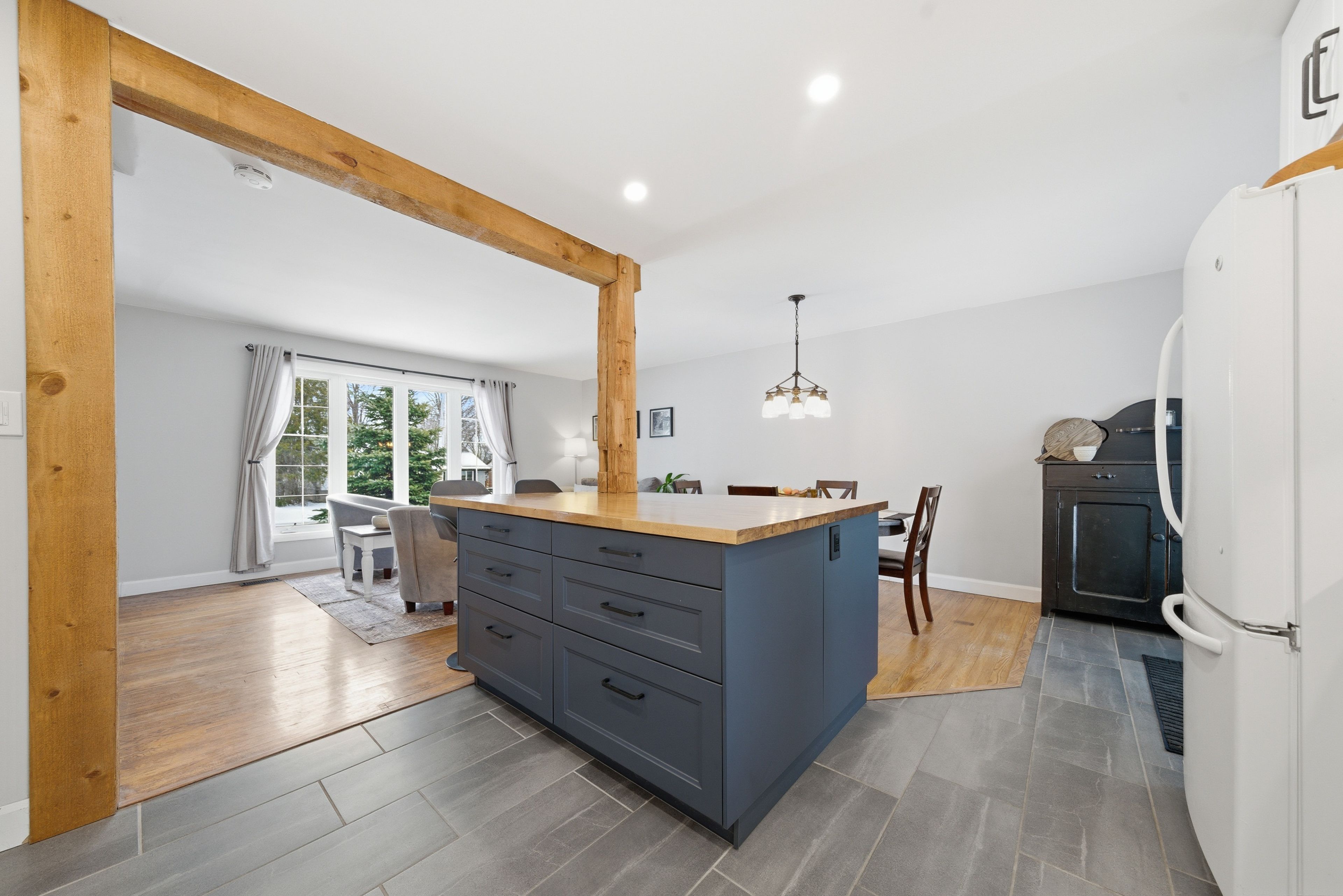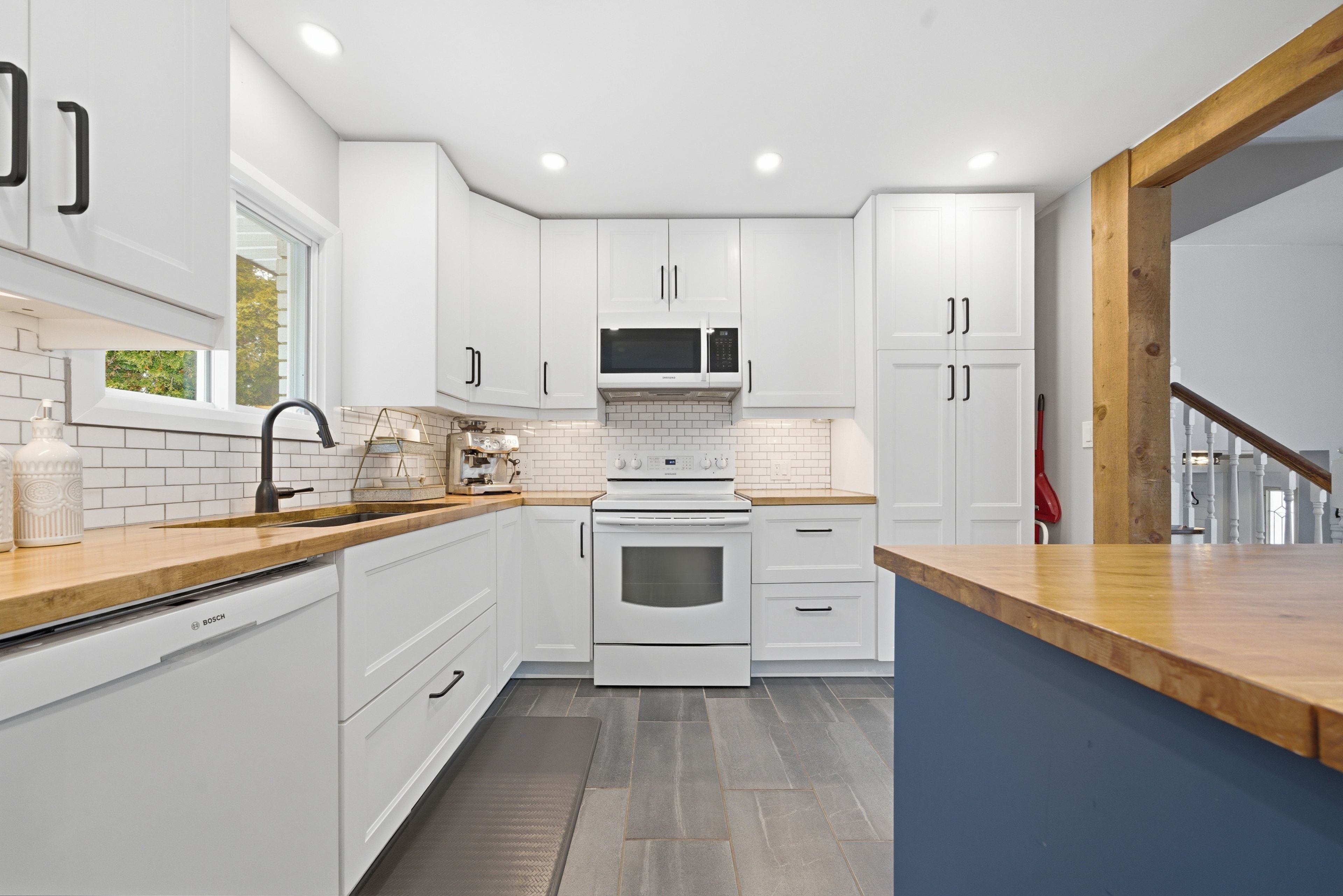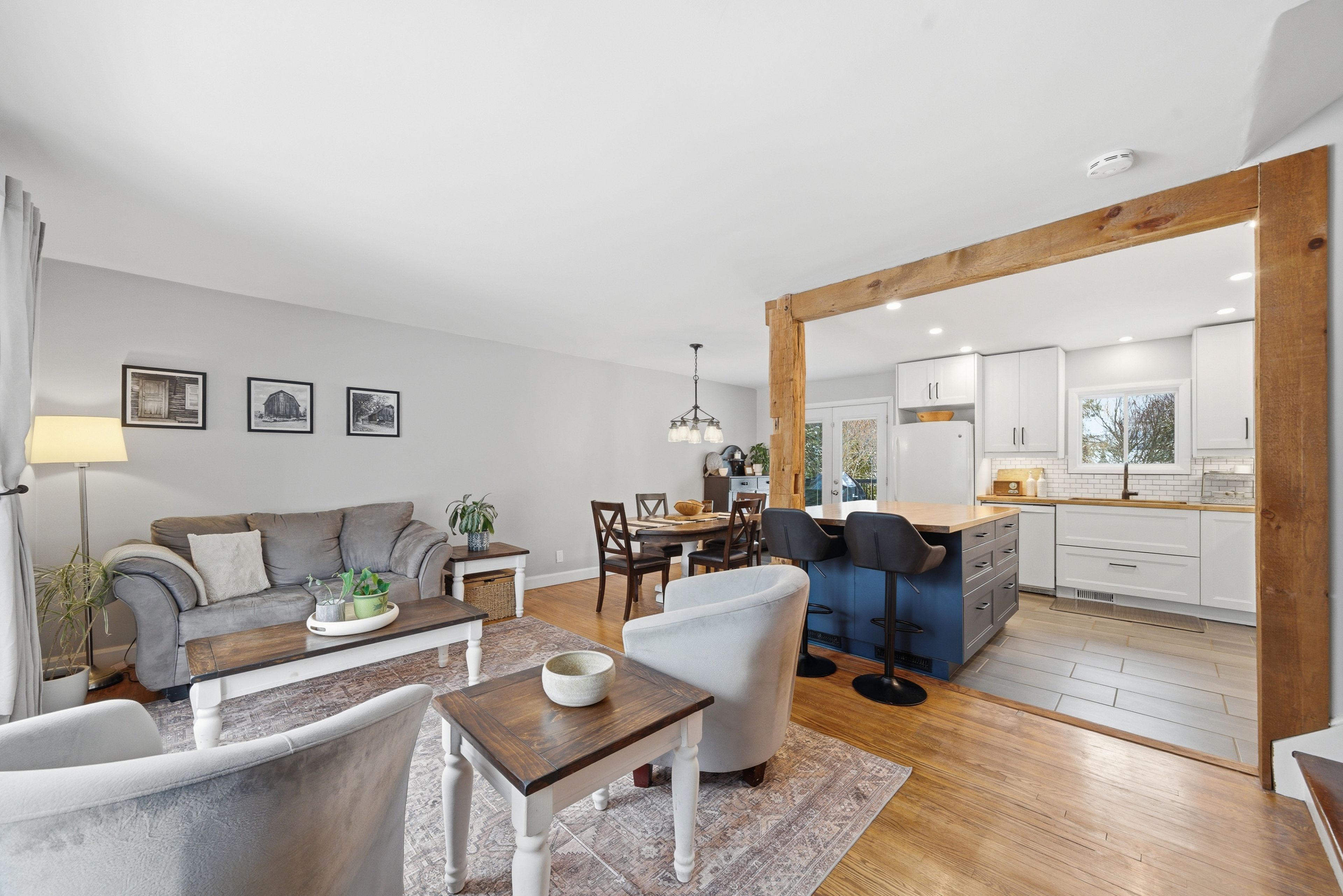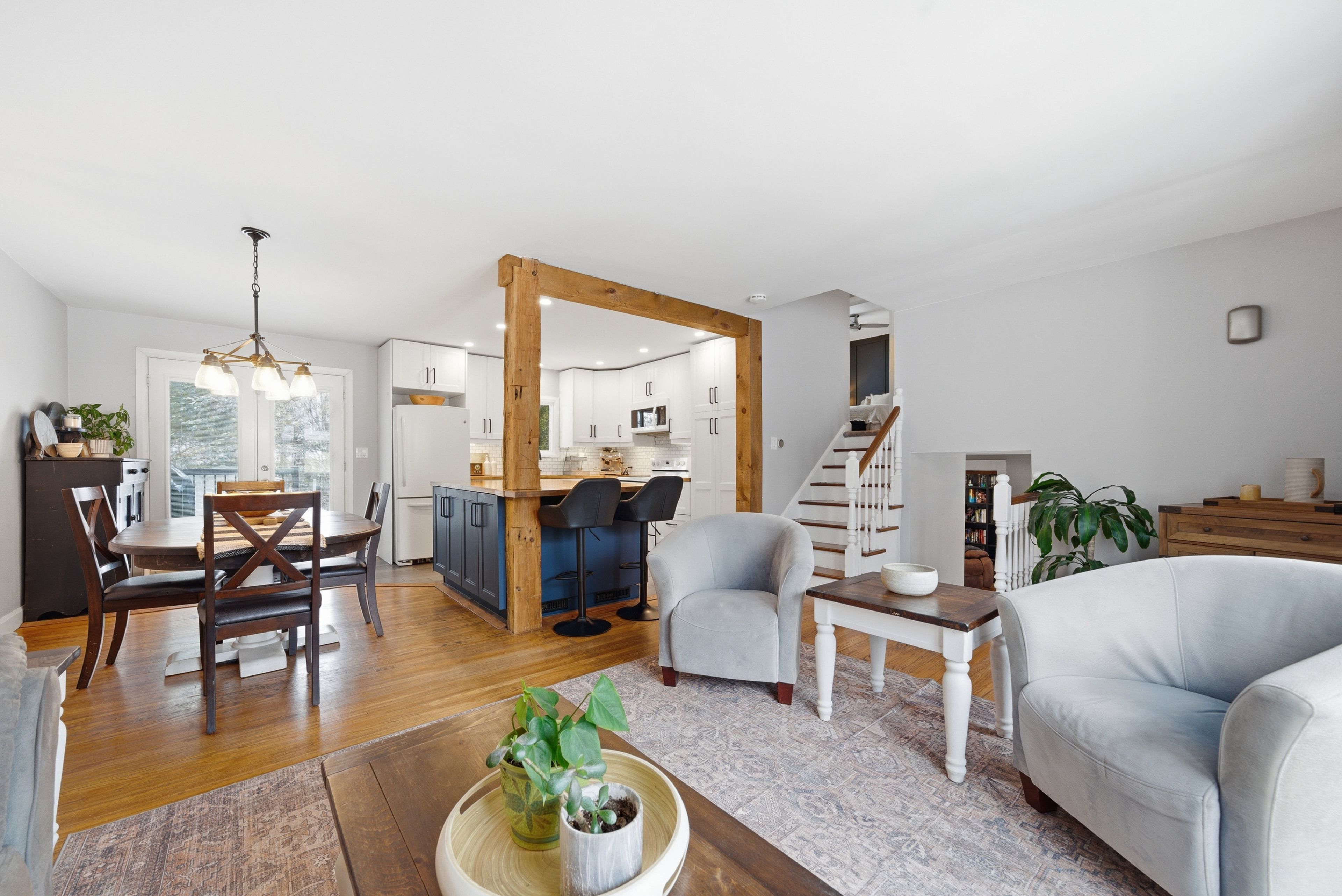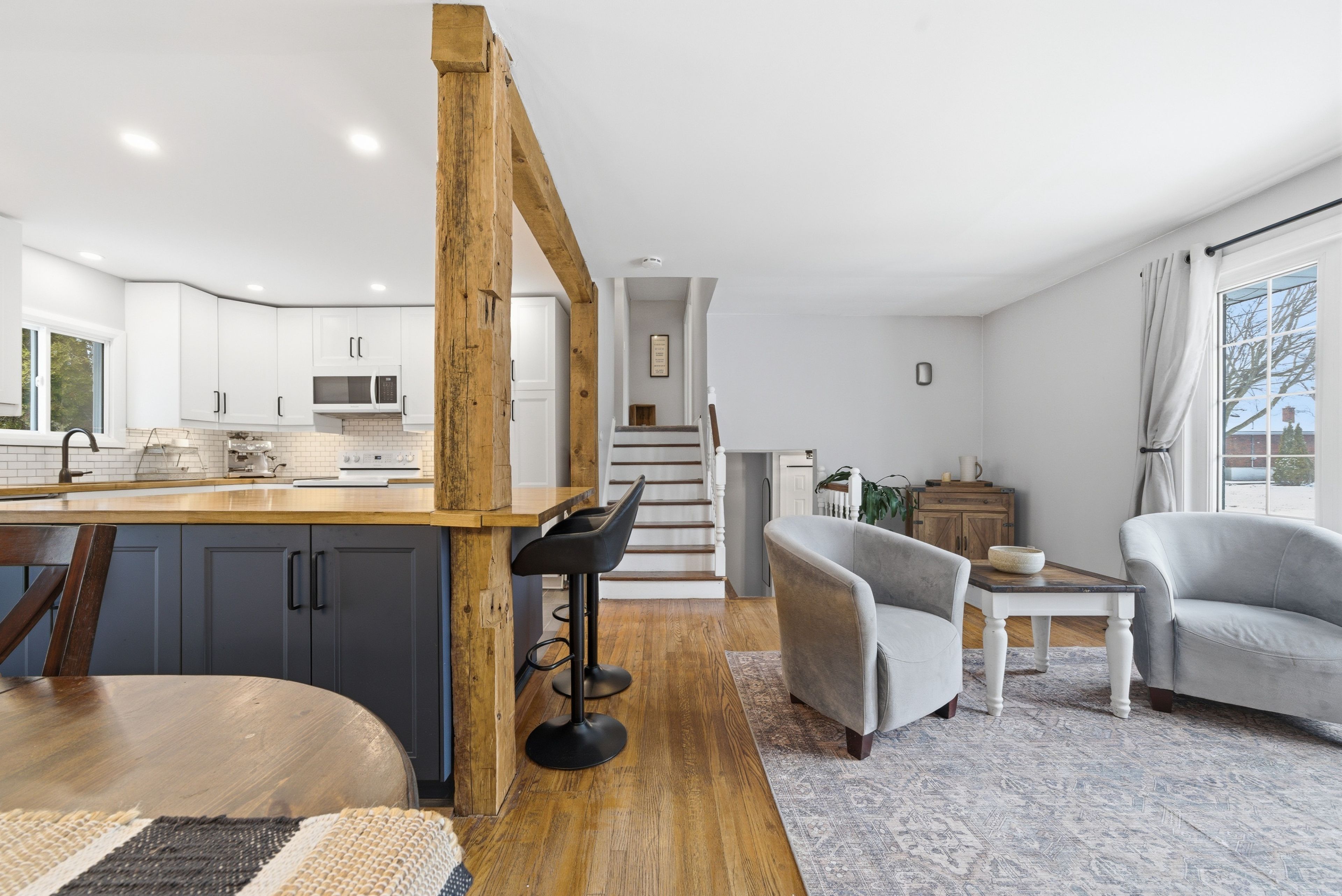 • Bright open-concept layout includes a farmhouse-style kitchen and spacious living area.