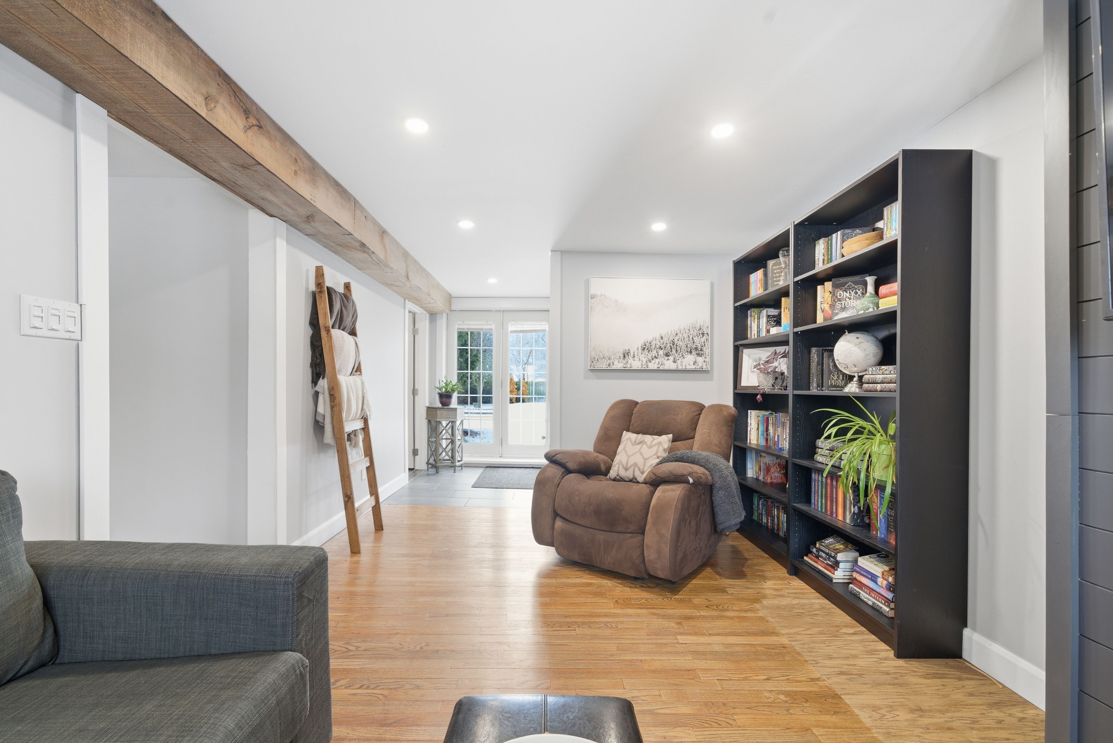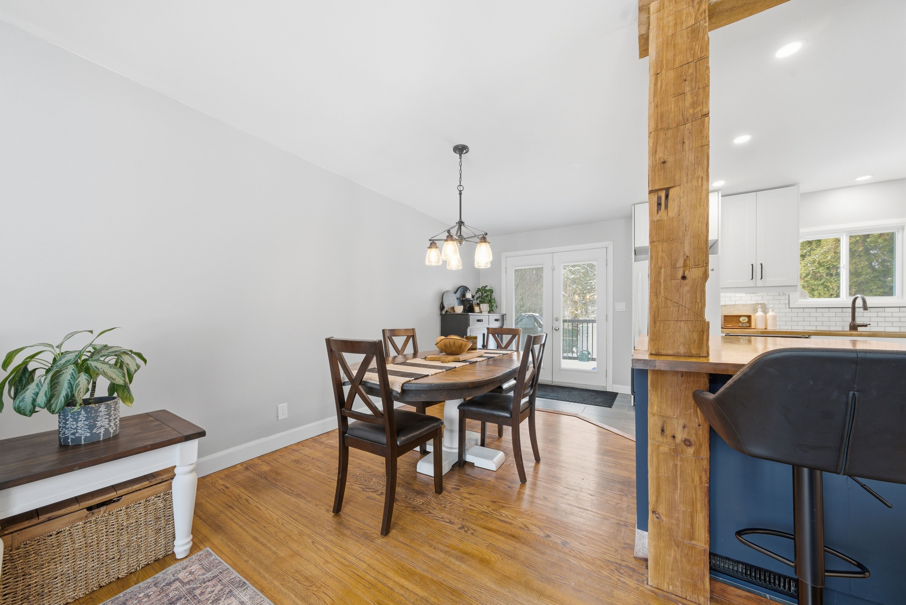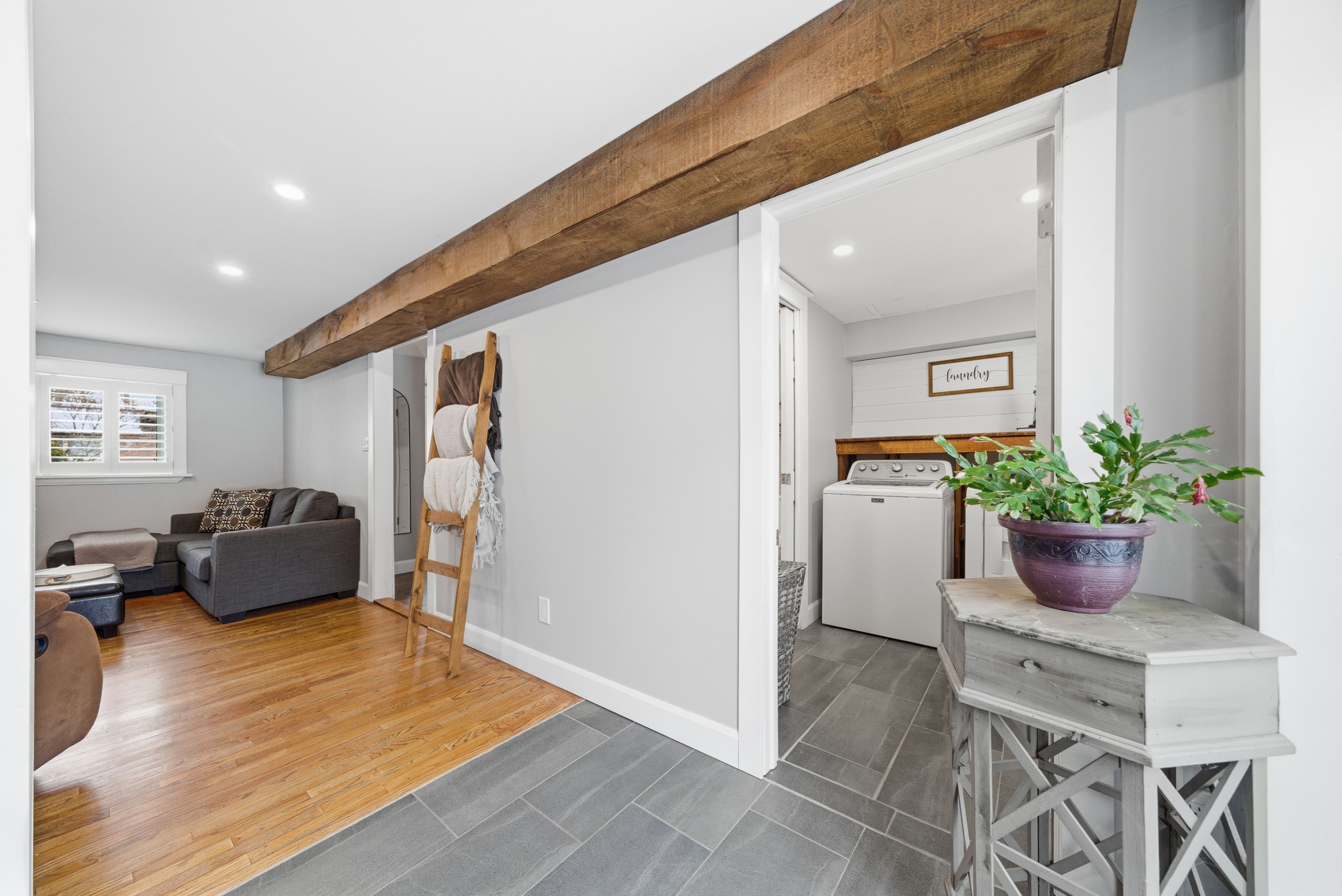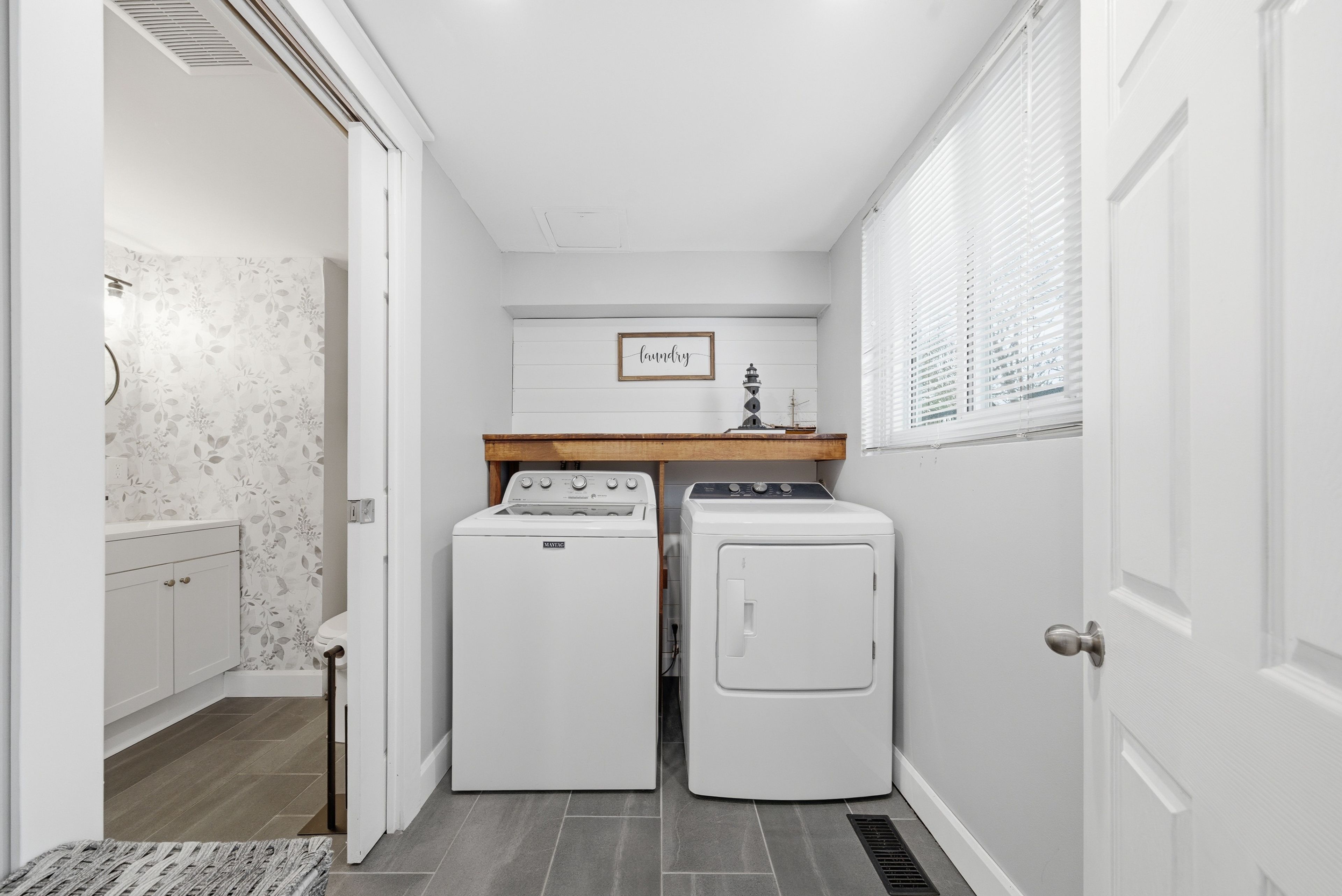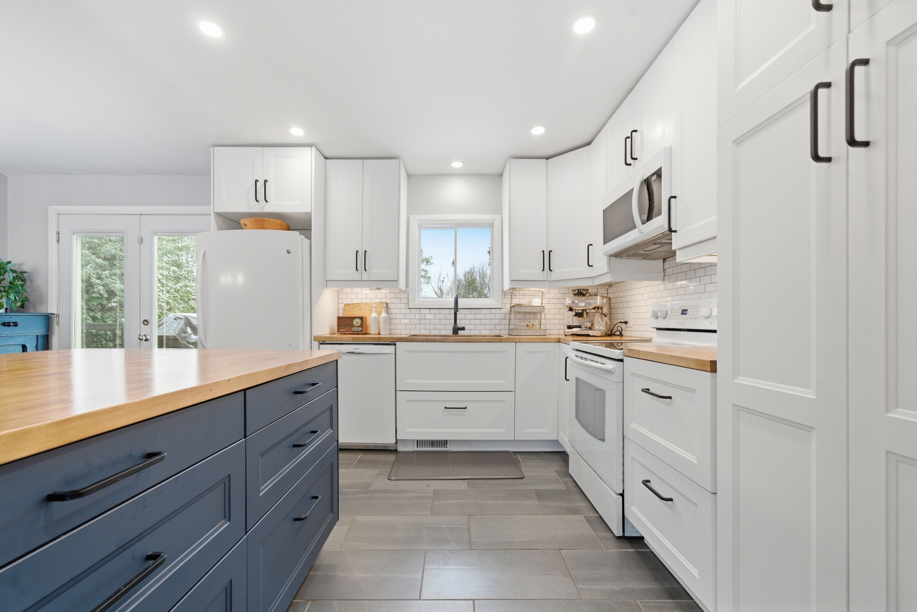 • Bright open-concept layout includes a farmhouse-style kitchen and spacious living area.
