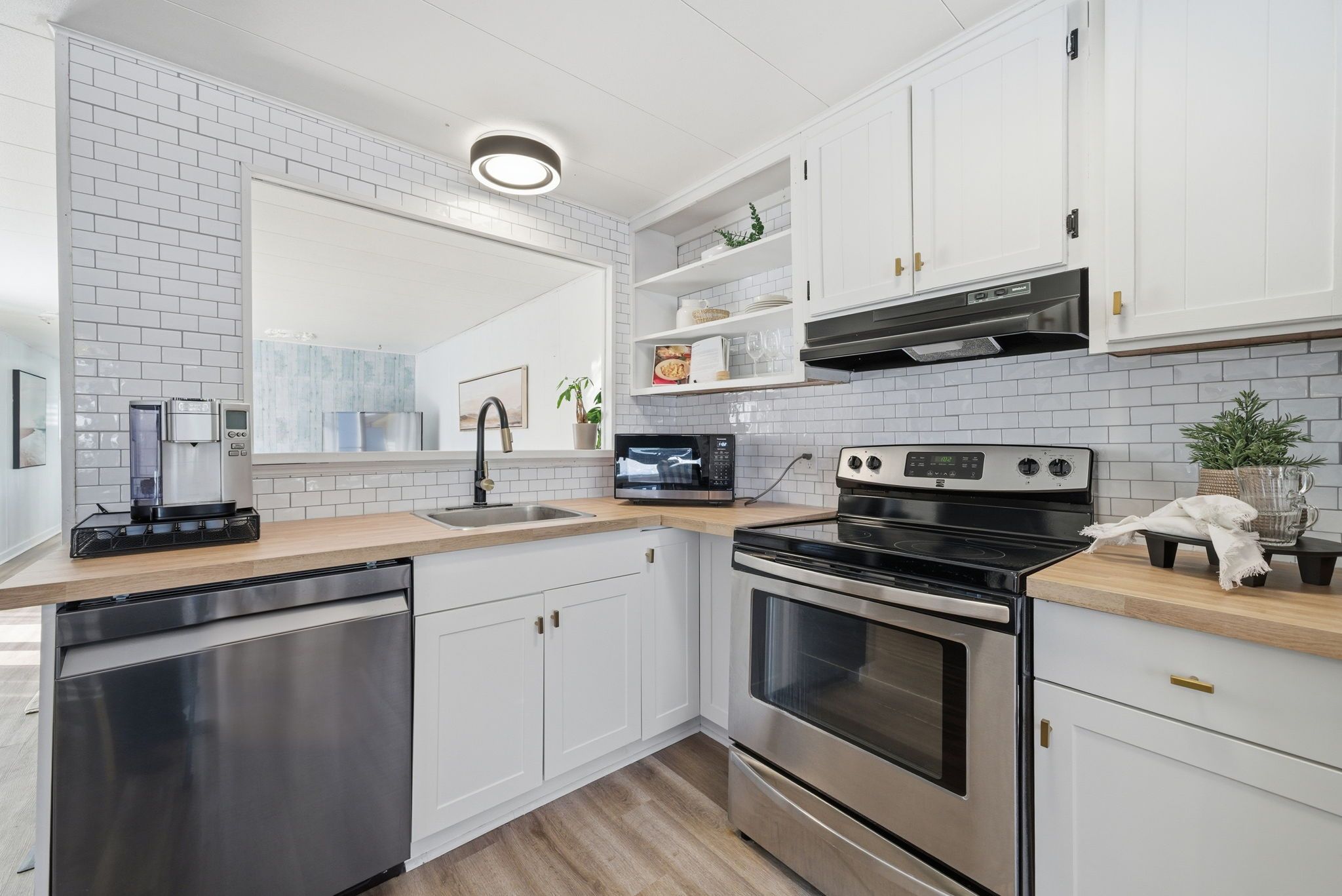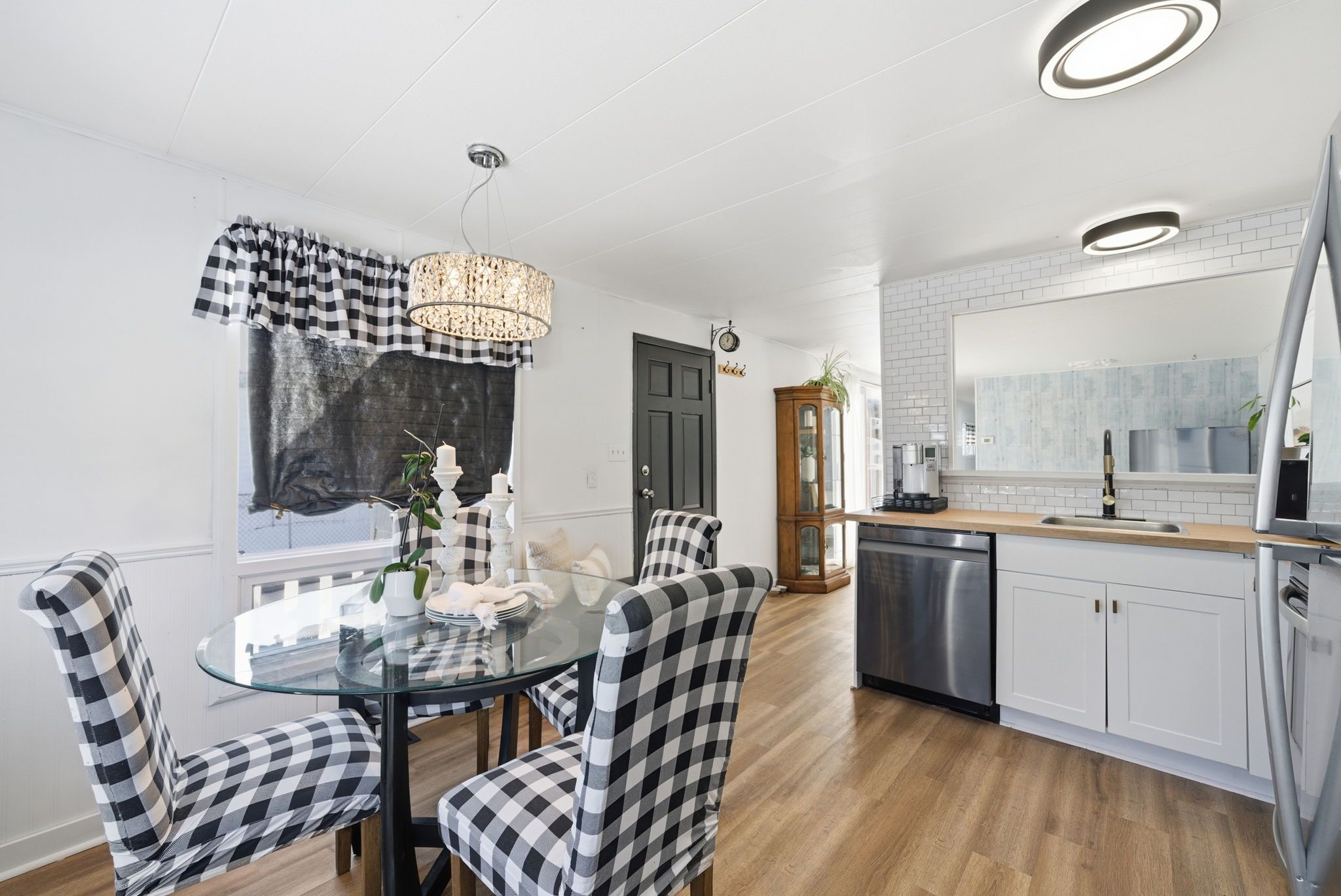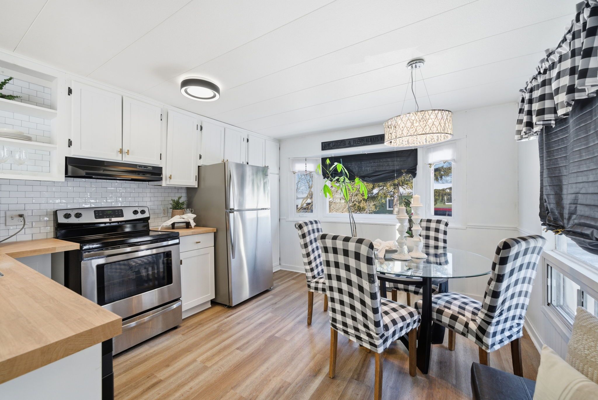 • Updated eat-in kitchen with modern tile finishes enhances functionality.