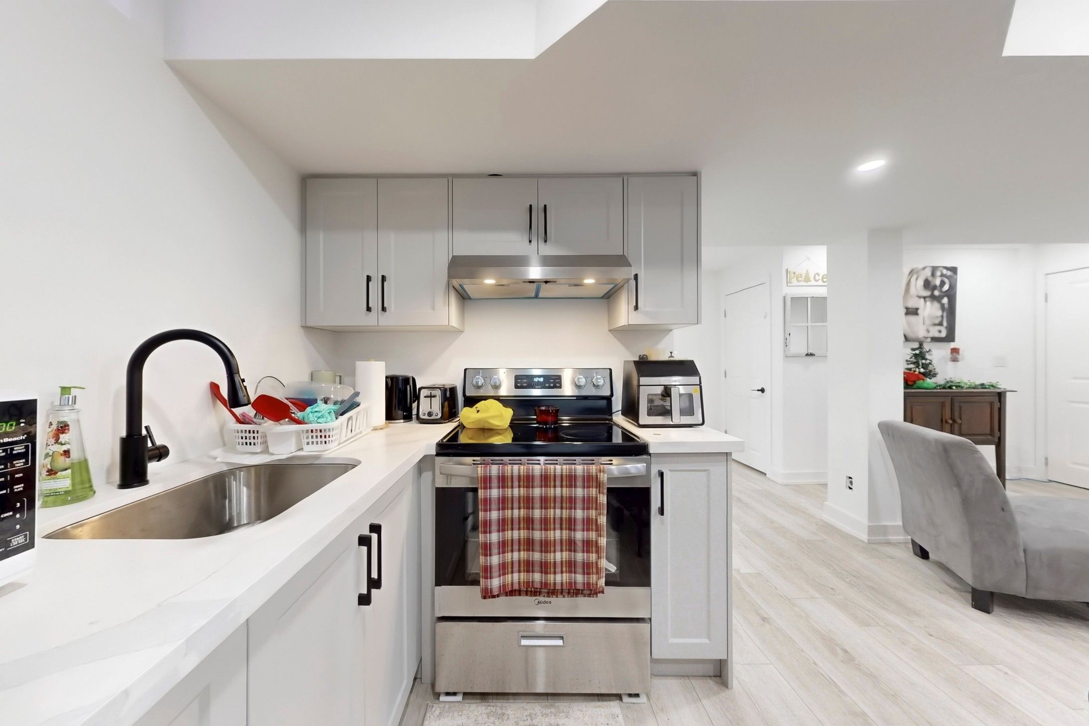 • Functional kitchen featuring stainless steel appliances and ample cabinetry.