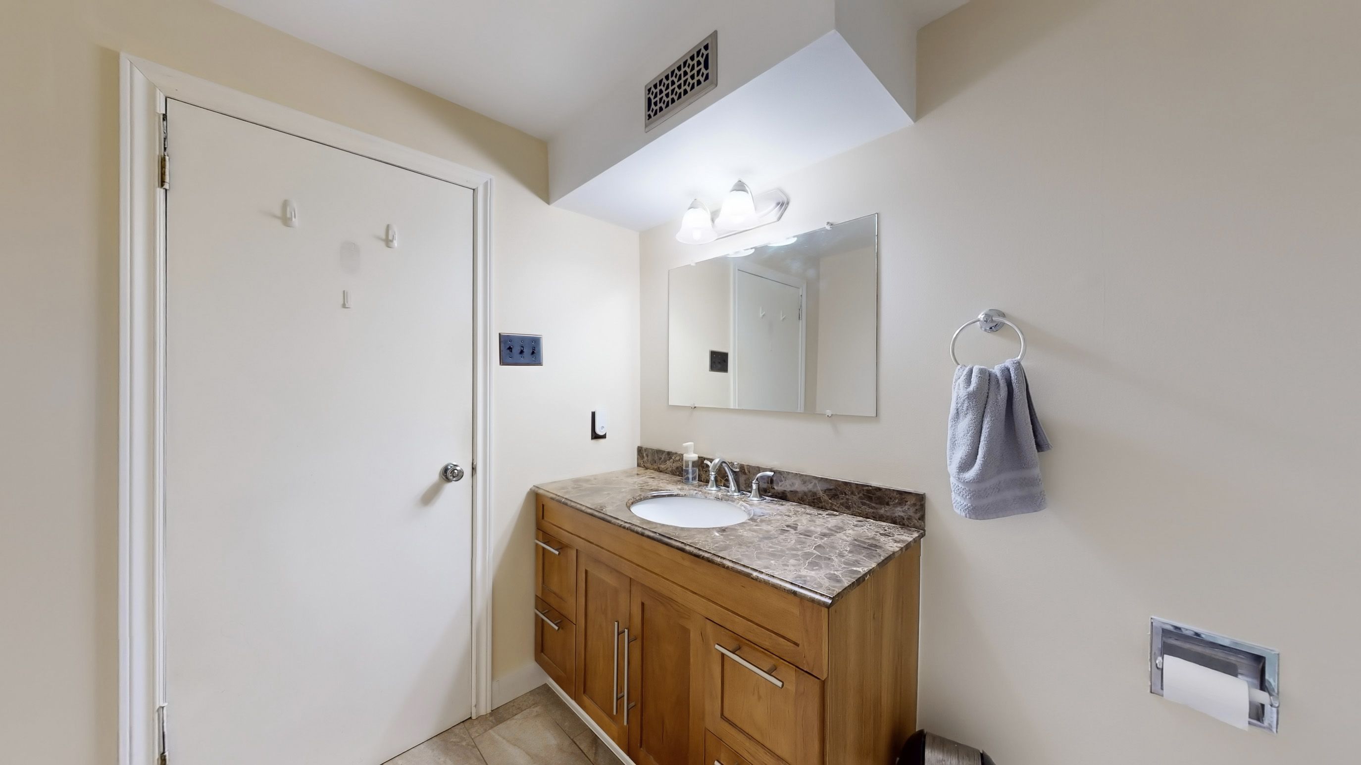 • Modern upgraded kitchen with stone countertops and stainless steel appliances.