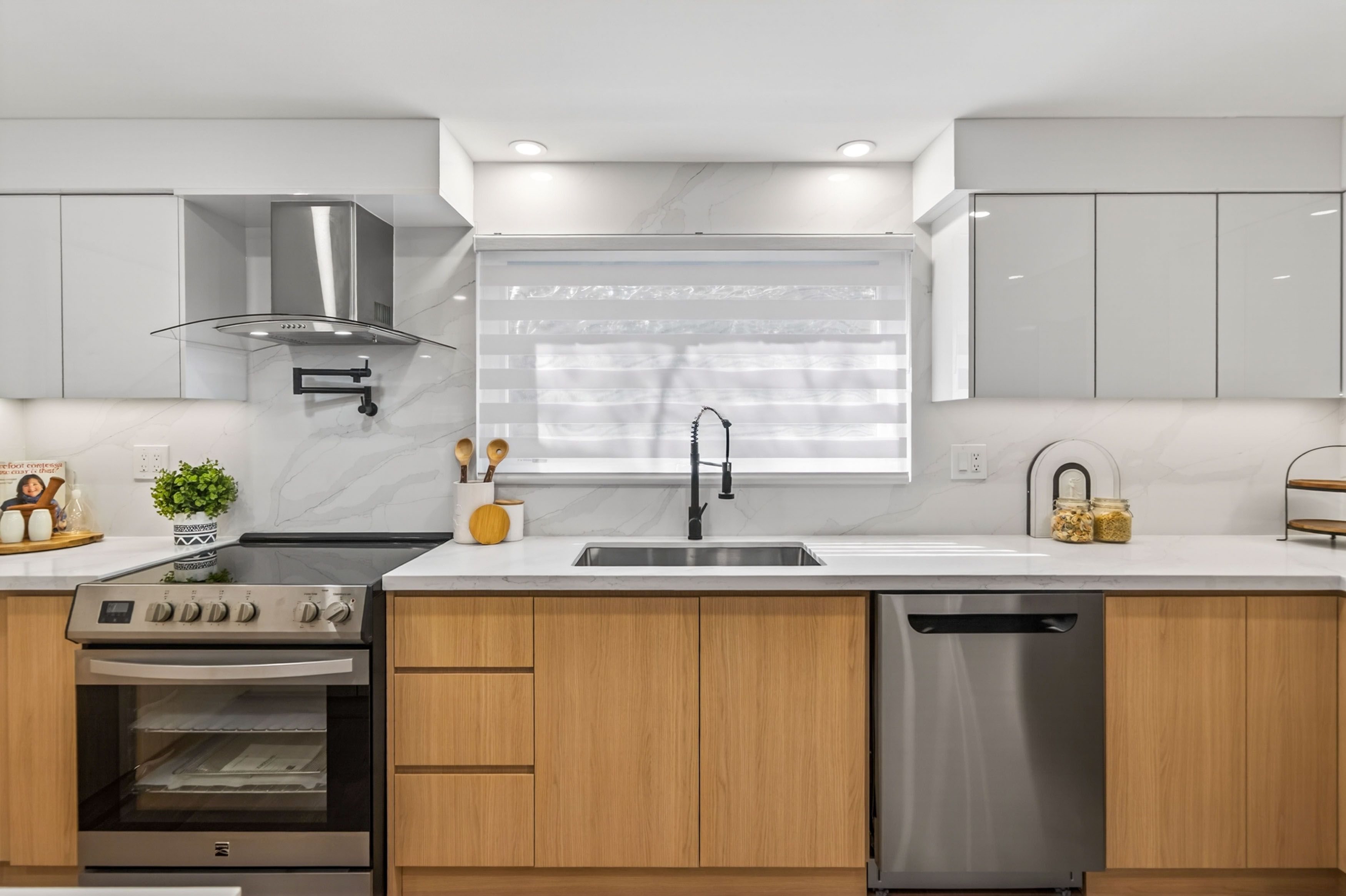 • Modern kitchen features quartz countertops and brand new stainless steel appliances.