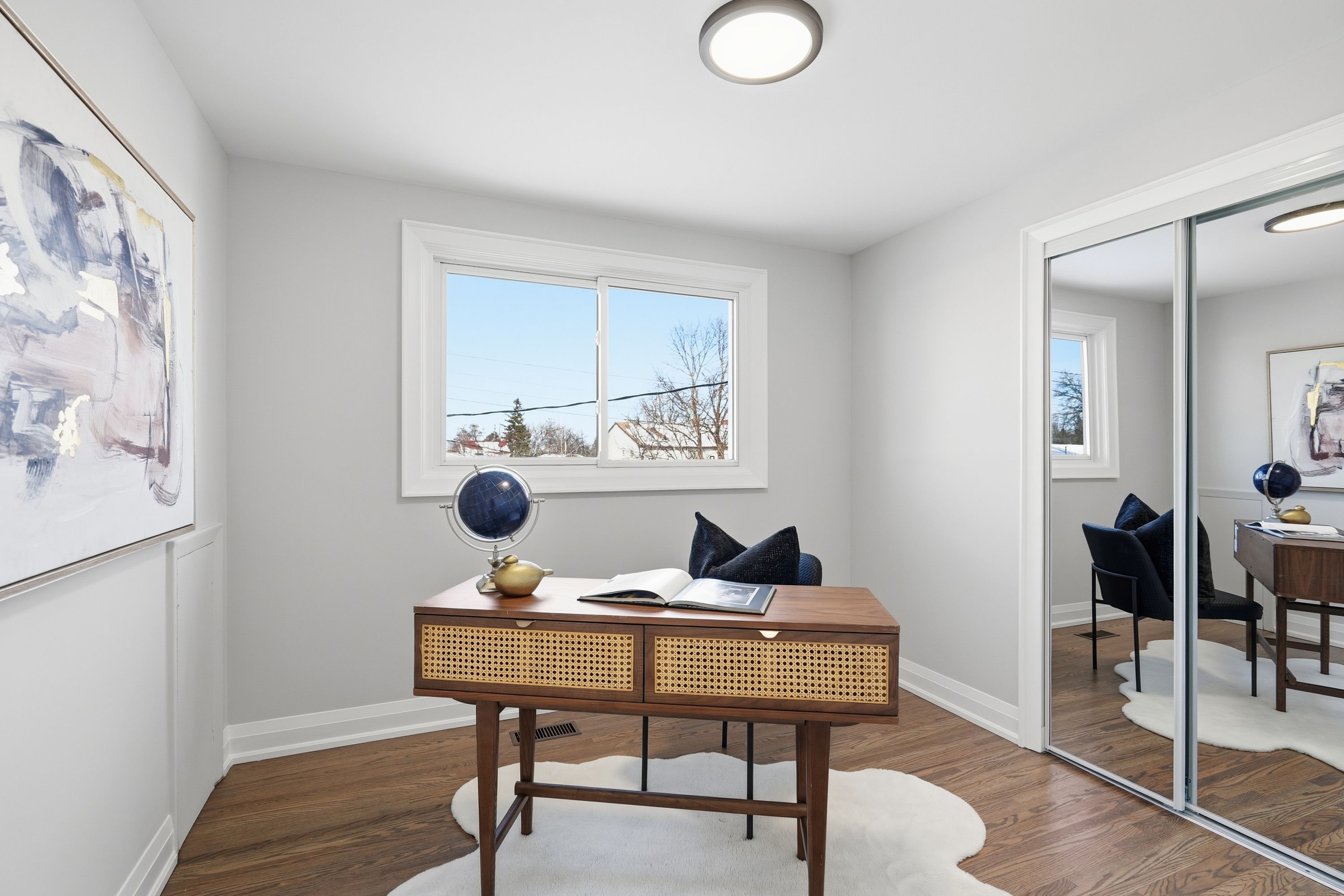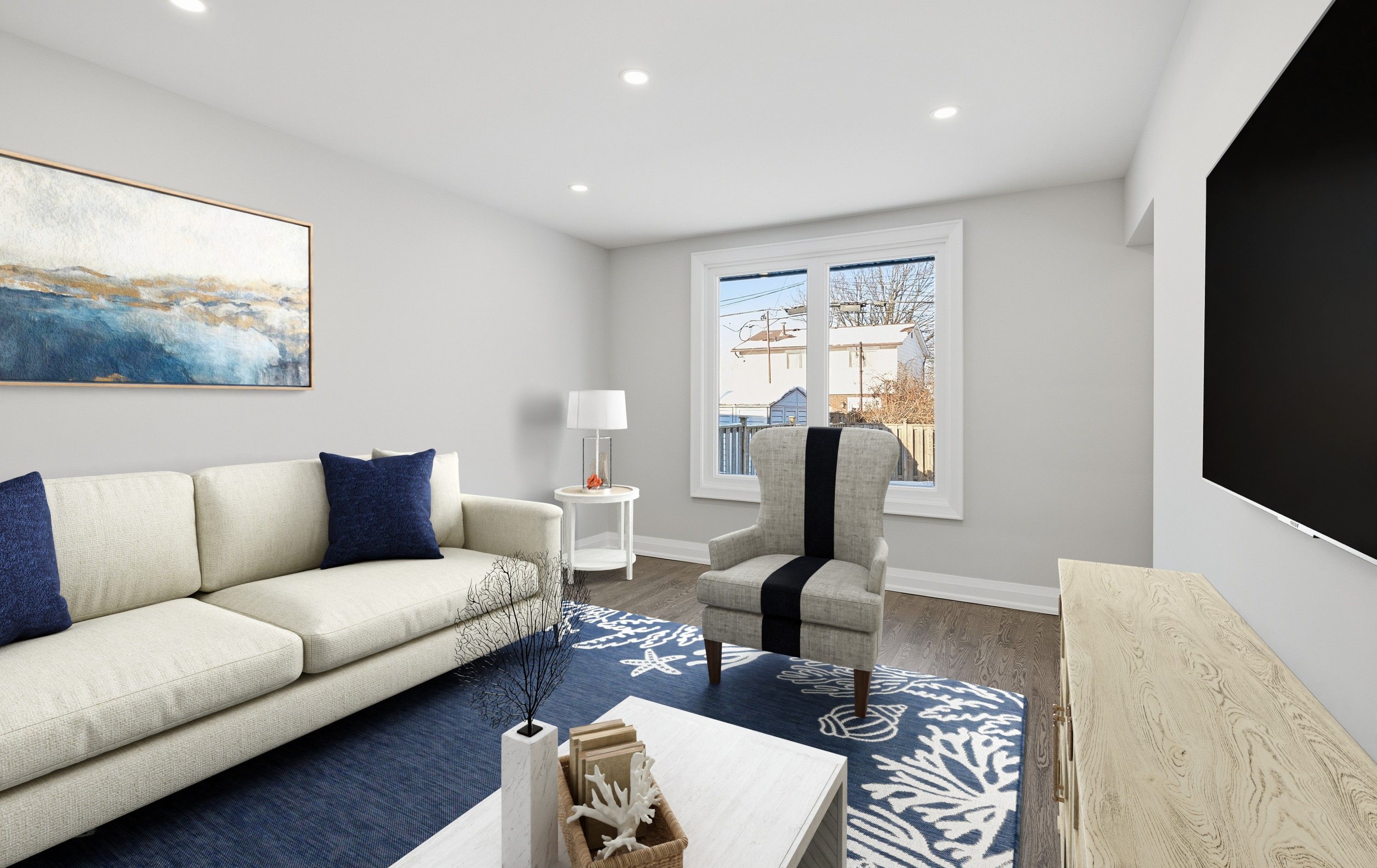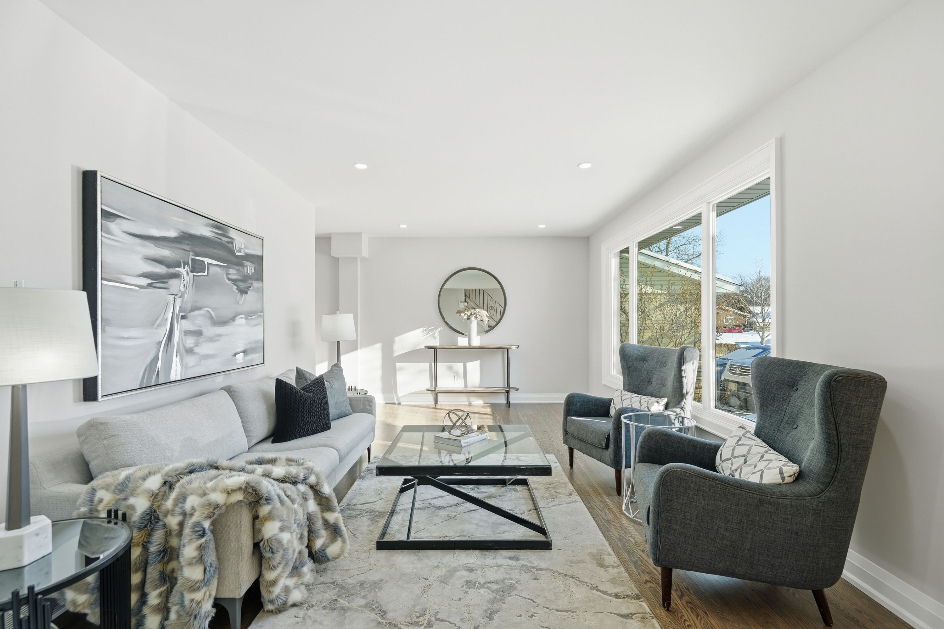 • Bright living room with hardwood floors and large windows.