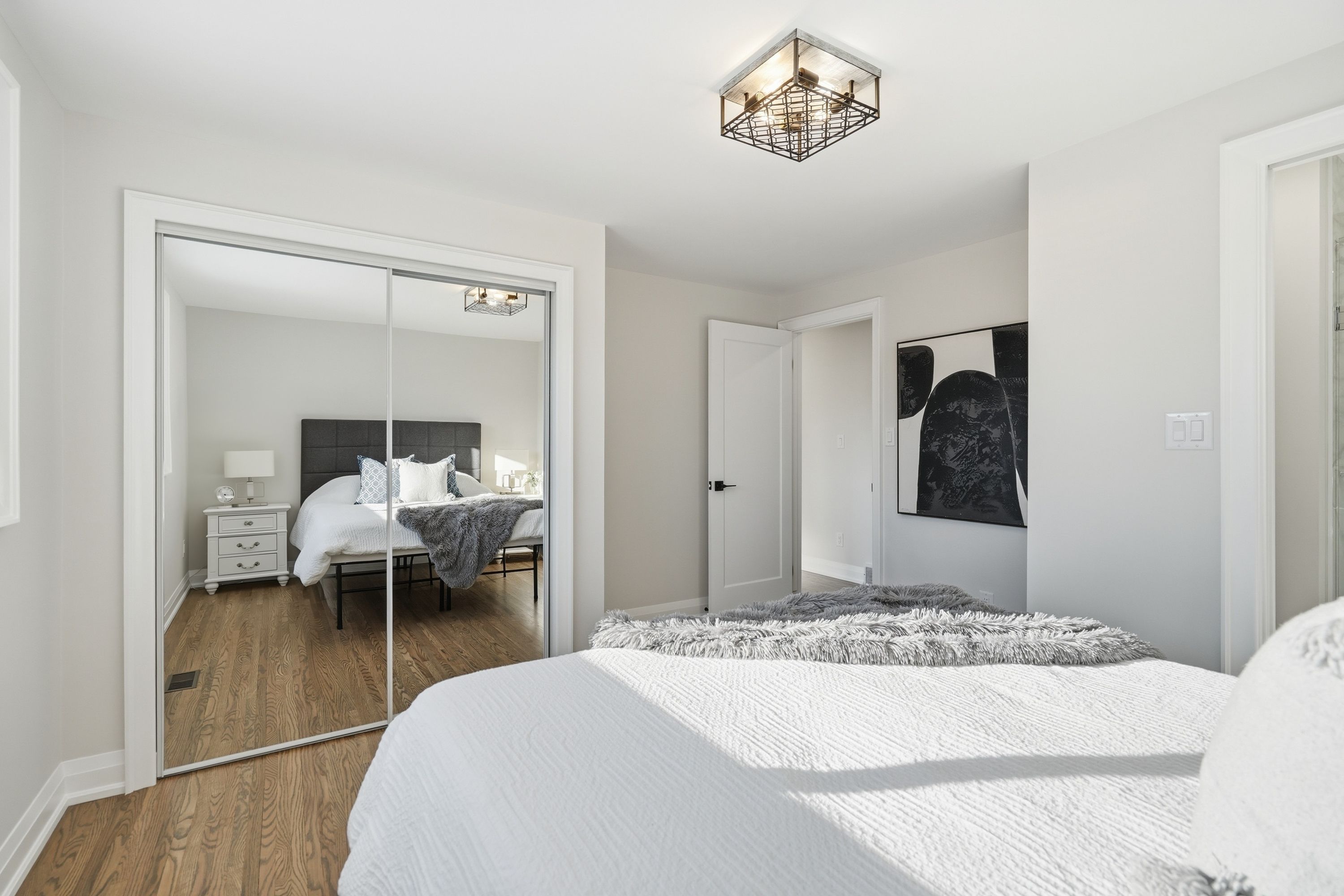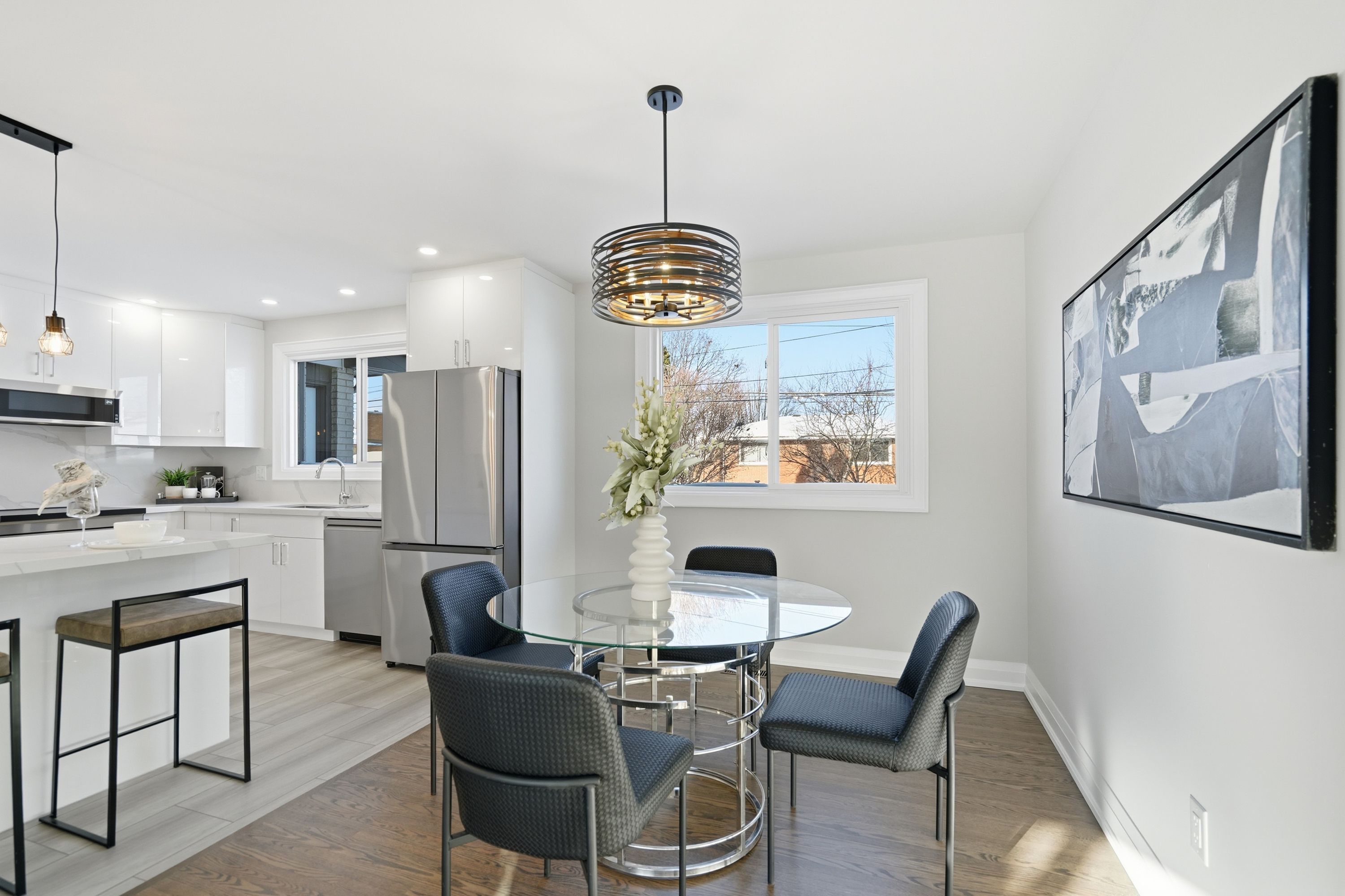 This stunning 2 storey home offers exceptional curb appeal and has been professionally renovated from top to bottom. This elegant and timeless home defines turn-key living, offering 5 well sized bedrooms, 4 new bathrooms and over 2500 square feet of finished living space. Showcasing a refreshed exterior highlighted by brand-new garage doors, exterior doors, & exterior pot lights. As you step inside, the expansive living room is flooded with natural light from large windows and features sanded and stained hardwood floors through-out, new trim, modern light fixtures, pot lights, and a seamless open-concept dining area. The brand-new kitchen offers quartz countertops, custom soft-close cabinetry, all-new high-end appliances, and a beautifully designed open layout perfect for both daily living and entertaining. Attention to detail is evident throughout this home, featuring new carpet runners, four well sized bedrooms and two fully renovated bathrooms. The finished basement adds refined living space ideal for recreation, guest accommodation, or a home office, featuring a brand new bathroom and a generous utility room with a brand new high-end washer and dryer and workbench. The large backyard offers plenty of space for outdoor living, complete with a brand-new deck and railings. Beyond the visible upgrades, the home offers complete peace of mind with updated plumbing, updated electrical with esa approval, new attic insulation, a new high-efficiency furnace, and a high-efficiency hot water heater, completing this extensively upgraded home. Set within a sought-after neighbourhood close to amenities, grocery stores, top-rated schools, and public transit, this extensively upgraded 2025 residence offers move-in-ready living with exceptional quality, comfort, and modern appeal.
