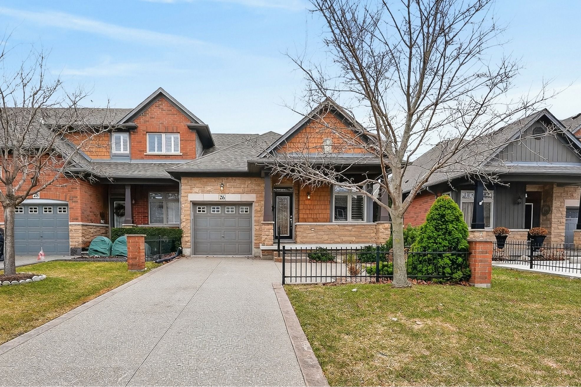Spacious bungalow end unit ... Polished, private and perfectly positioned, 26 conrad place delivers a rare opportunity to own an end-unit freehold bungalow townhome on an impressive 30' x 241' deep lot in grimsby. As a former model home this residence showcases thoughtful design, quality finishes and a layout that balances everyday comfort with effortless entertaining across 1,188 sq ft. A wrought-iron fence, covered front porch, and concrete aggregate driveway with spacious front patio area create a welcoming first impression. Inside, the open-concept design is elevated by a vaulted ceiling, enhancing the sense of space and natural flow. The kitchen is both stylish & functional, featuring quartz countertops + under-cabinet lighting, seamlessly connecting to the dining area and living room. Hardwood flooring carries through the living & dining areas, adding warmth and continuity to the main living space. From here, walk out to the newer oversized deck complete with retractable awning - an ideal extension of your living space - overlooking the fully fenced yard (2024) with plenty of room to enjoy. The main level features 2 bedrooms and 2 bathrooms, including a spacious primary suite with 2 closets and a well-appointed 4-pc ensuite with separate tub & shower. The second bedroom is finished with california shutters and is perfectly suited for guests or a home office. A 3-pc main bath, along with convenient main floor laundry with inside access to the attached garage w/inside entry, adds to the home's practical appeal. Key updates include roof (2023), furnace (2021) and a/c (2017), providing peace of mind for years to come. A refined blend of low-maintenance living, privacy and functional design, this is a standout opportunity in a sought-after grimsby location on the lakeside of town. Click on multimedia for virtual tour, floor plans, and more.