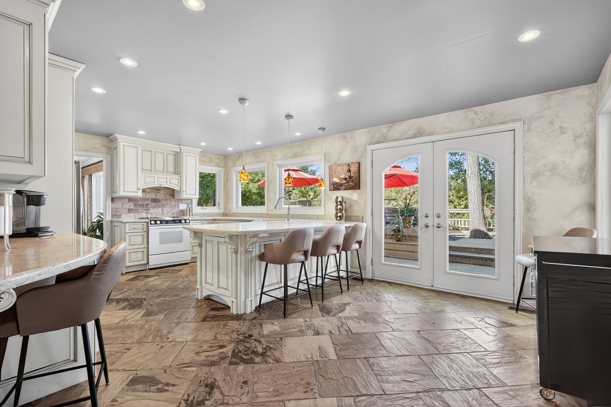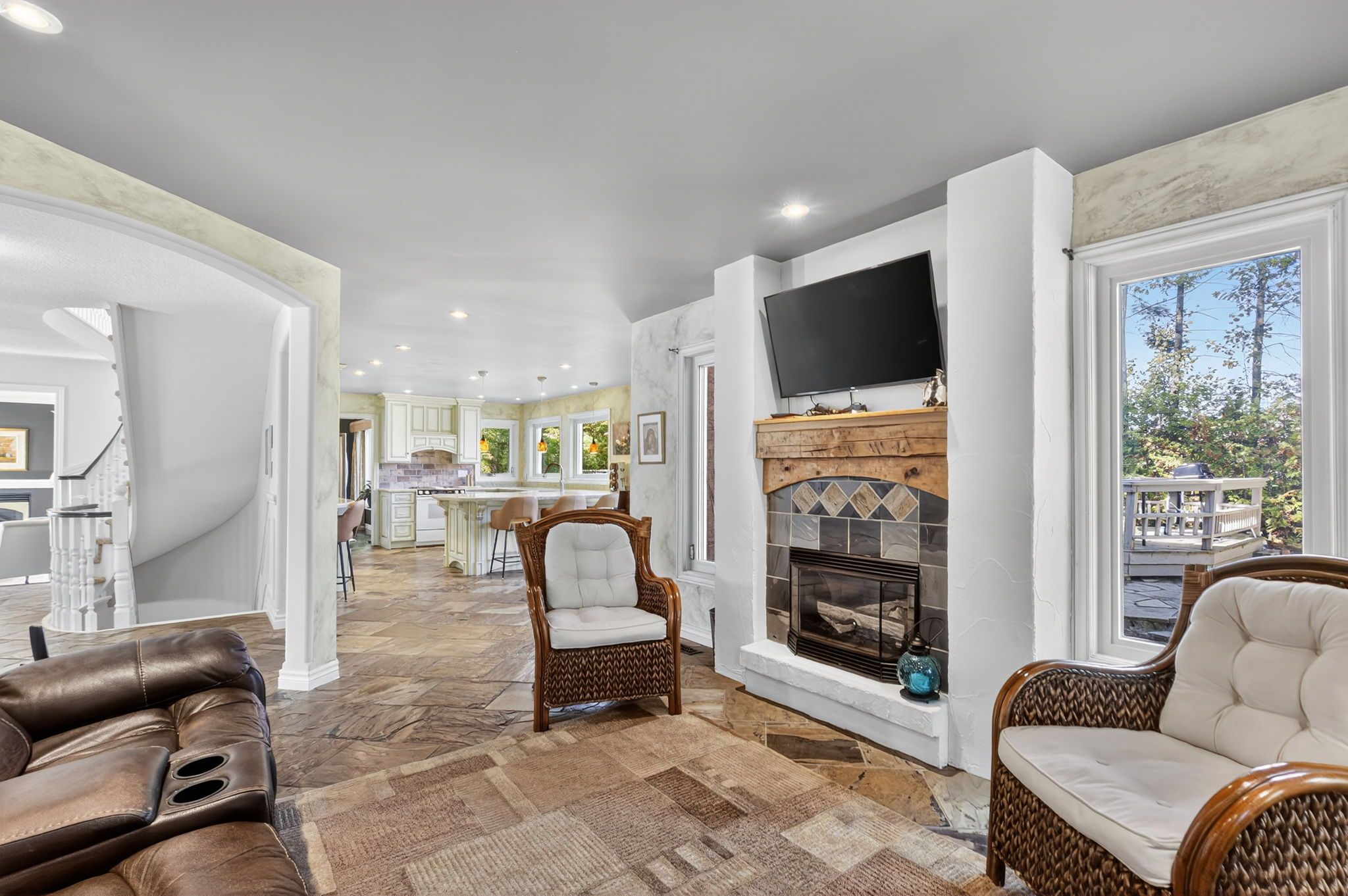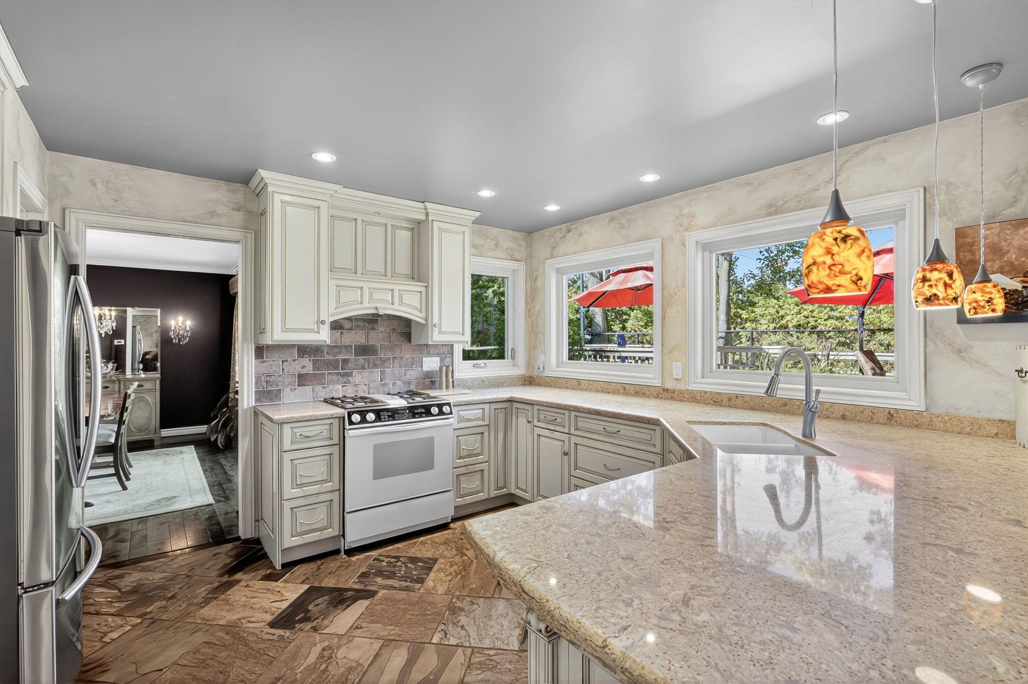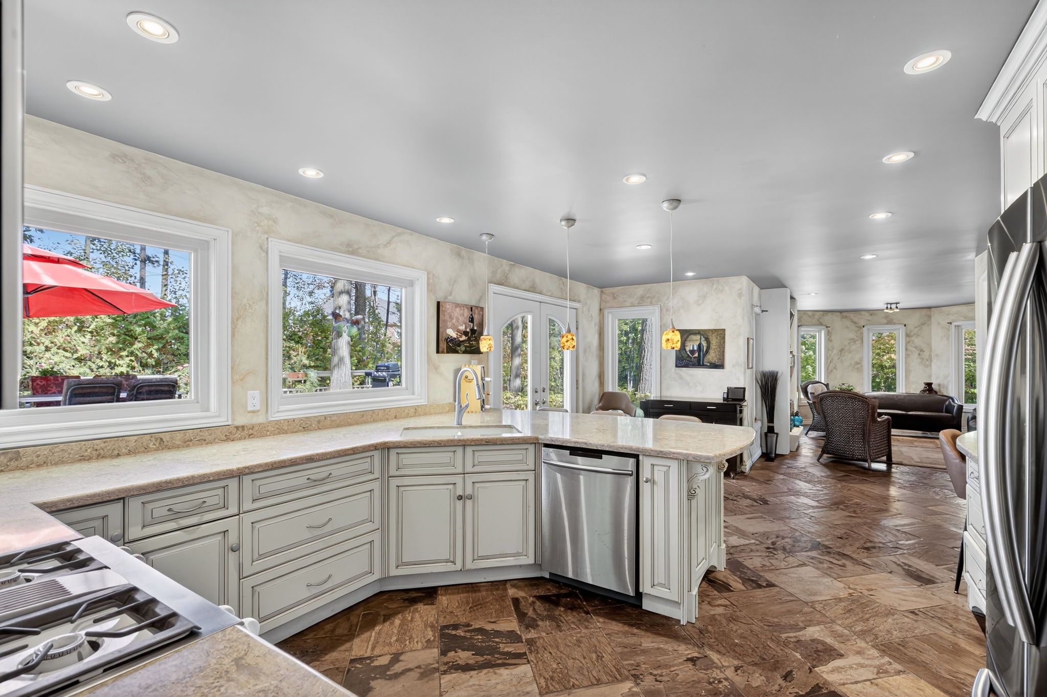 • Eat-in kitchen with a view of the family room and fireplace.