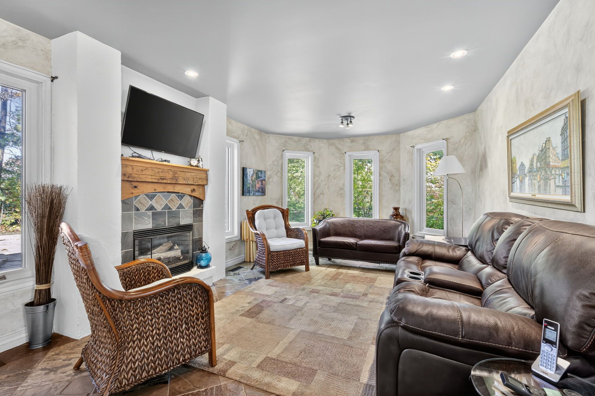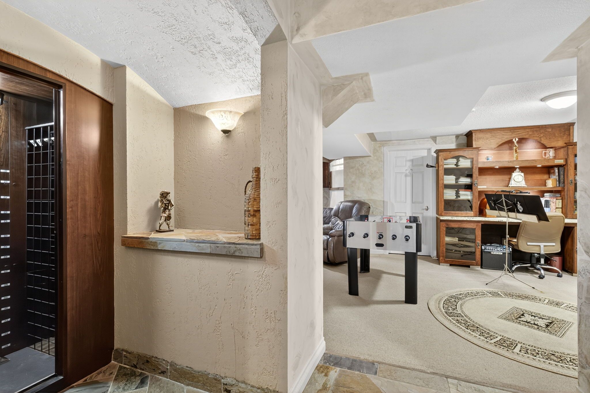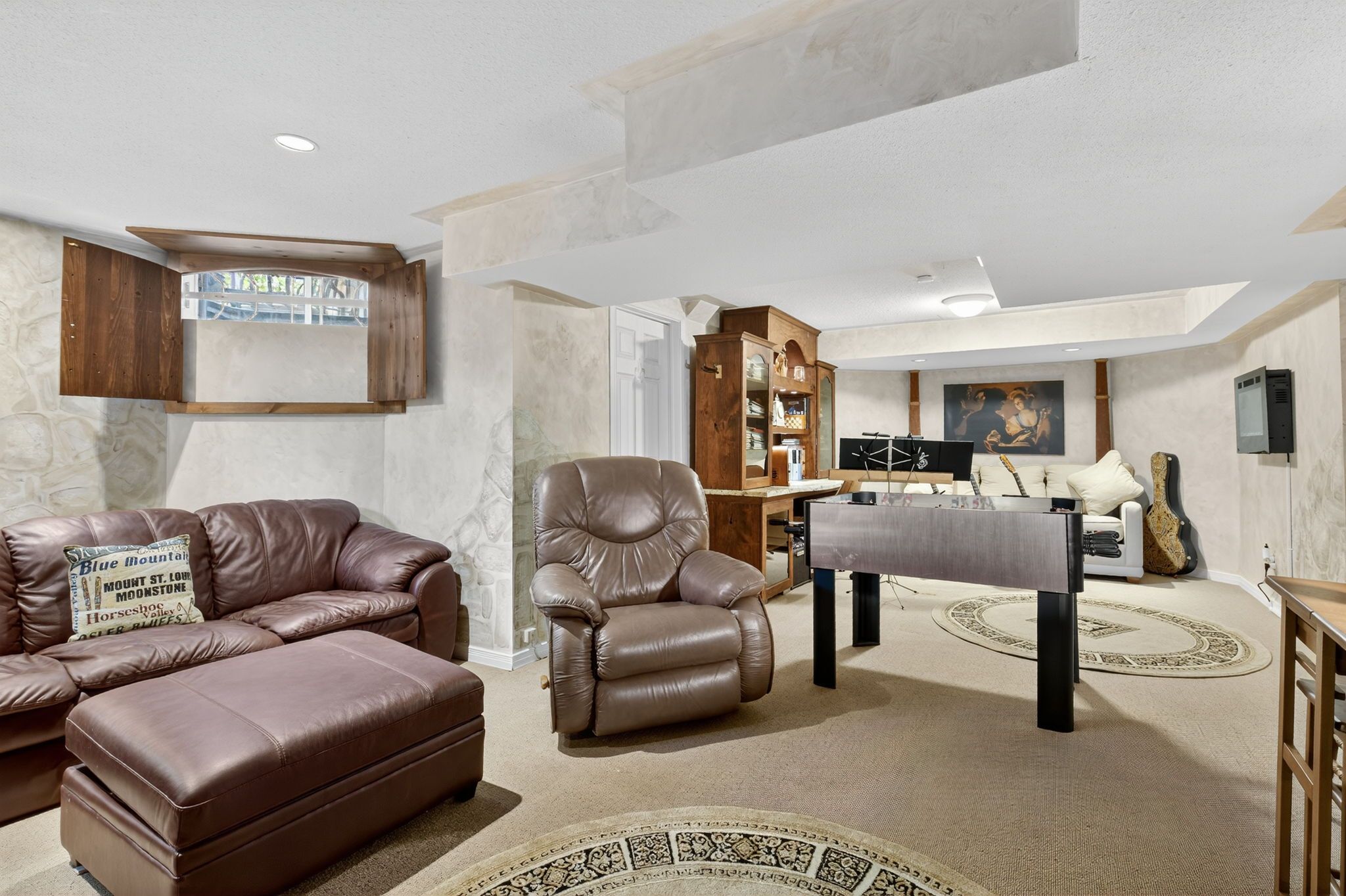 • Professionally finished basement with multiple recreation areas and a wine cooler.