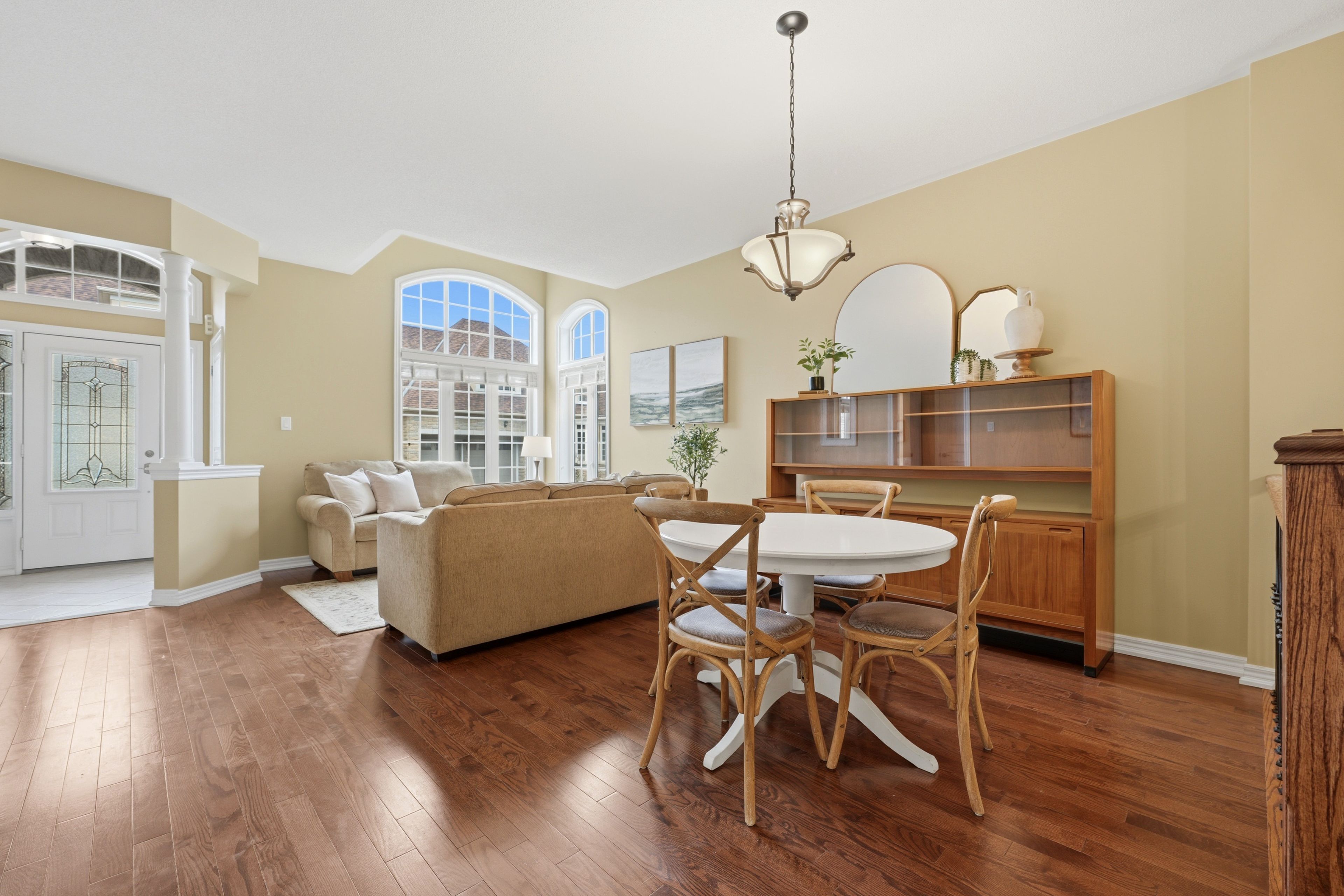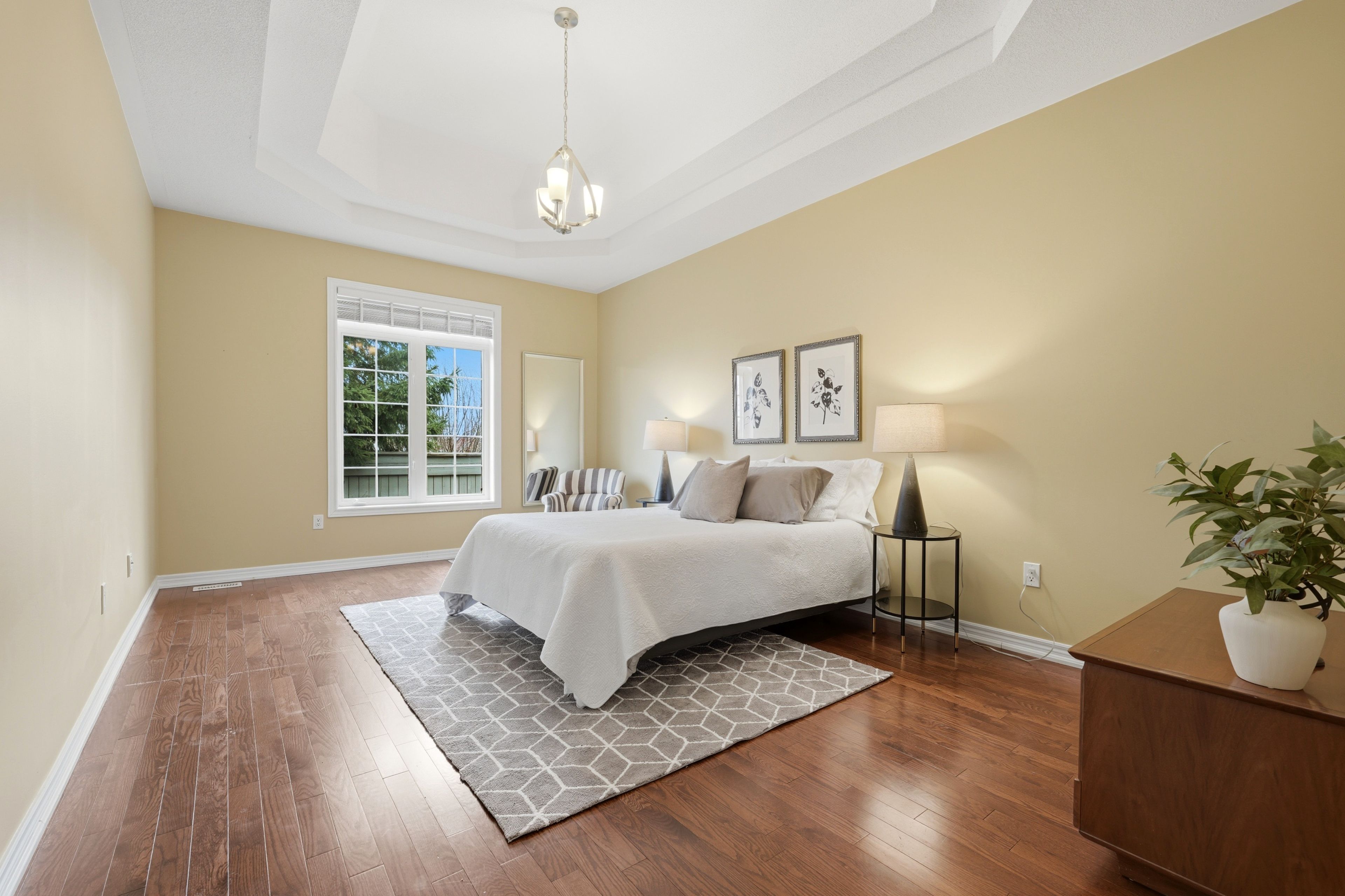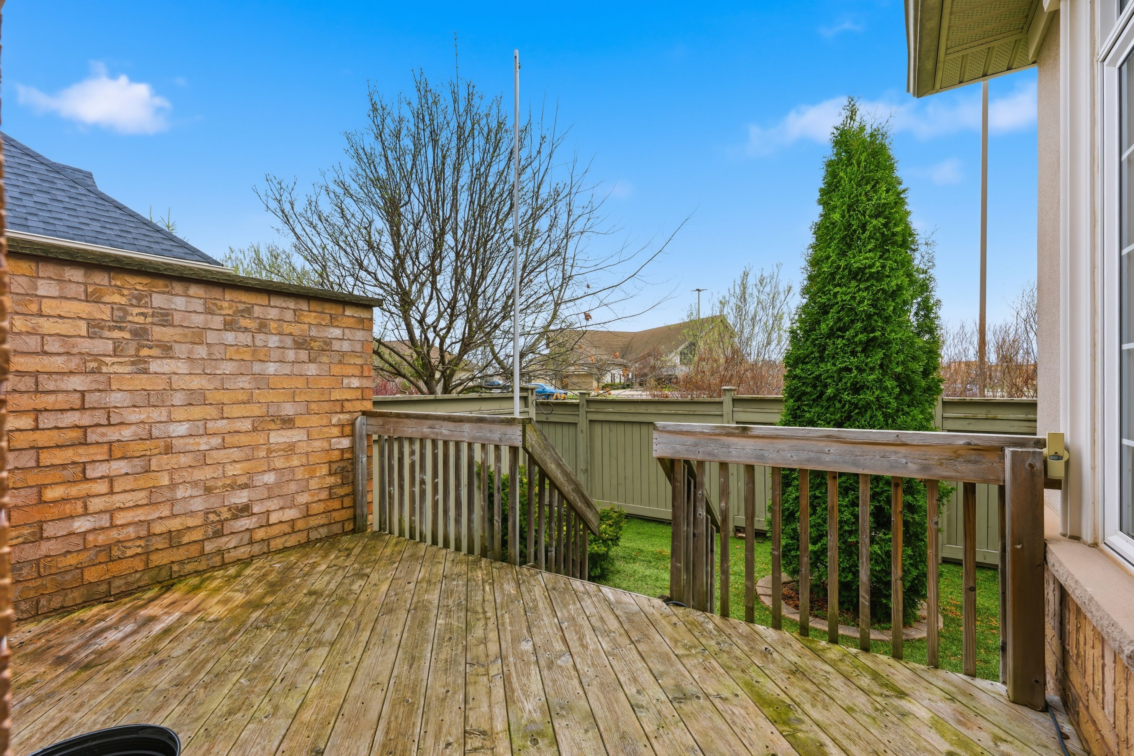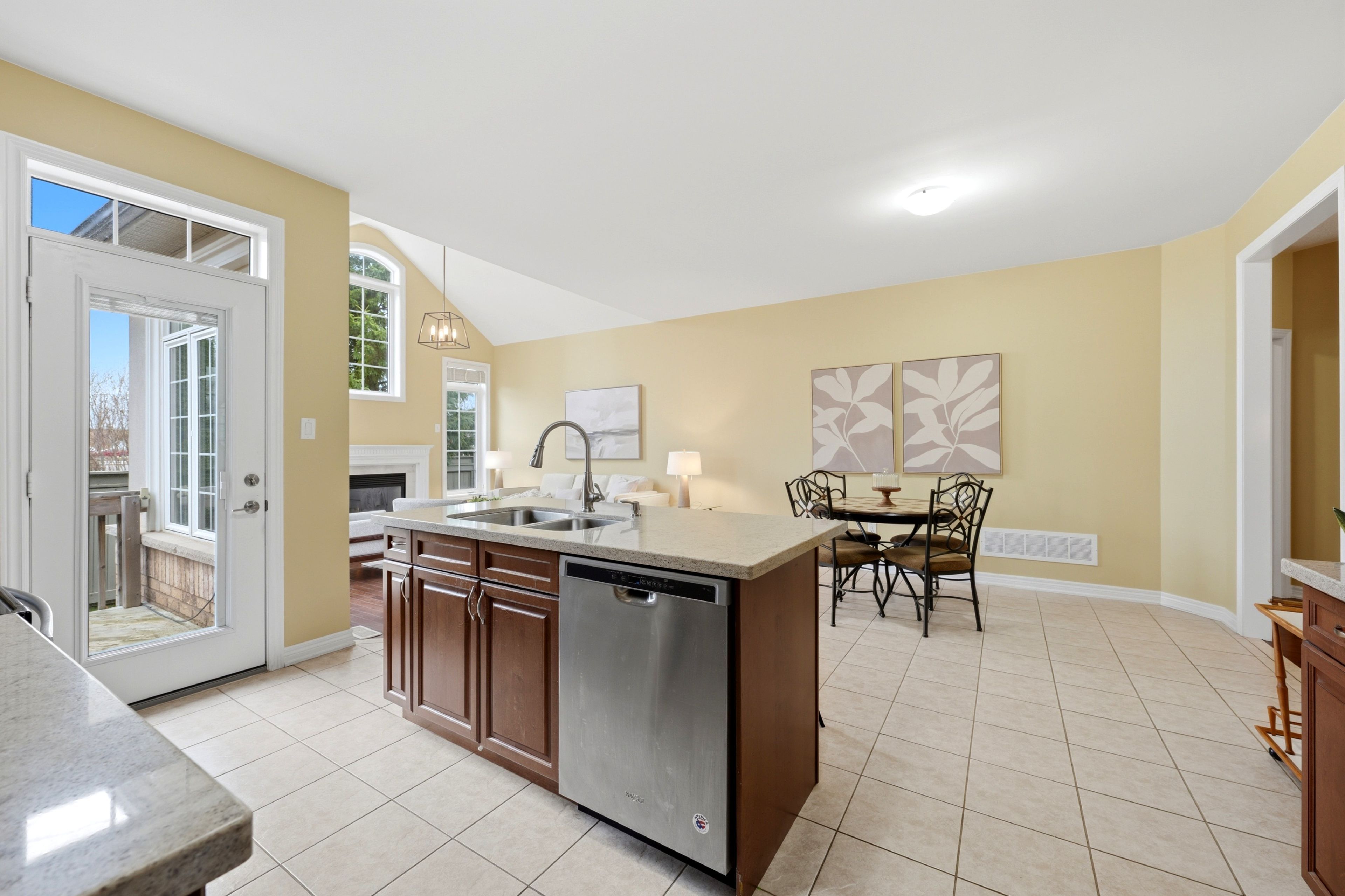 Beautiful 2-bedroom, 2-bathroom bungalow with low-maintenance living with parking for 2 cars (1 garage & 1 on upgraded rubber driveway). The home features gleaming hardwood flooring throughout, tile in the eat-in kitchen, & impressive 9-foot ceilings that enhance the bright, open feel. The front entrance with closet leads into the formal living & dining room at the front of the home, highlighted by hardwood flooring and a large feature window allowing natural light to pour in. The eat-in kitchen offers excellent flow with a centre sit-up island overlooking the breakfast area and family room. Features include quartz countertops, stainless steel appliances, double sink, and ample cabinetry including pantry. The family room is warm and inviting with a cathedral ceiling, gas fireplace, and four windows that brighten the space. A walk-out from the kitchen leads to the backyard. Off the kitchen is the mudroom & laundry space that provides tile flooring, access to the garage, large double closet & an additional walk-out to the backyard. The spacious primary suite features a tray ceiling, walk-in closet, large window, & 5pc ensuite with deep soaker tub including a handheld shower head, 2 sinks, and separate glassed shower. The second bedroom is generously sized with two arched windows & closet space. Hardwood stairs lead to the unfinished basement, offering great potential to create additional living space with the high ceiling height, open space and rough-in for an additional bathroom. Enjoy easy maintenance with turf in both the front & backyard, plus a private deck space to relax outdoors. Some notable features include; shingles (2020), furnace (2021), ac (2021), rubber driveway, turf landscaping, hardwood flooring, and whirlpool stainless steel appliances. Conveniently located within walking distance to grocery stores, restaurants, shopping, church, parks & more. Common elements fee of $155/mth for snow removal, garbage pickup, common elements maintenance.