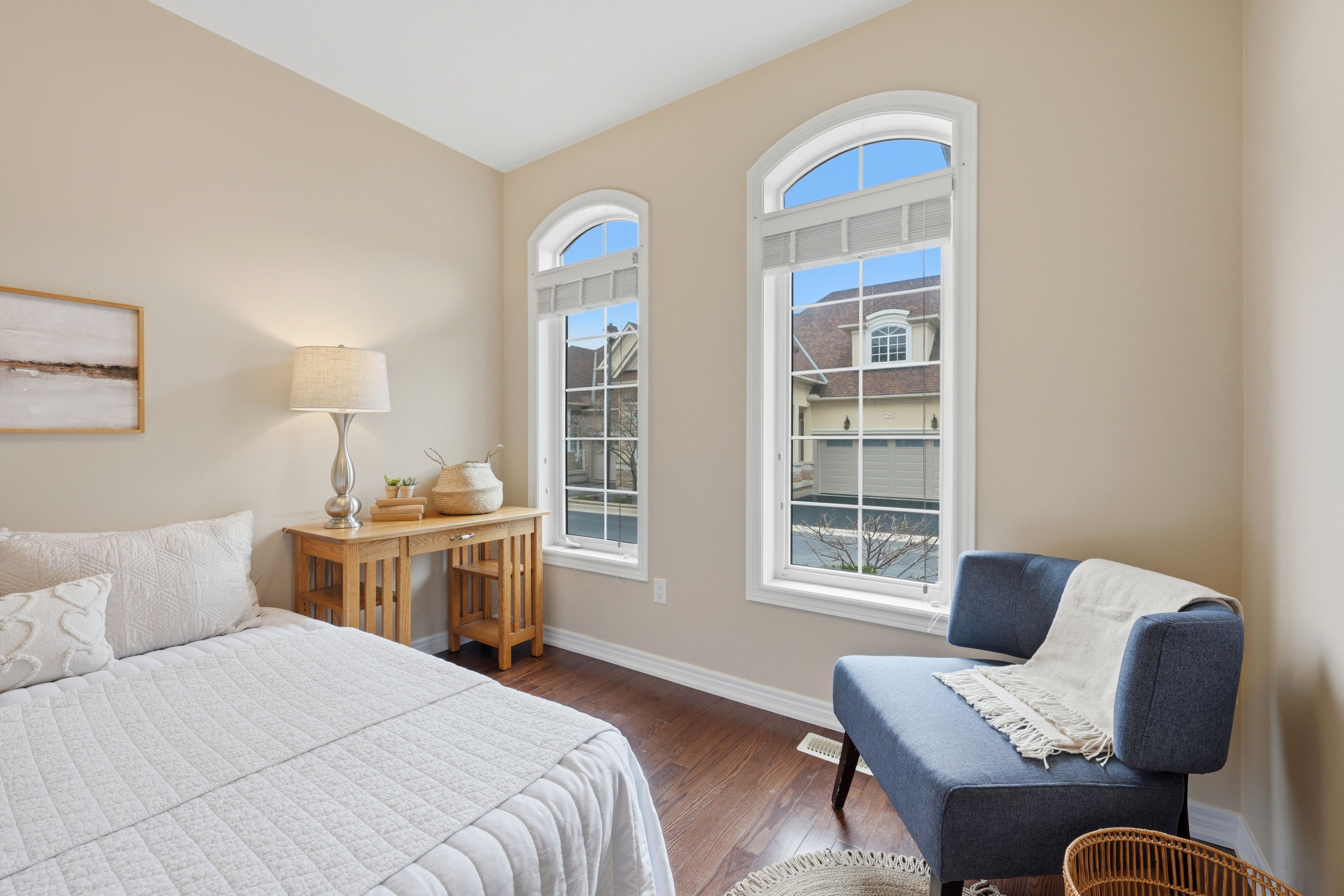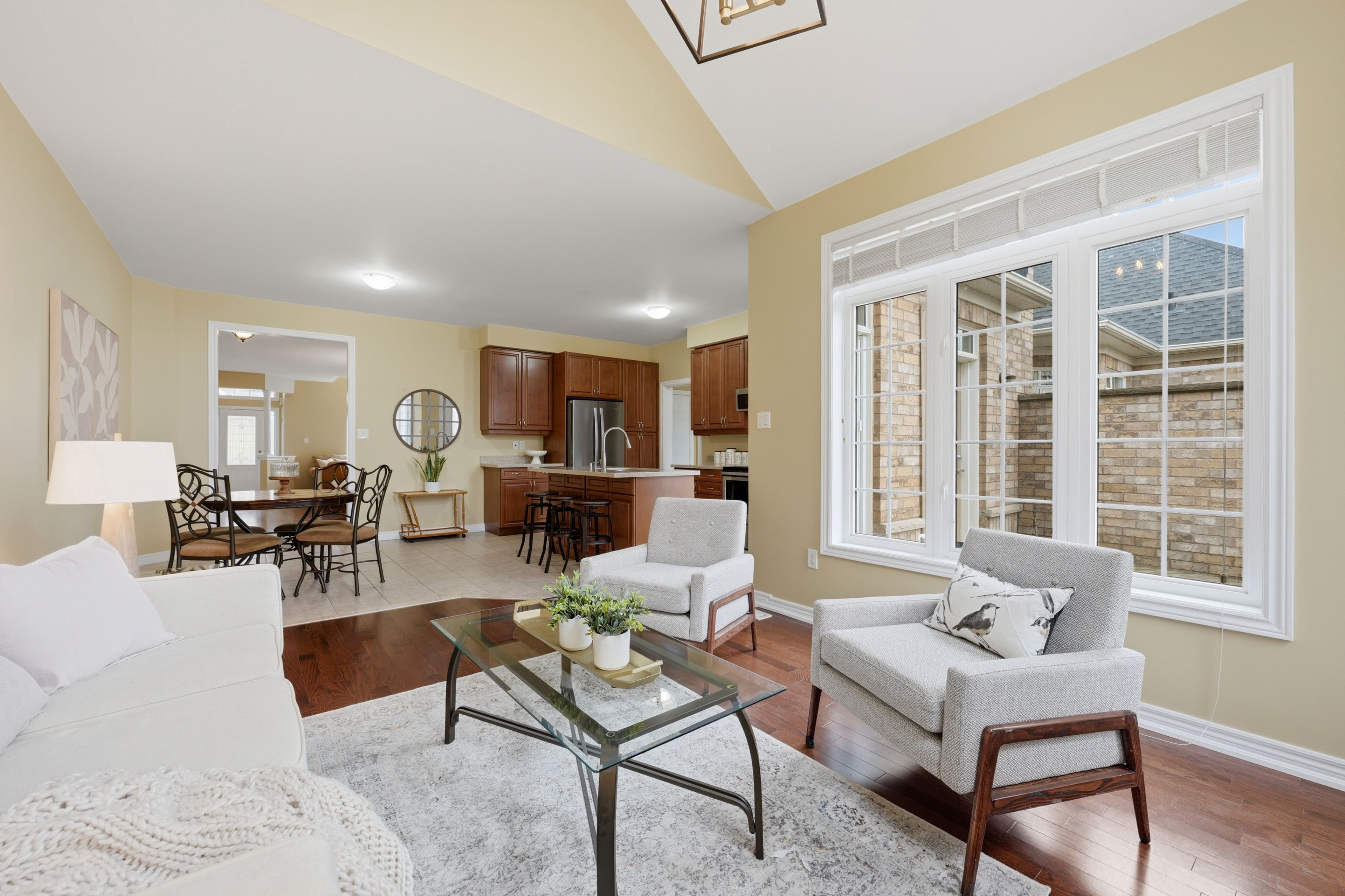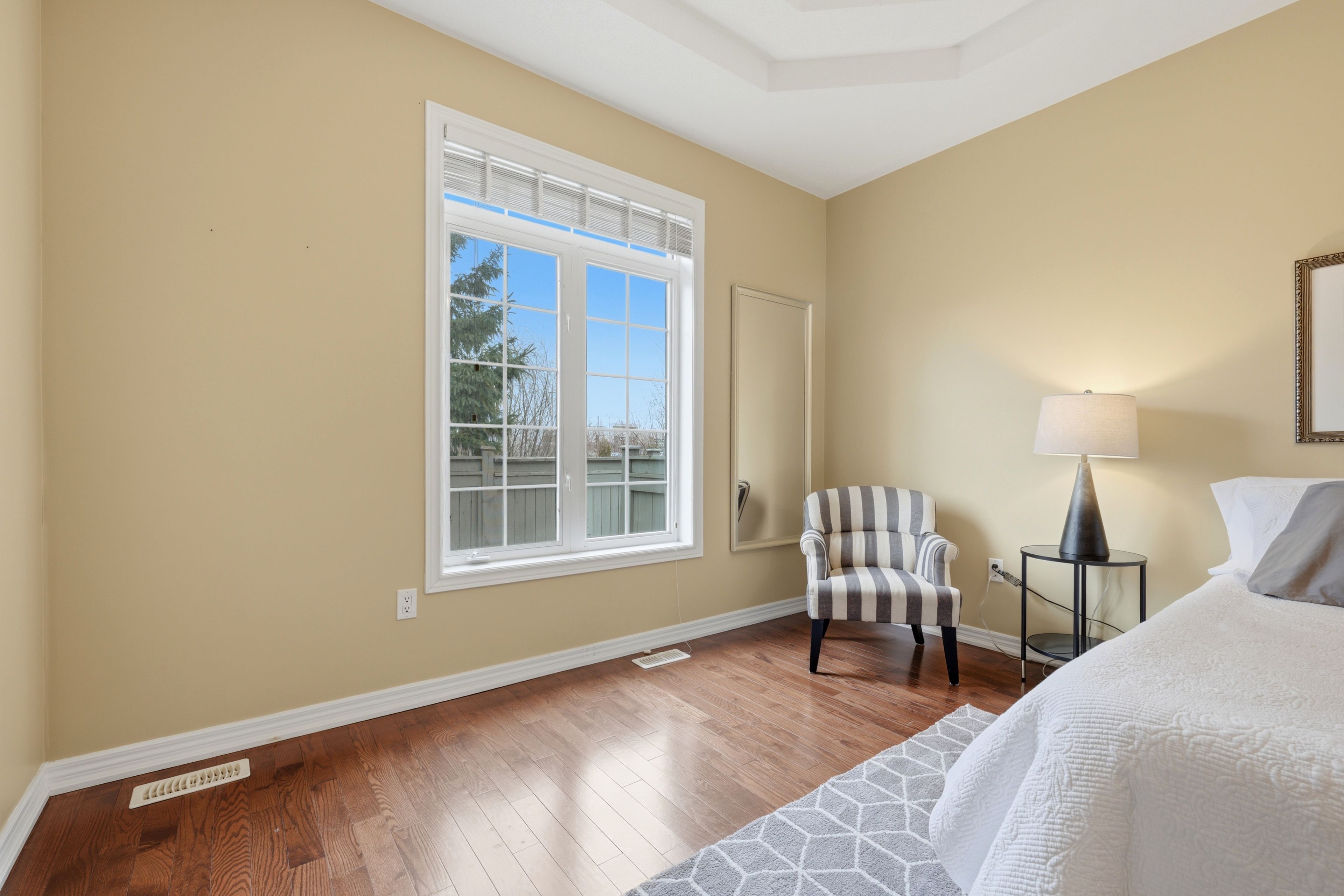 Beautiful 2-bedroom, 2-bathroom bungalow with low-maintenance living with parking for 2 cars (1 garage & 1 on upgraded rubber driveway). The home features gleaming hardwood flooring throughout, tile in the eat-in kitchen, & impressive 9-foot ceilings that enhance the bright, open feel. The front entrance with closet leads into the formal living & dining room at the front of the home, highlighted by hardwood flooring and a large feature window allowing natural light to pour in. The eat-in kitchen offers excellent flow with a centre sit-up island overlooking the breakfast area and family room. Features include quartz countertops, stainless steel appliances, double sink, and ample cabinetry including pantry. The family room is warm and inviting with a cathedral ceiling, gas fireplace, and four windows that brighten the space. A walk-out from the kitchen leads to the backyard. Off the kitchen is the mudroom & laundry space that provides tile flooring, access to the garage, large double closet & an additional walk-out to the backyard. The spacious primary suite features a tray ceiling, walk-in closet, large window, & 5pc ensuite with deep soaker tub including a handheld shower head, 2 sinks, and separate glassed shower. The second bedroom is generously sized with two arched windows & closet space. Hardwood stairs lead to the unfinished basement, offering great potential to create additional living space with the high ceiling height, open space and rough-in for an additional bathroom. Enjoy easy maintenance with turf in both the front & backyard, plus a private deck space to relax outdoors. Some notable features include; shingles (2020), furnace (2021), ac (2021), rubber driveway, turf landscaping, hardwood flooring, and whirlpool stainless steel appliances. Conveniently located within walking distance to grocery stores, restaurants, shopping, church, parks & more. Common elements fee of $155/mth for snow removal, garbage pickup, common elements maintenance.