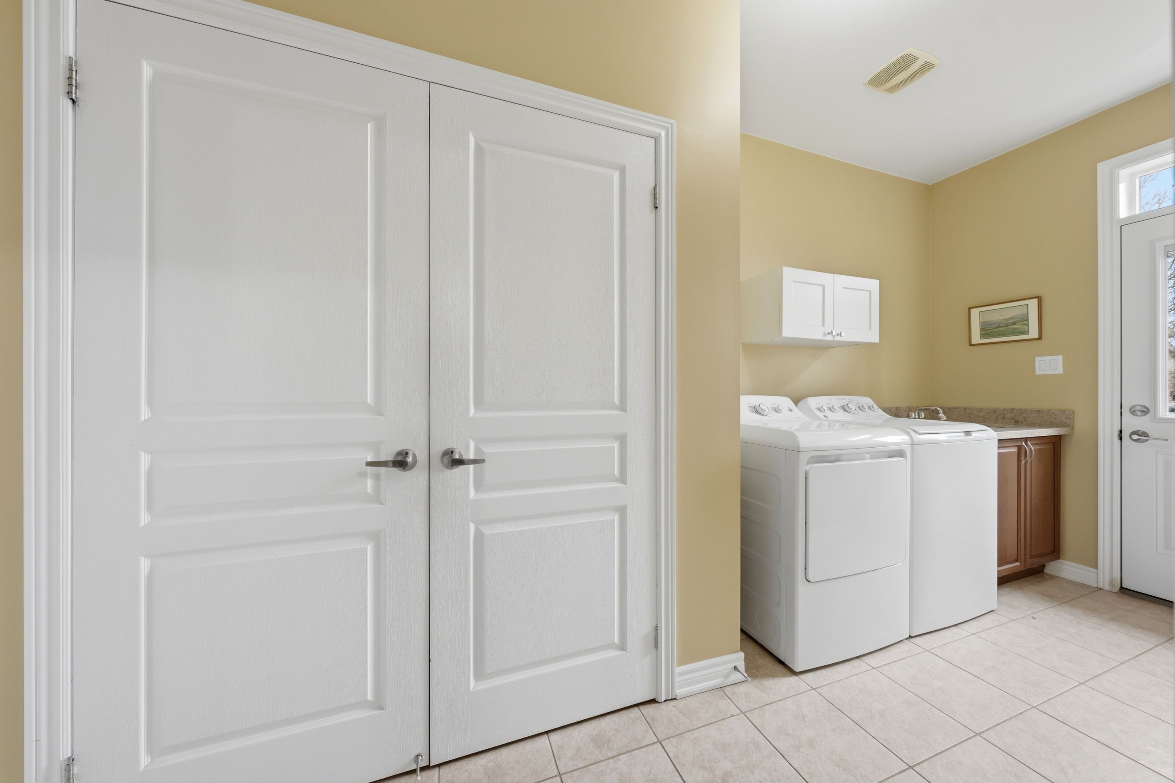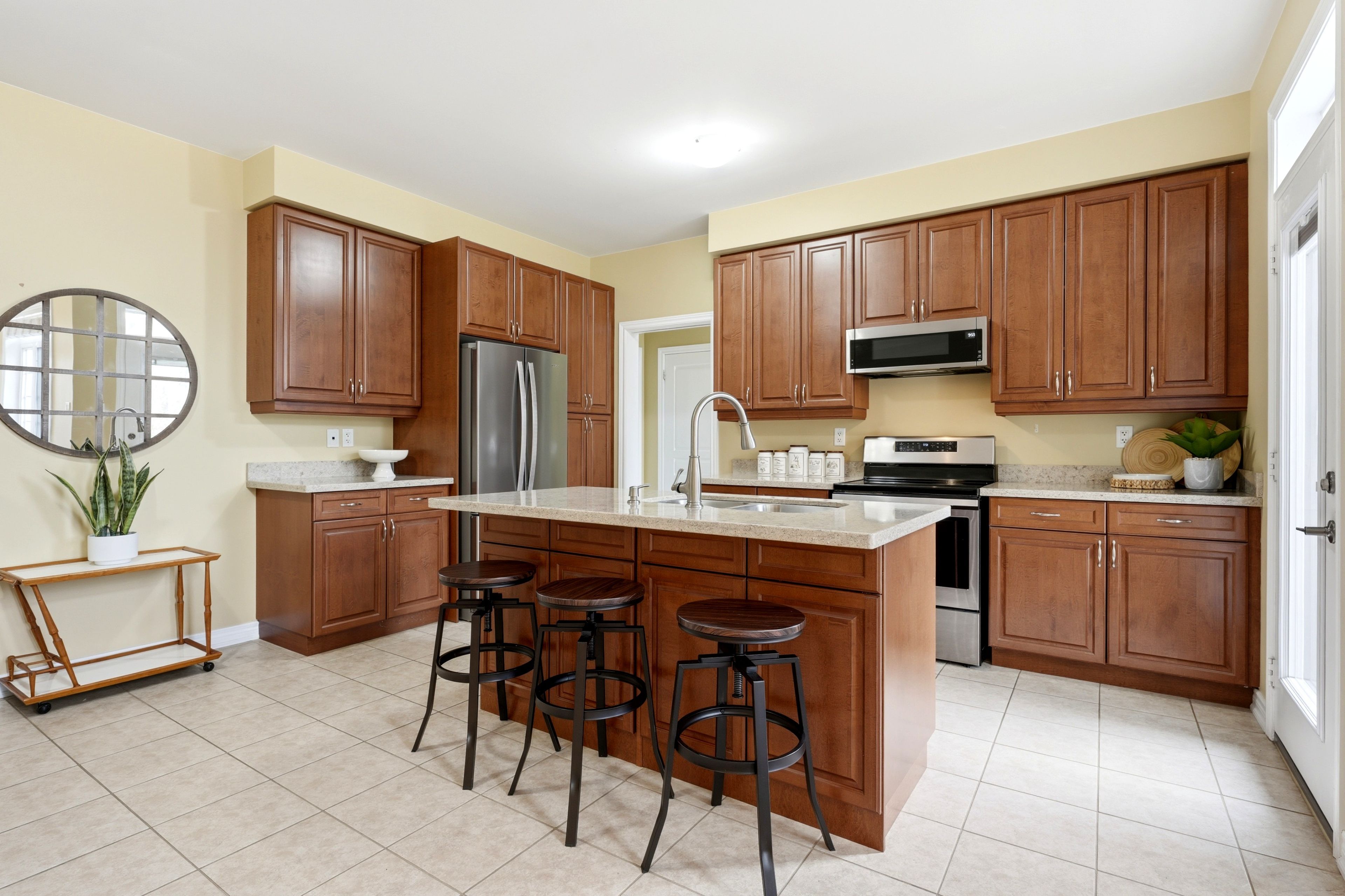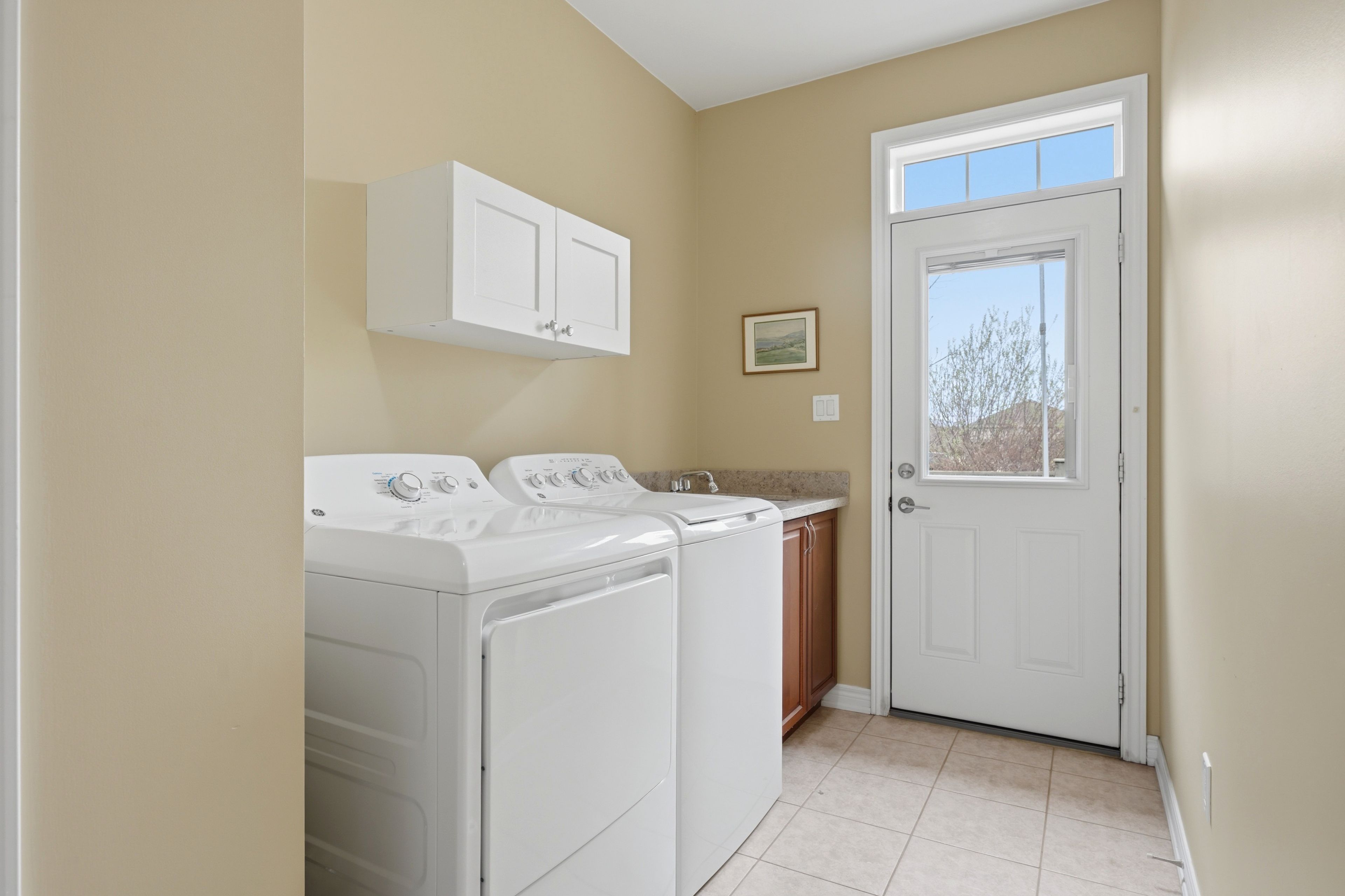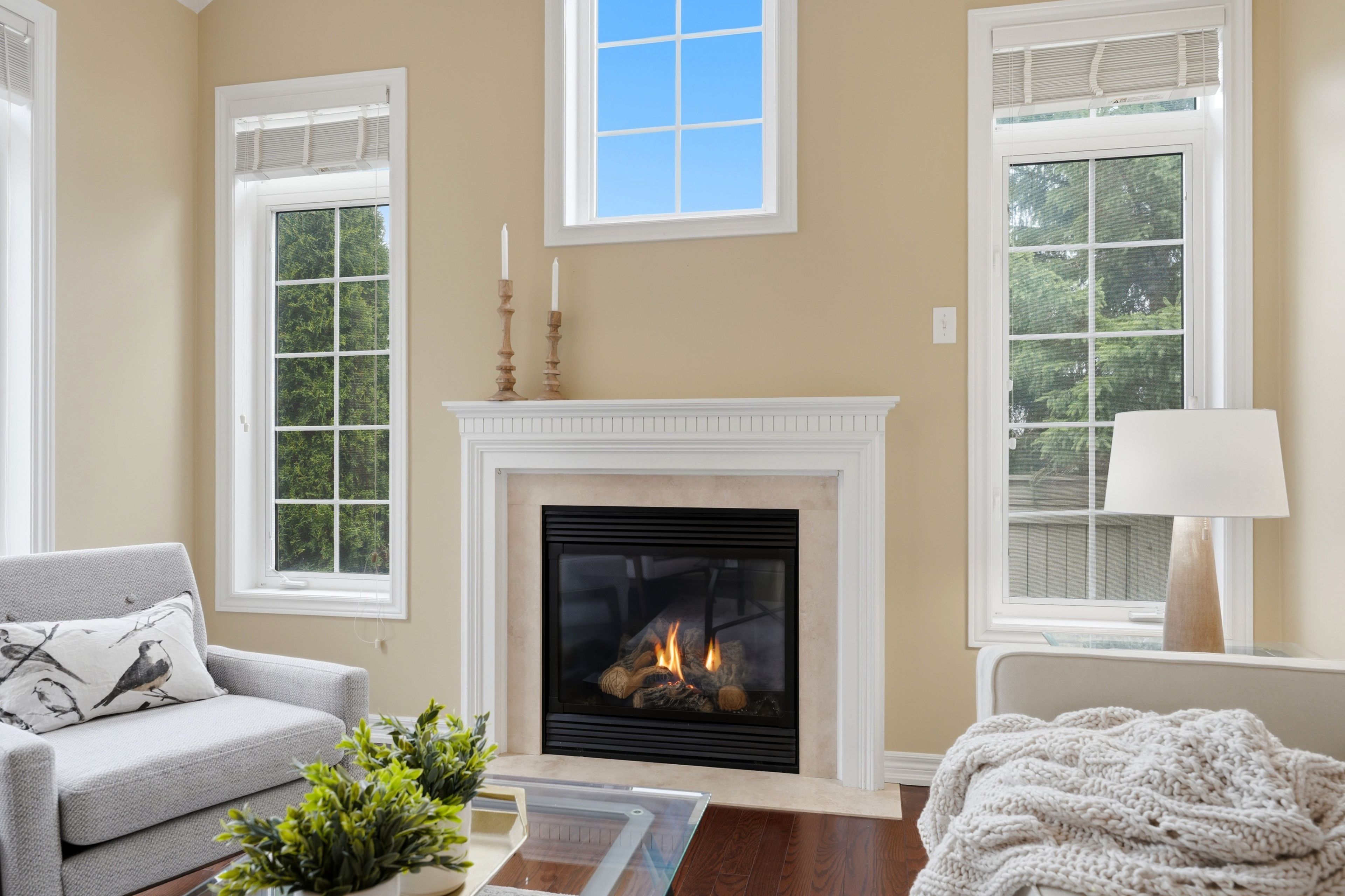 Beautiful 2-bedroom, 2-bathroom bungalow with low-maintenance living with parking for 2 cars (1 garage & 1 on upgraded rubber driveway). The home features gleaming hardwood flooring throughout, tile in the eat-in kitchen, & impressive 9-foot ceilings that enhance the bright, open feel. The front entrance with closet leads into the formal living & dining room at the front of the home, highlighted by hardwood flooring and a large feature window allowing natural light to pour in. The eat-in kitchen offers excellent flow with a centre sit-up island overlooking the breakfast area and family room. Features include quartz countertops, stainless steel appliances, double sink, and ample cabinetry including pantry. The family room is warm and inviting with a cathedral ceiling, gas fireplace, and four windows that brighten the space. A walk-out from the kitchen leads to the backyard. Off the kitchen is the mudroom & laundry space that provides tile flooring, access to the garage, large double closet & an additional walk-out to the backyard. The spacious primary suite features a tray ceiling, walk-in closet, large window, & 5pc ensuite with deep soaker tub including a handheld shower head, 2 sinks, and separate glassed shower. The second bedroom is generously sized with two arched windows & closet space. Hardwood stairs lead to the unfinished basement, offering great potential to create additional living space with the high ceiling height, open space and rough-in for an additional bathroom. Enjoy easy maintenance with turf in both the front & backyard, plus a private deck space to relax outdoors. Some notable features include; shingles (2020), furnace (2021), ac (2021), rubber driveway, turf landscaping, hardwood flooring, and whirlpool stainless steel appliances. Conveniently located within walking distance to grocery stores, restaurants, shopping, church, parks & more. Common elements fee of $155/mth for snow removal, garbage pickup, common elements maintenance.