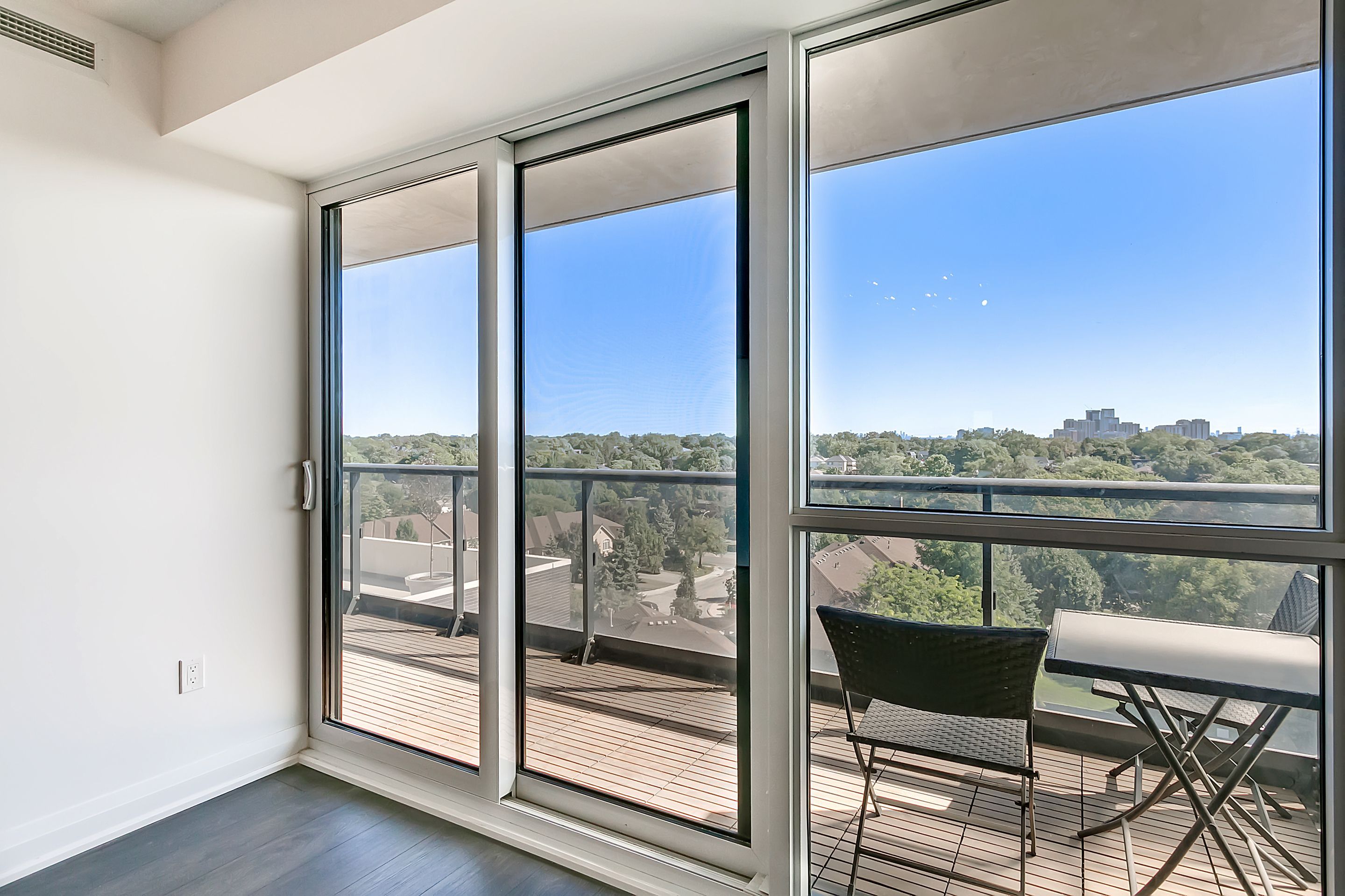 • Open-concept layout seamlessly connecting living area to a private balcony.
