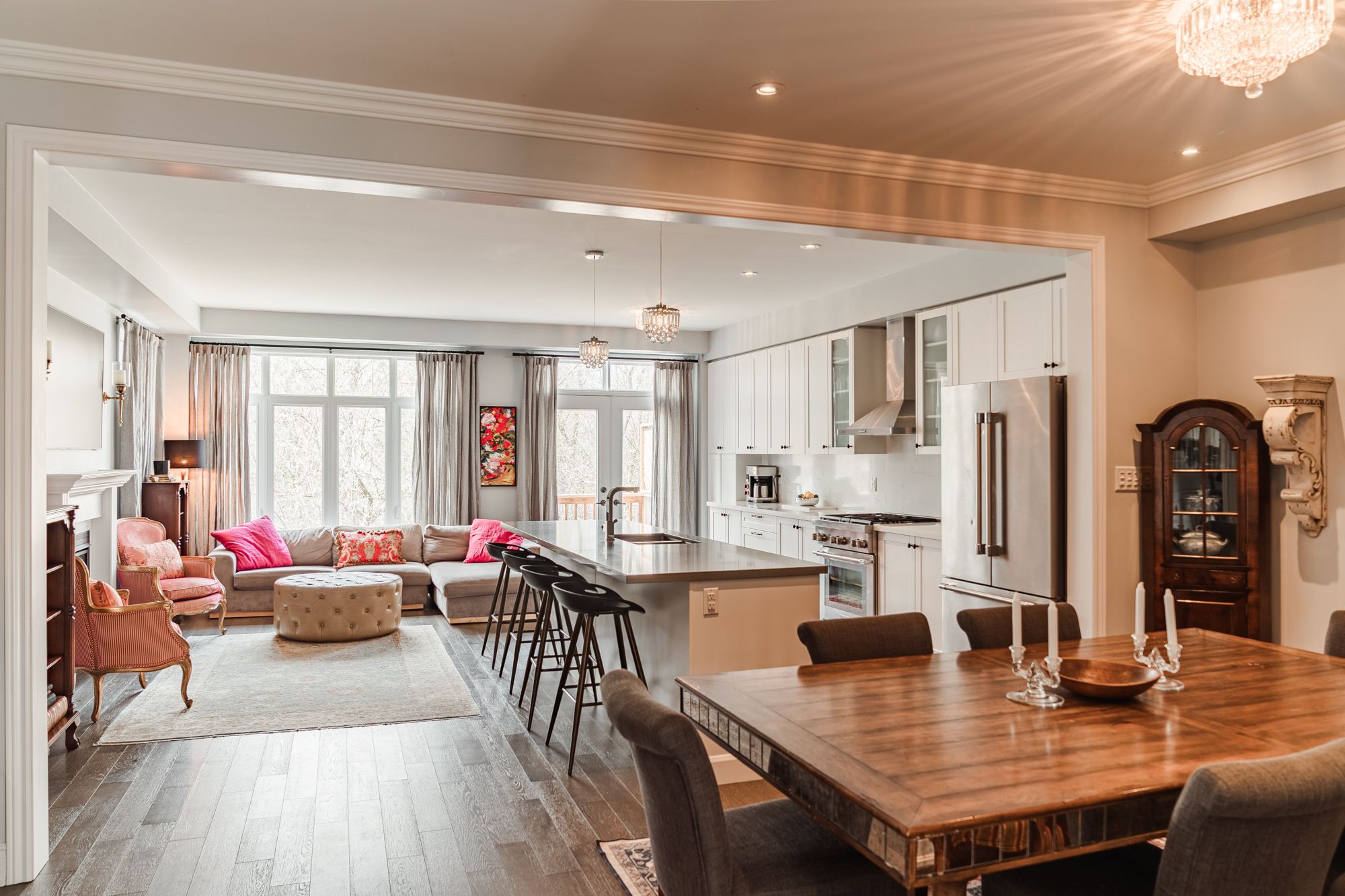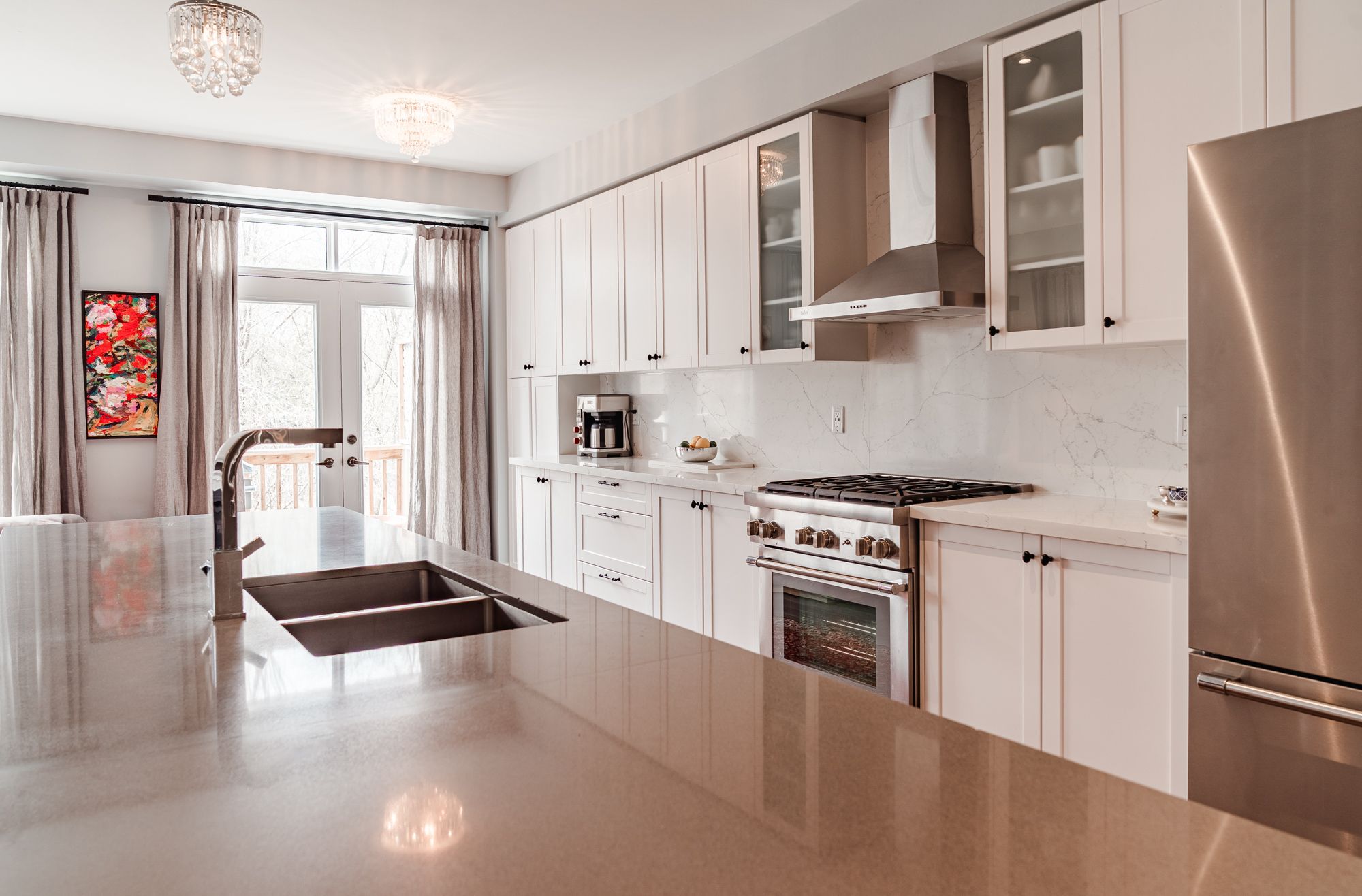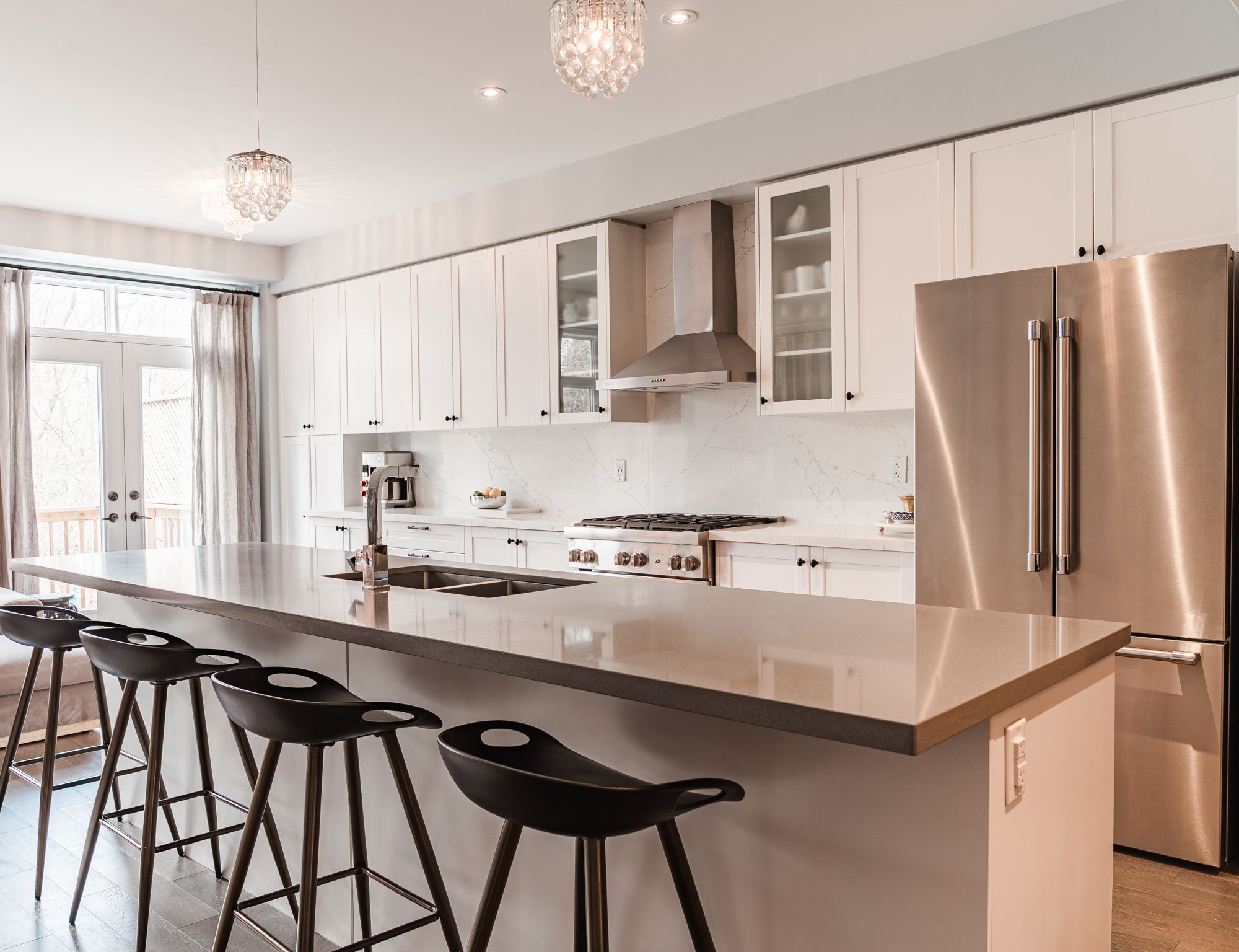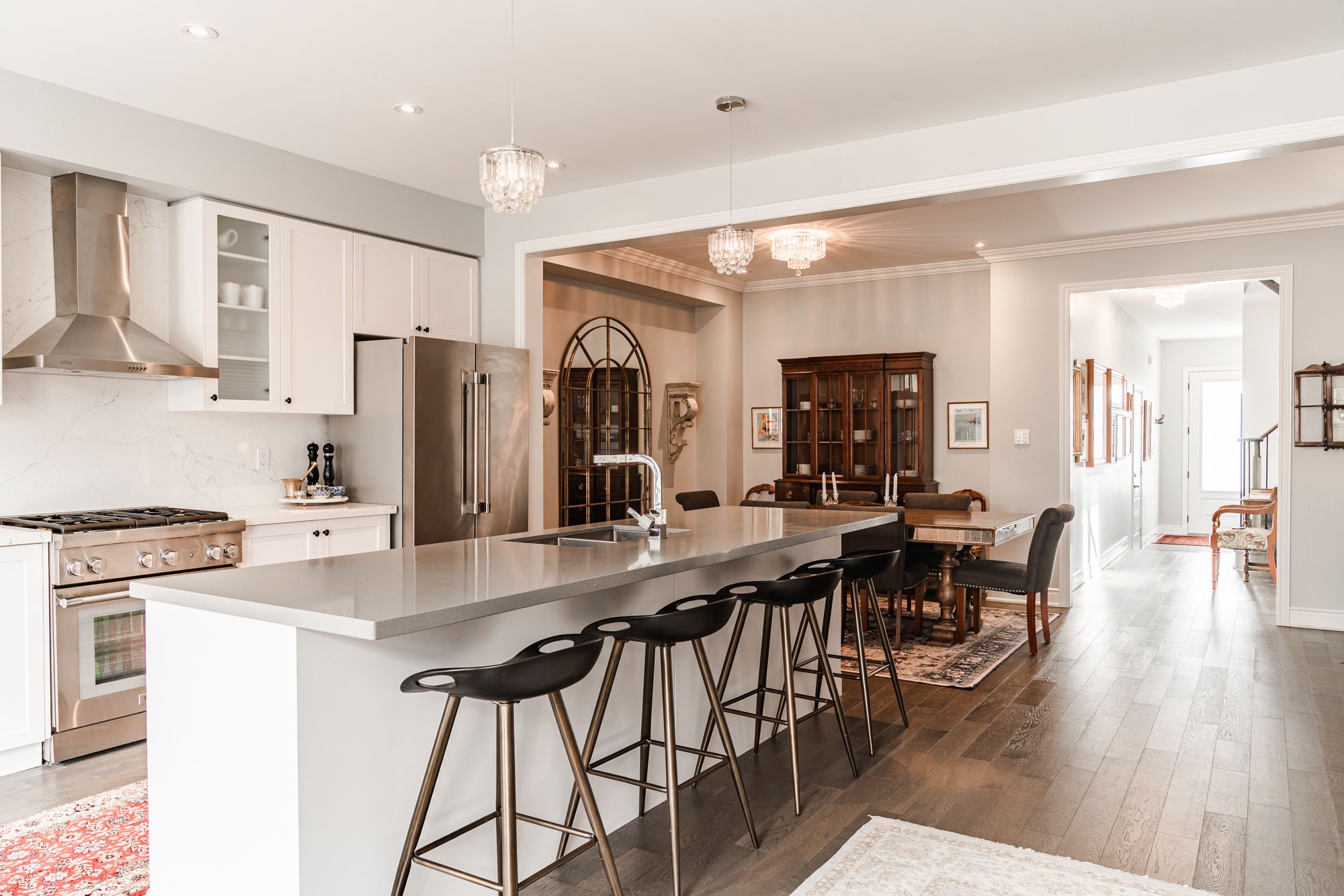 • Modern kitchen features oversized island and high-end appliances.