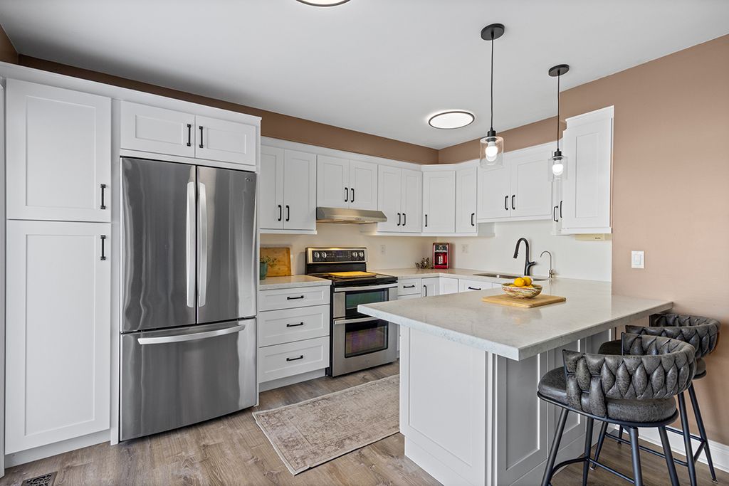 • Renovated kitchen with quartz countertops and stainless steel appliances.