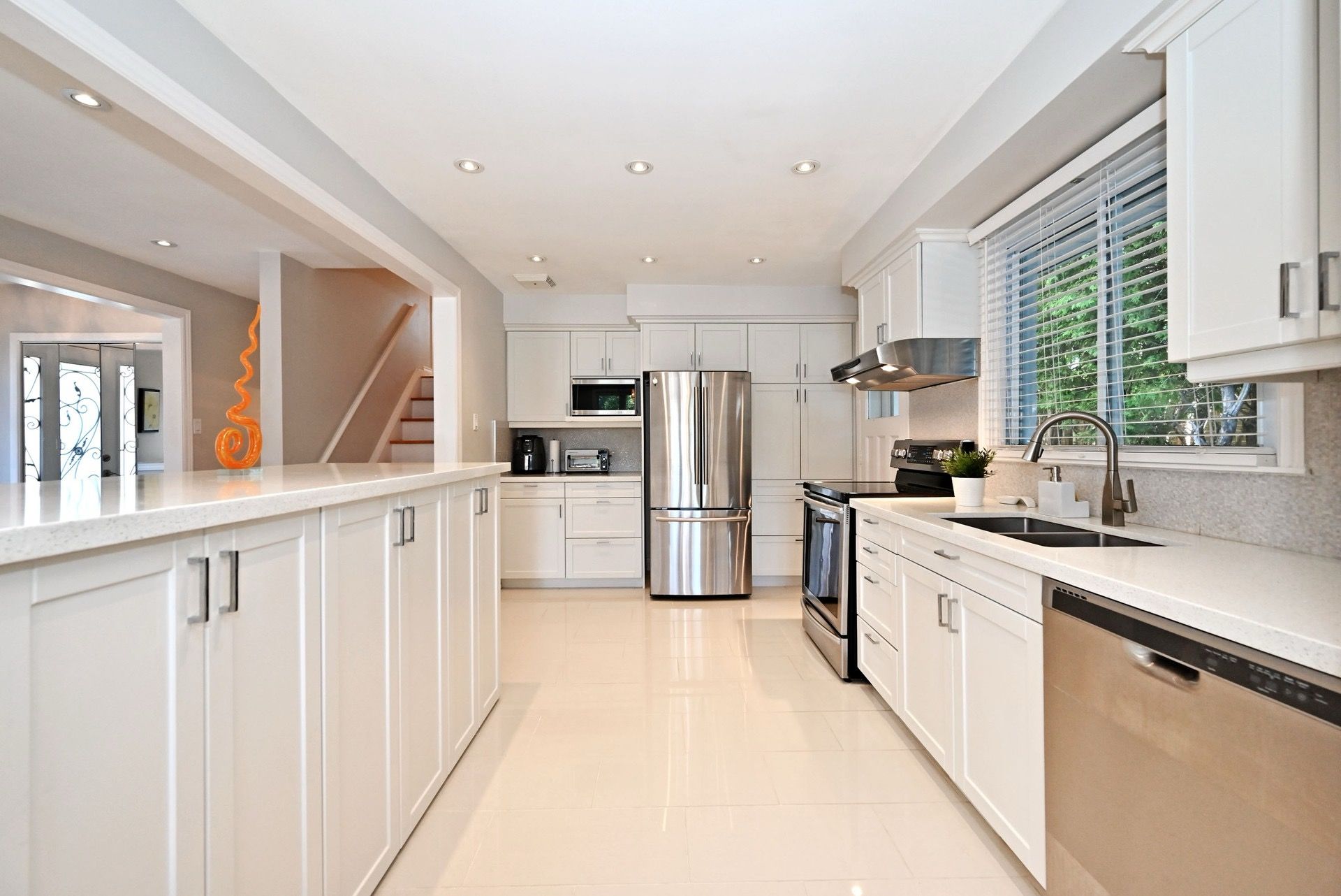 • Open-concept layout with a designer kitchen featuring quartz counters.