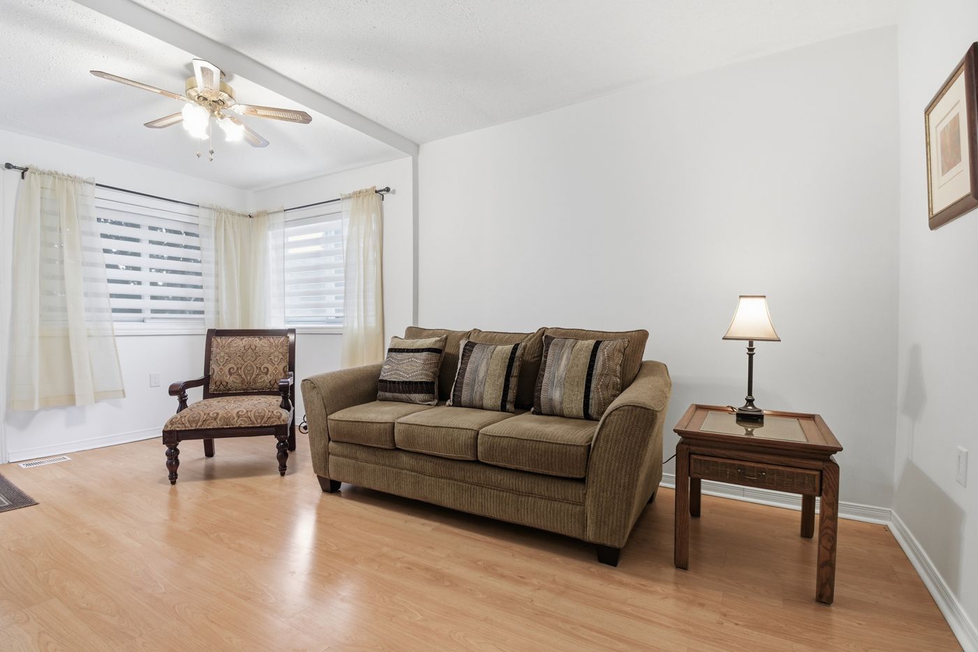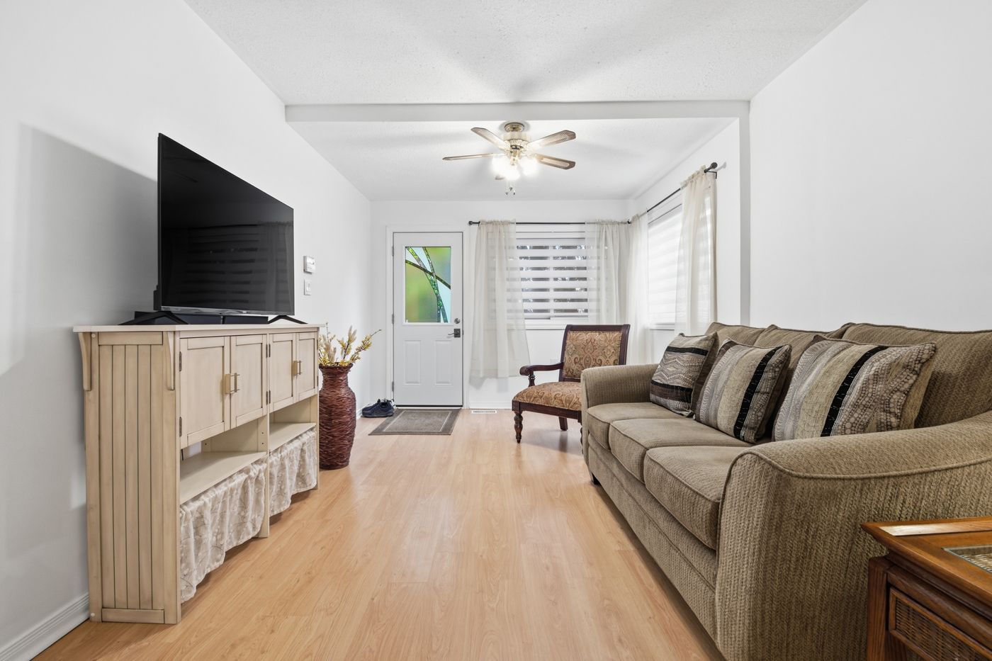 • Open concept living room with light wood-style flooring and cozy ceiling fan.