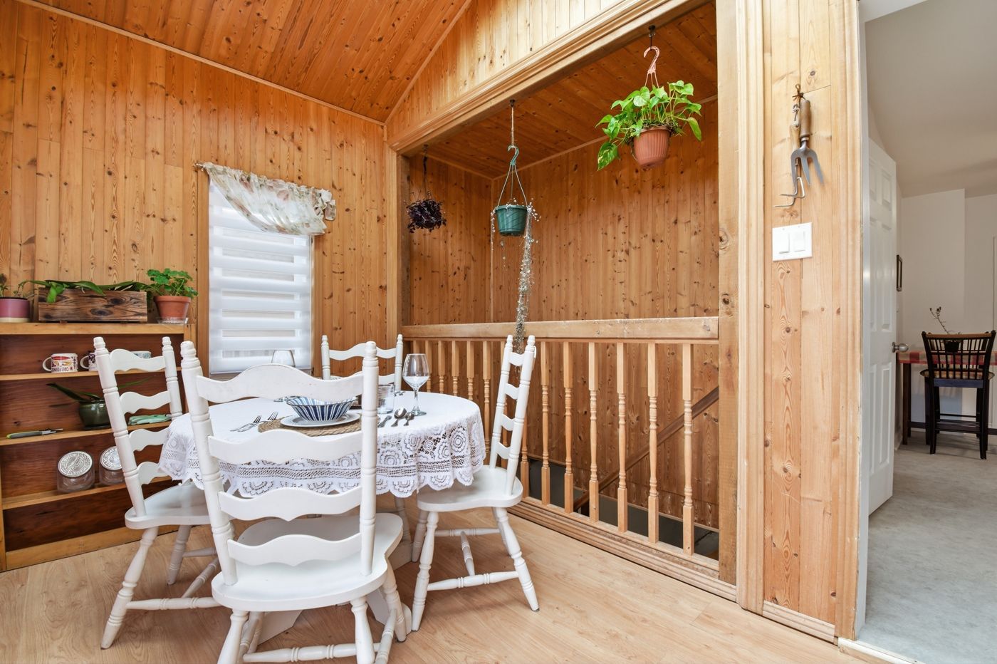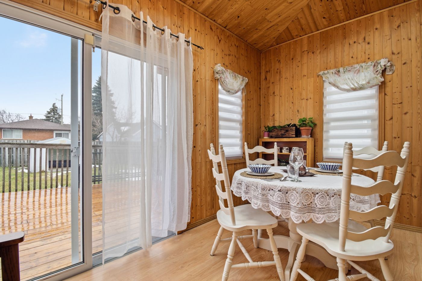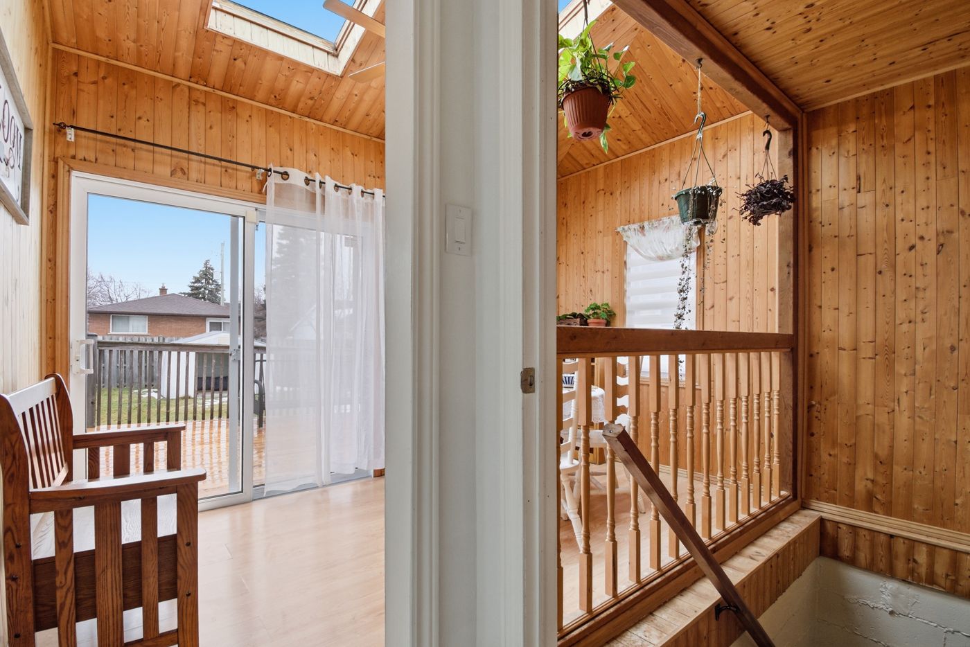 • Cozy sunroom with vaulted ceilings, skylights, and access to the backyard.