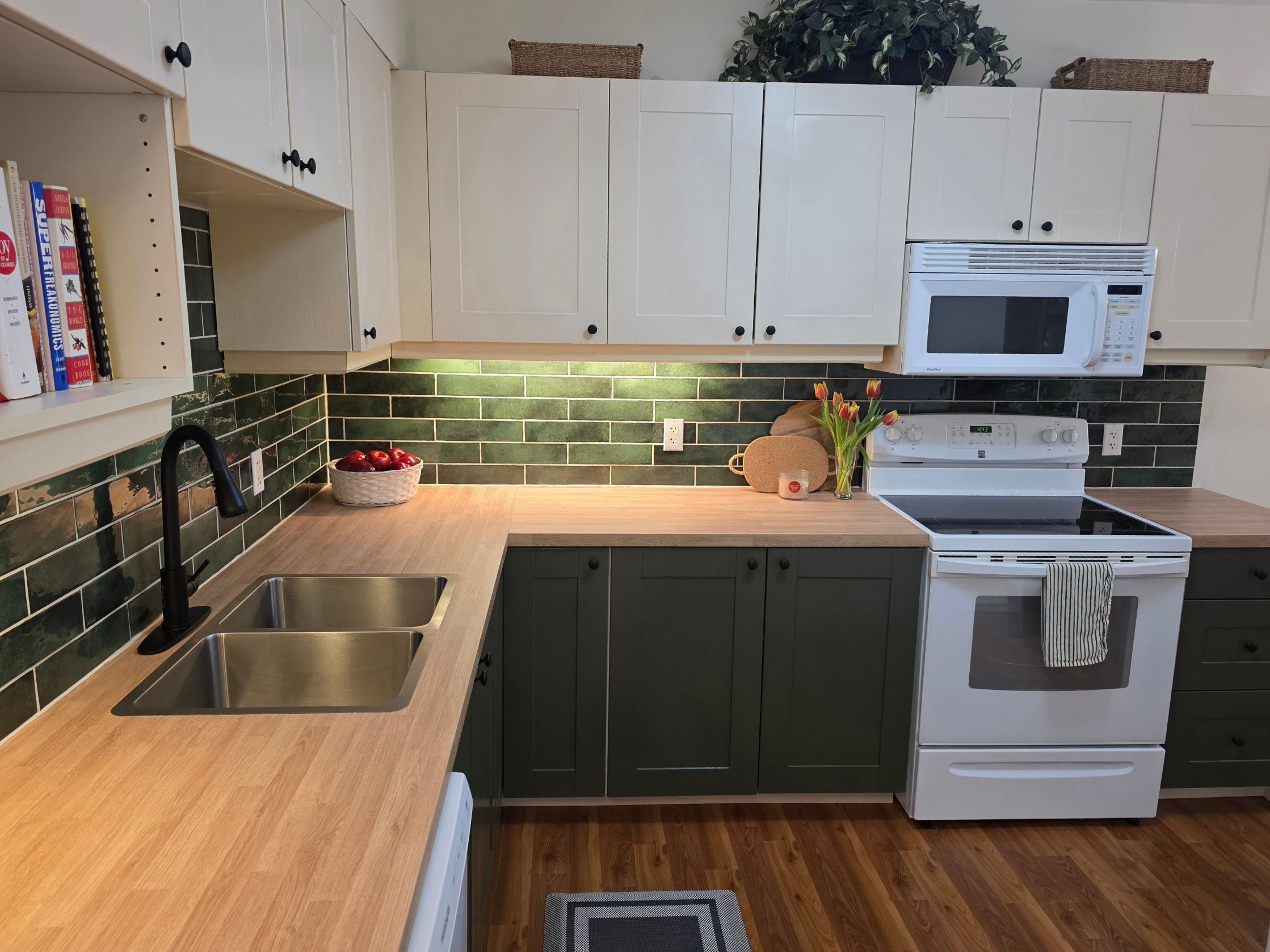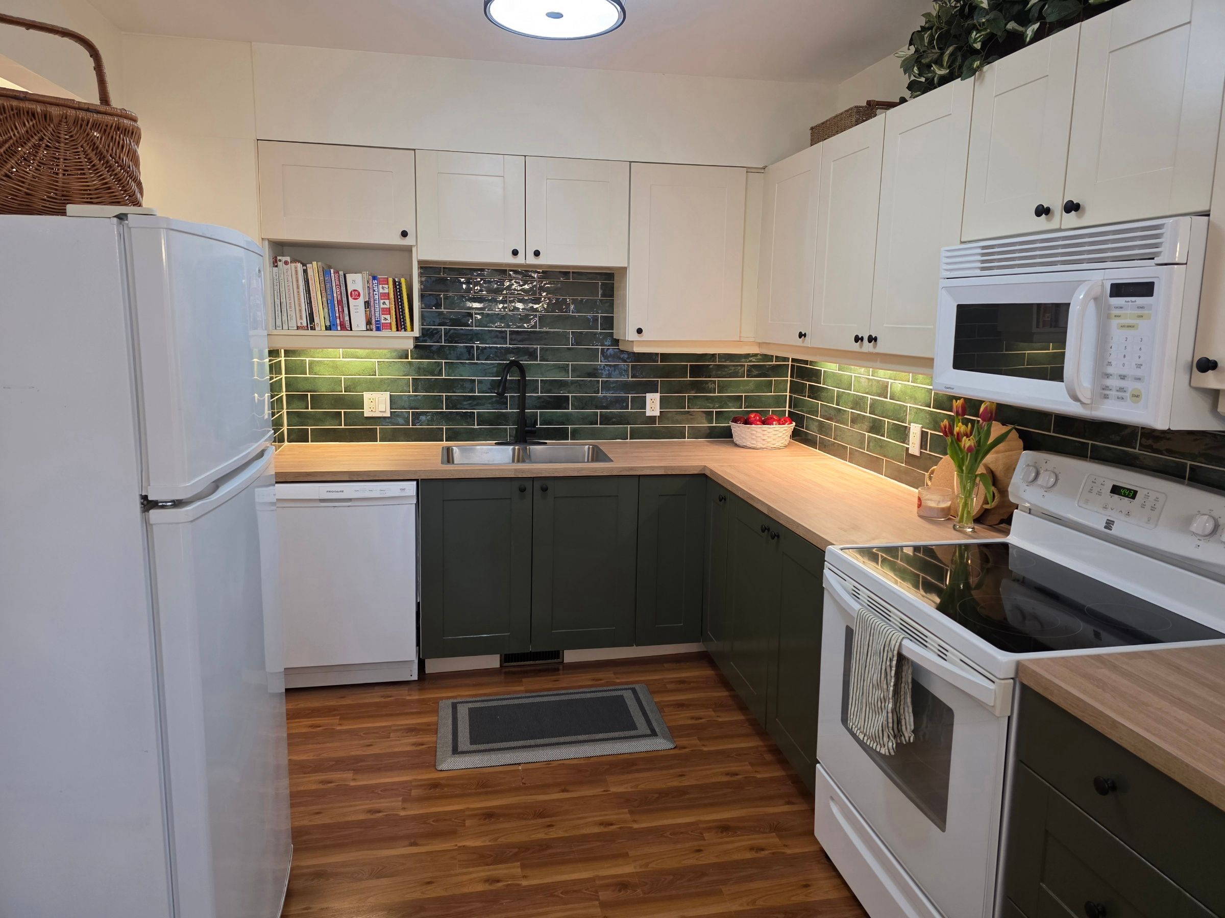 • Modern kitchen with bright colours and recessed lighting for daily living.