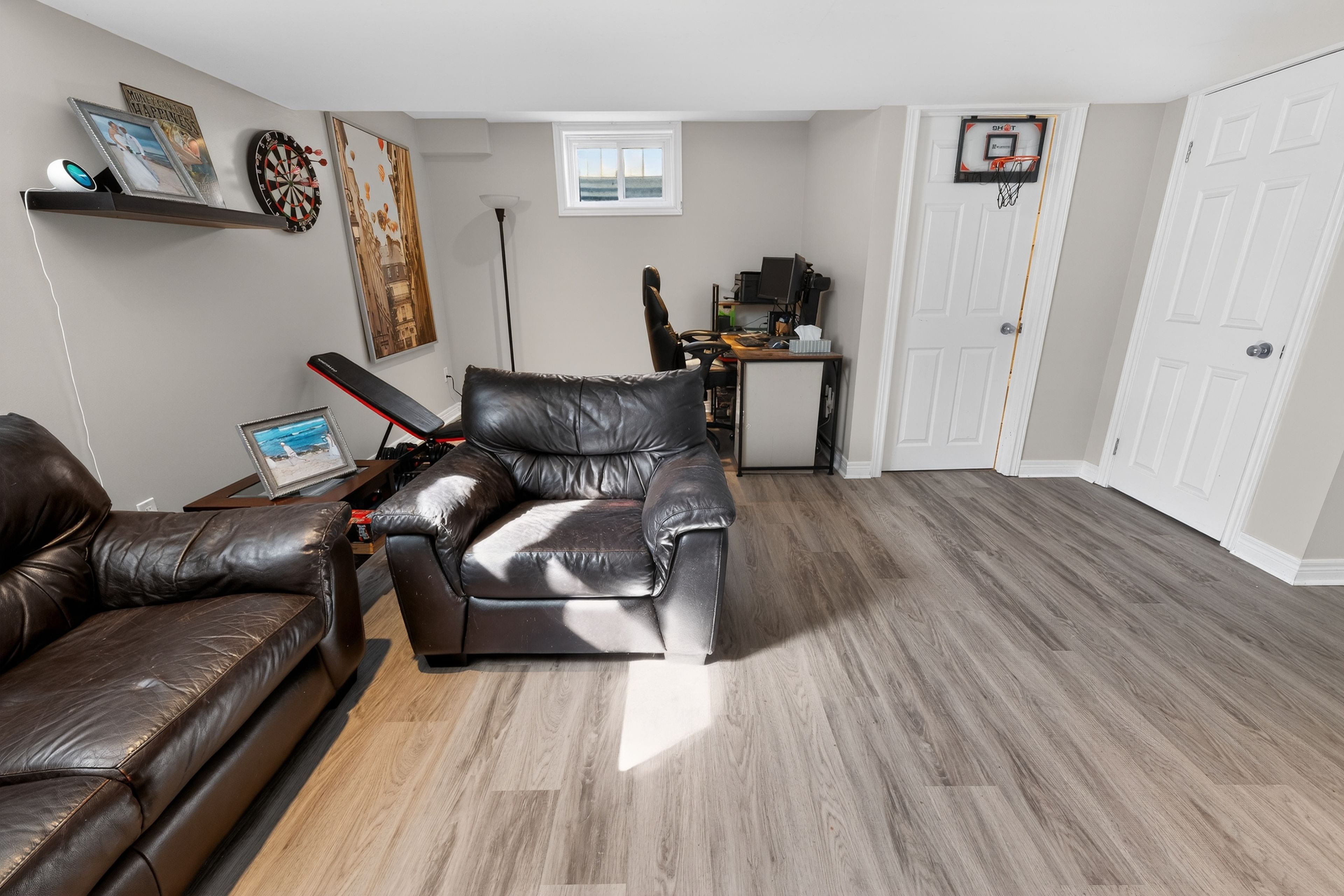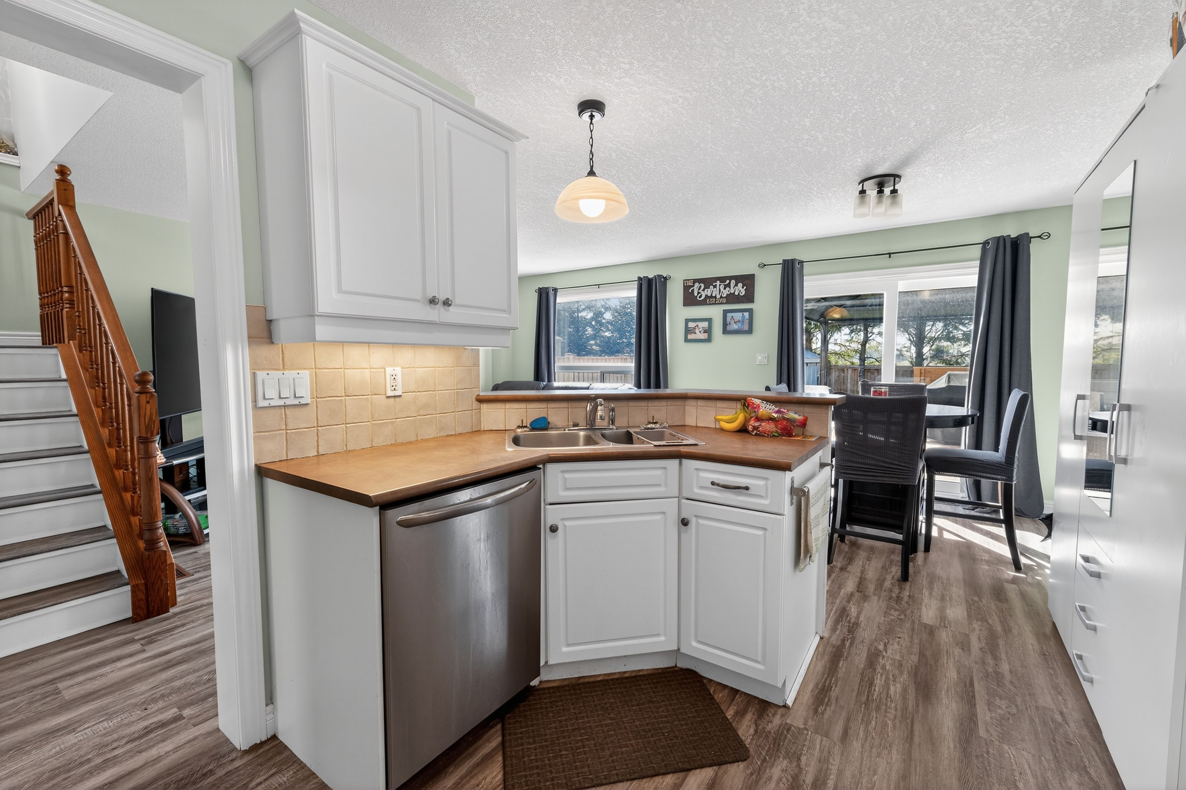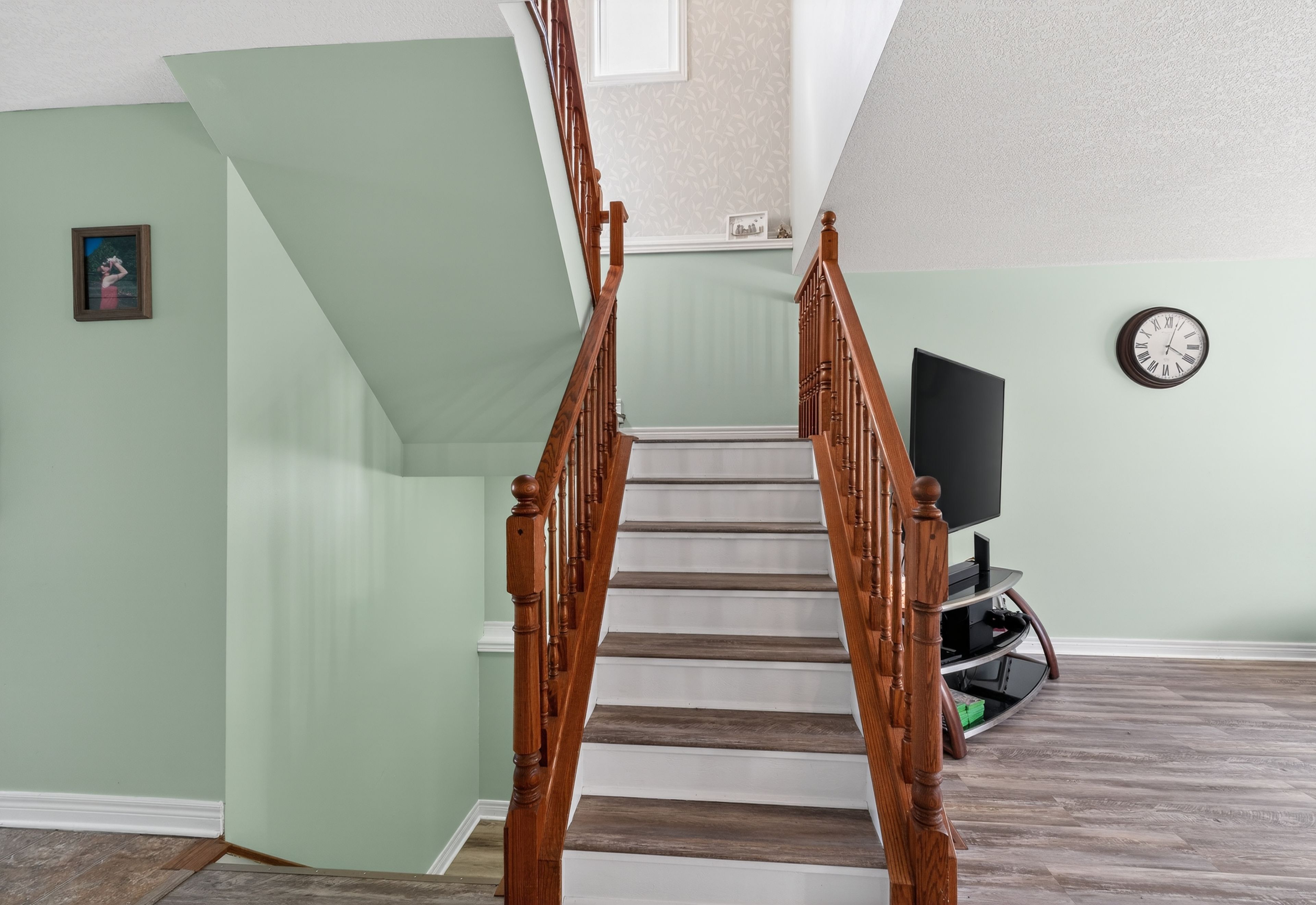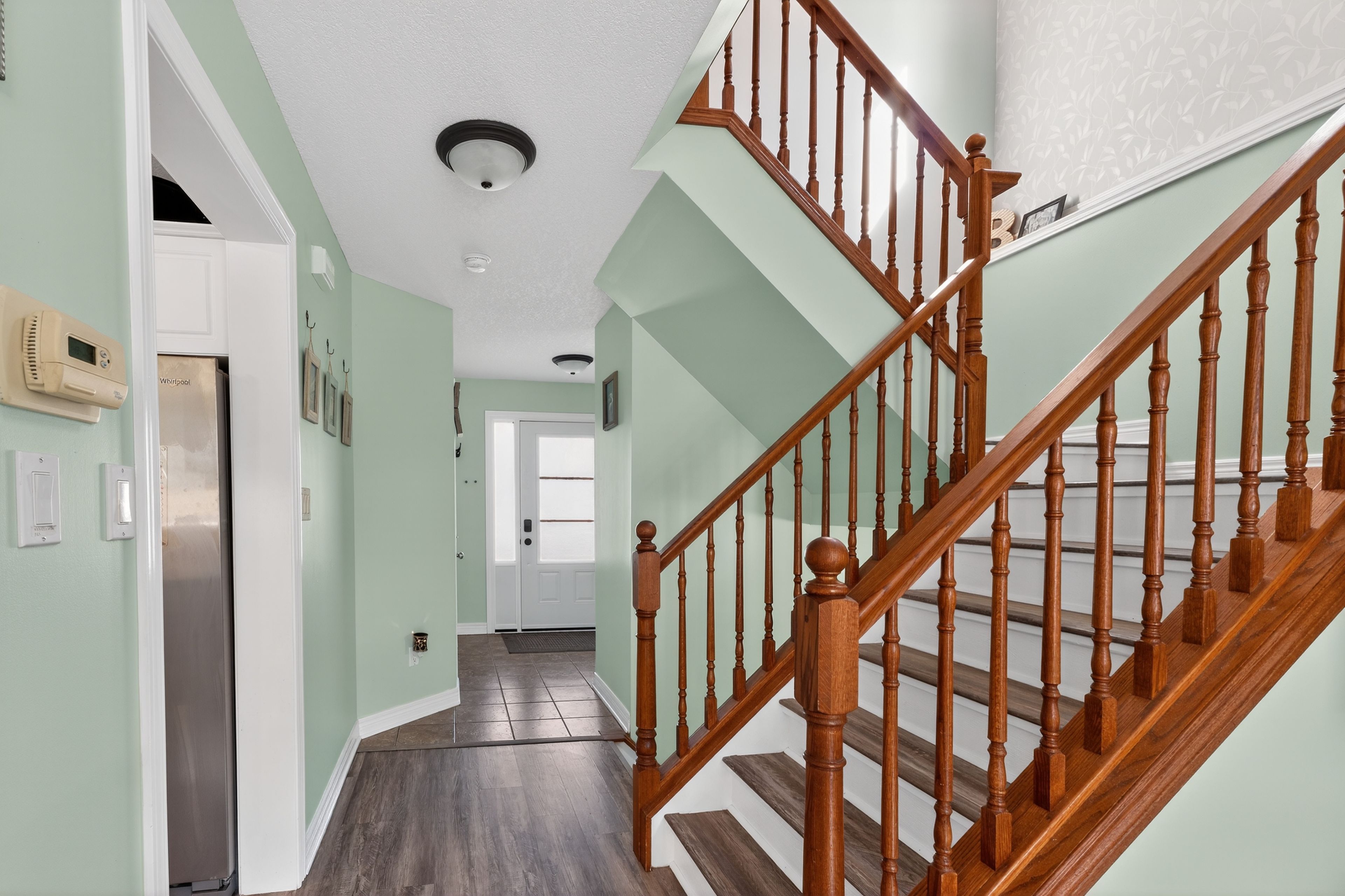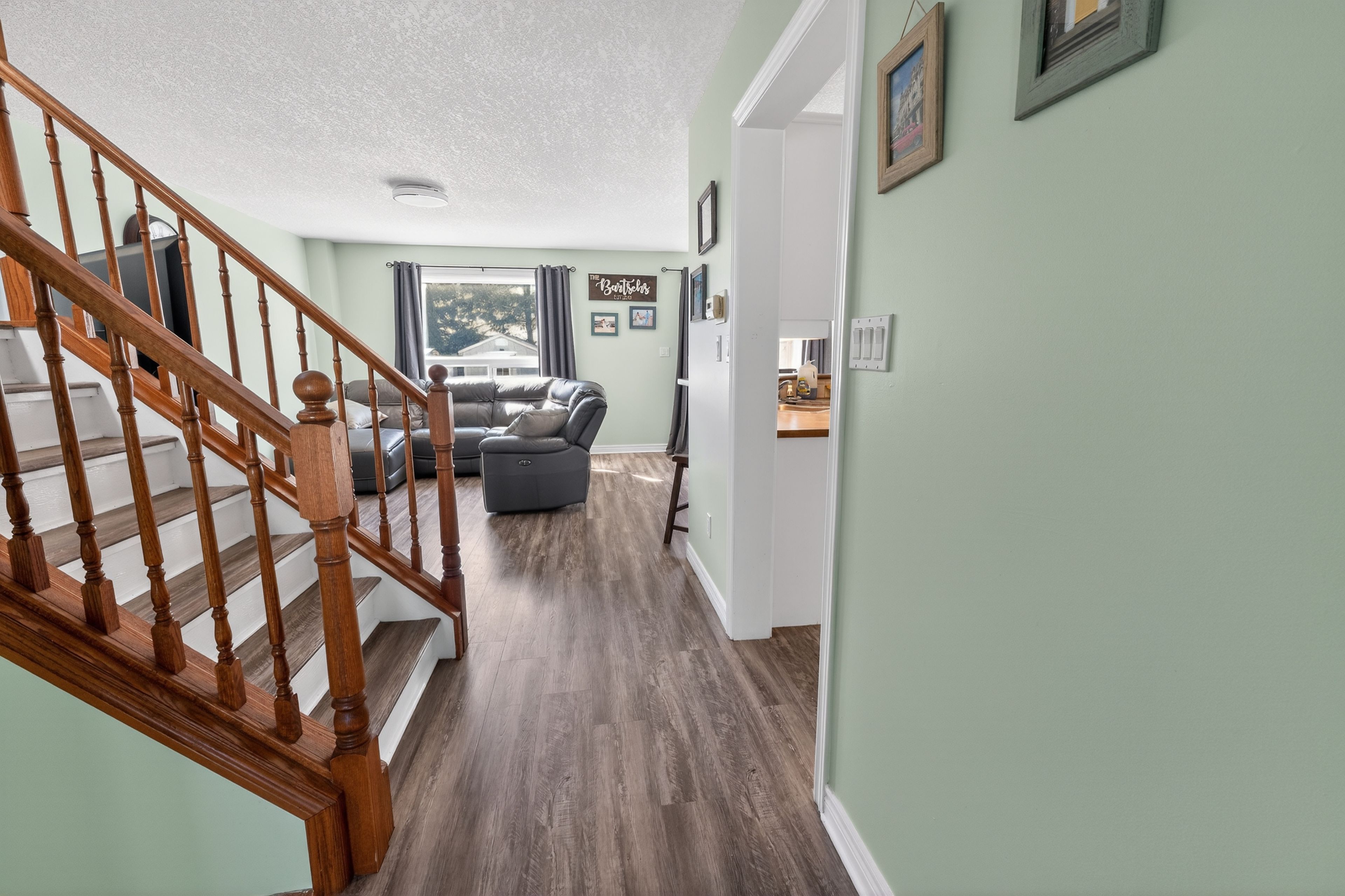 Welcome to this well-maintained 2-storey family home ideally located within walking distance to lake margaret and the scenic great trail system that runs throughout the city. The entire family can hike, kayak, canoe and fish in the summer and enjoy ice staking in the winter and enjoy the fireworks from pinafore park from your own back yard.. The main floor offers a bright and spacious layout featuring a large living room, functional kitchen, and dining area-all designed in an open-concept style that's perfect for everyday living and entertaining. Patio doors off the dining room lead to a recently installed deck, complete with a covered gazebo offering privacy and a great outdoor retreat. The backyard also features an additional patio space and no rear neighbours, providing a peaceful setting. Upstairs, you'll find three generously sized bedrooms along with a well-appointed 4-piece bathroom, ideal for growing families. The lower level adds valuable living space with a cozy family room, a 2-piece bathroom with plumbing already roughed-in for a future shower, and the potential to create a fourth bedroom if desired. Recent updates include new windows throughout and patio door (2025), new front door (2026), shingles (2021), and central air (2023), offering peace of mind for years to come. The attached two-car garage has been freshly painted and features added storage shelving, while the driveway provides parking for up to four vehicles. An ideal family home in a highly sought-after location-close to nature, trails, and all amenities.